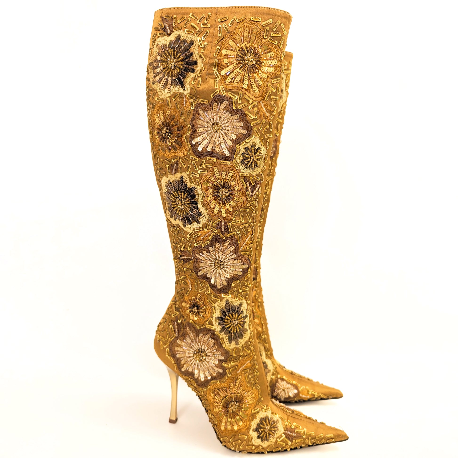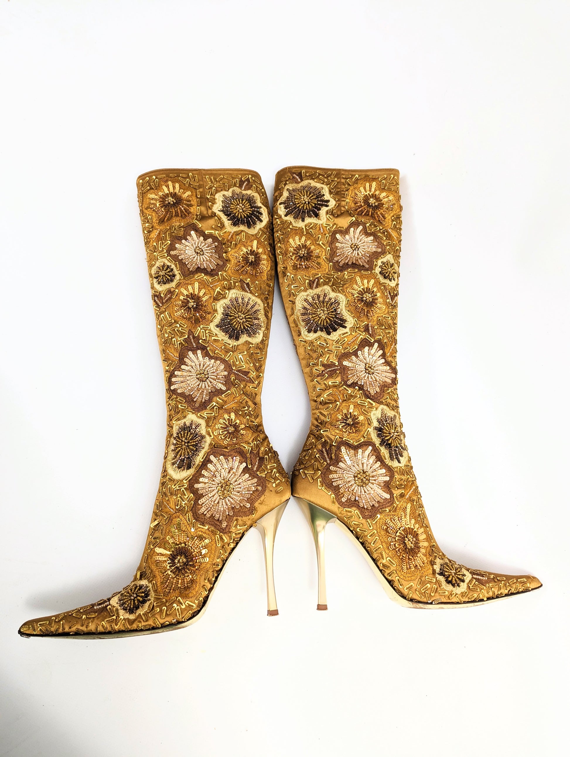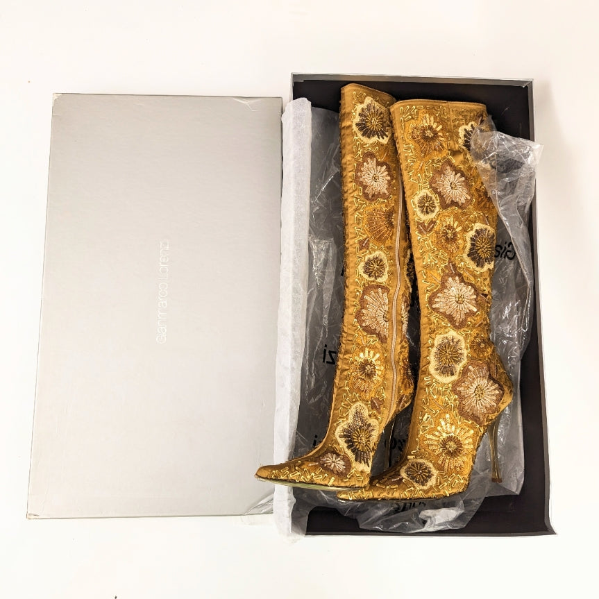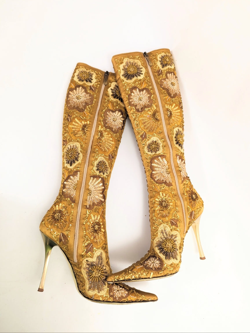 Item: Gianmarco Lorenzi boots in gold fabric embroidered with pearls and black sequins.