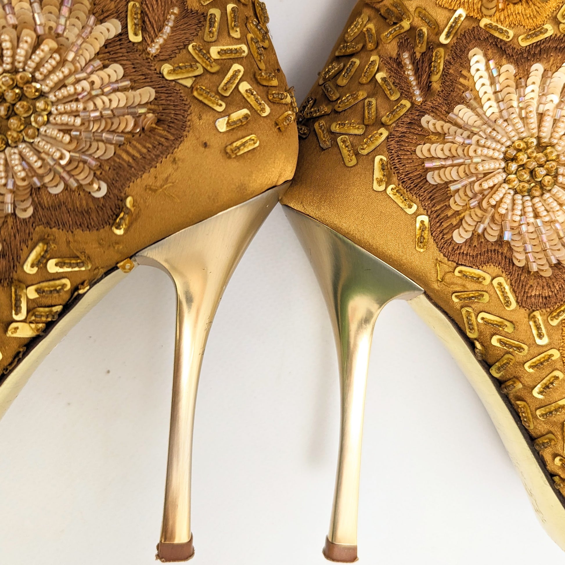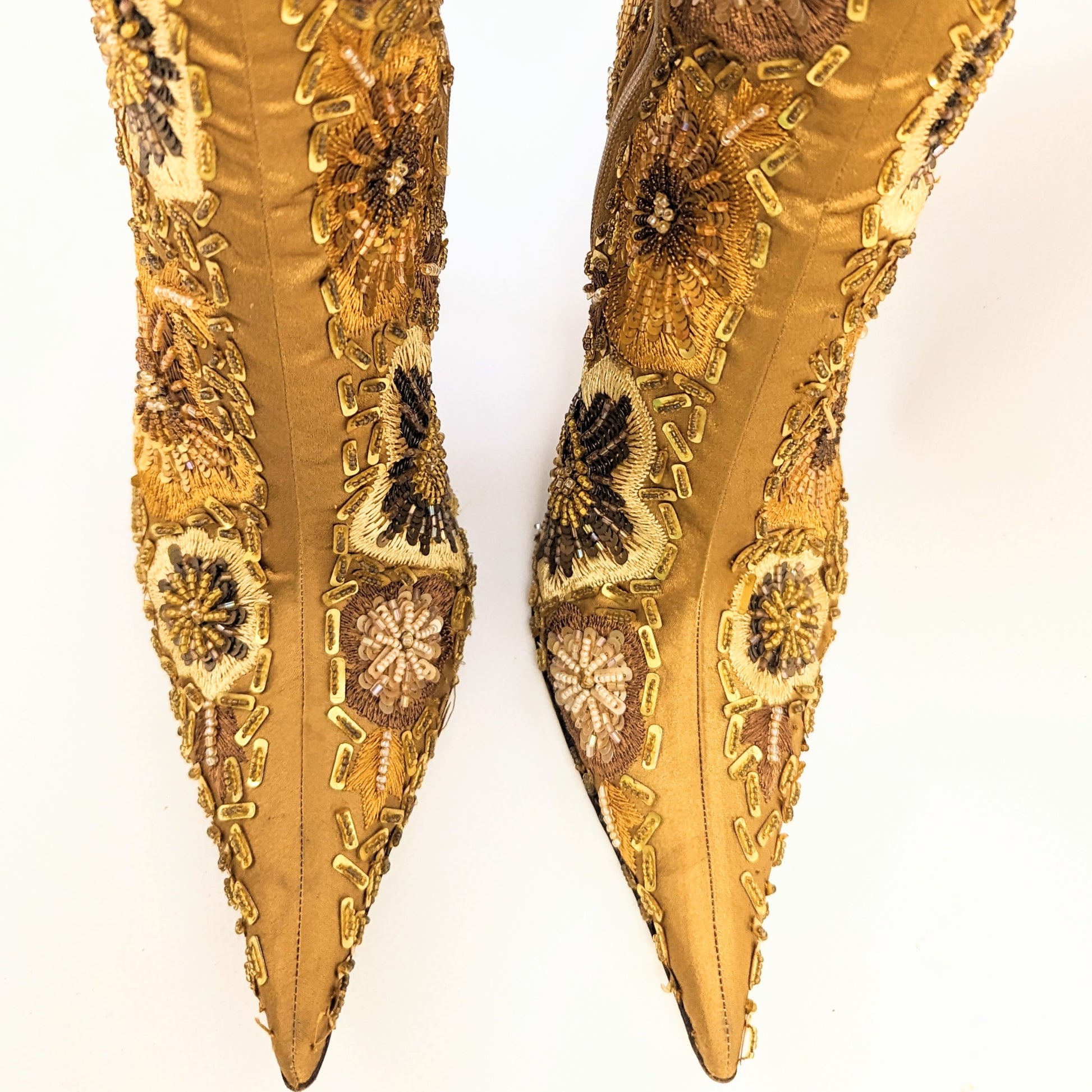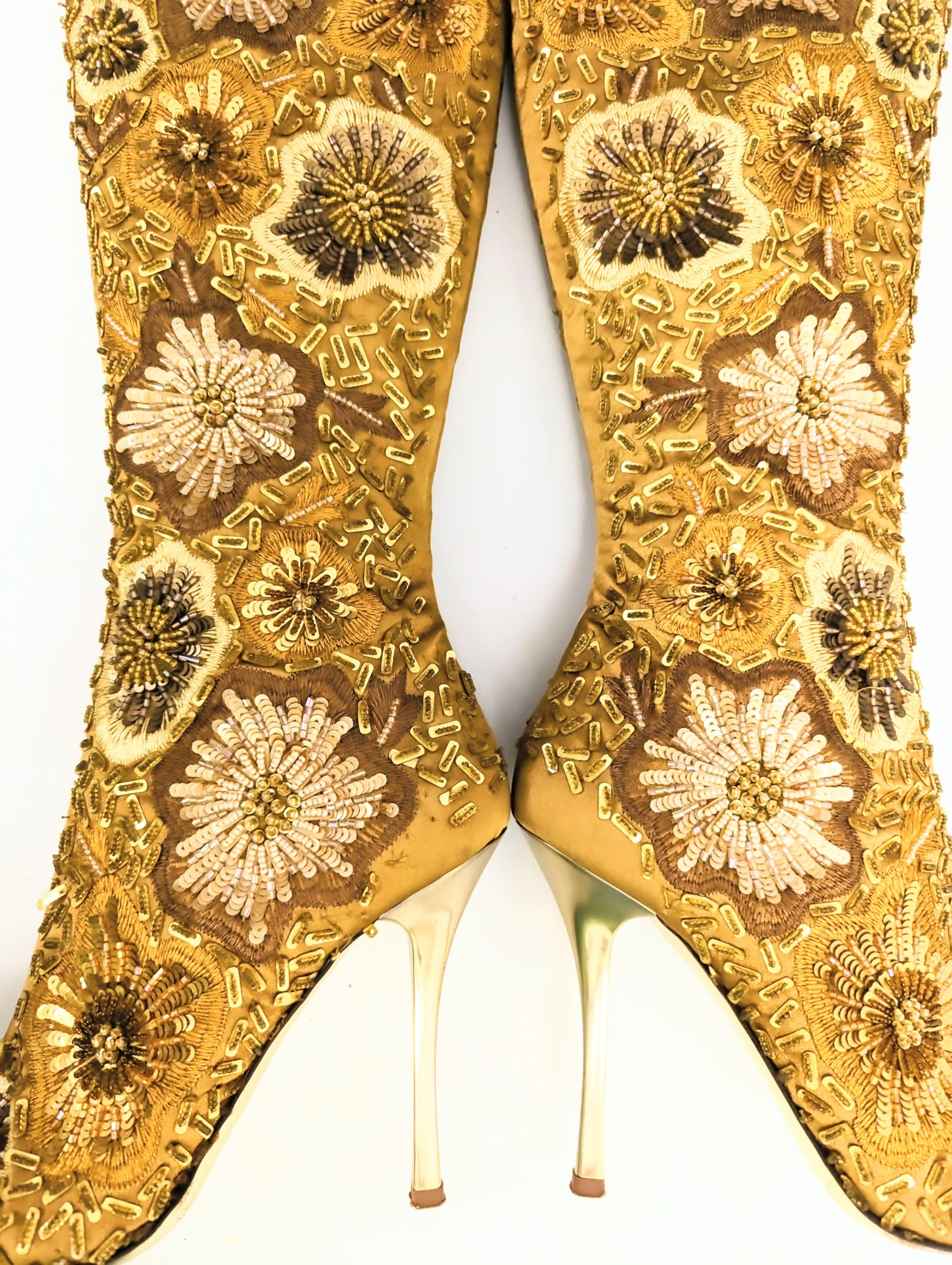 Item: Gianmarco Lorenzi boots in gold fabric embroidered with pearls and black sequins.