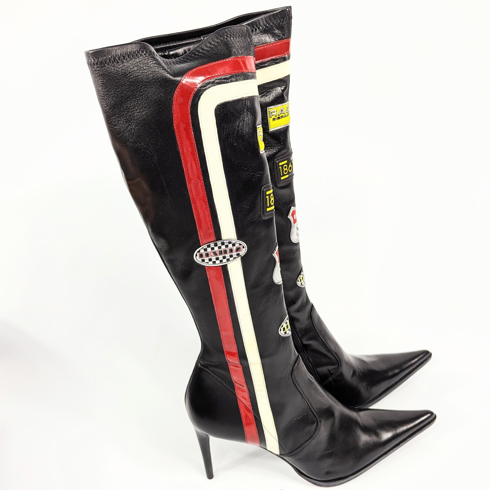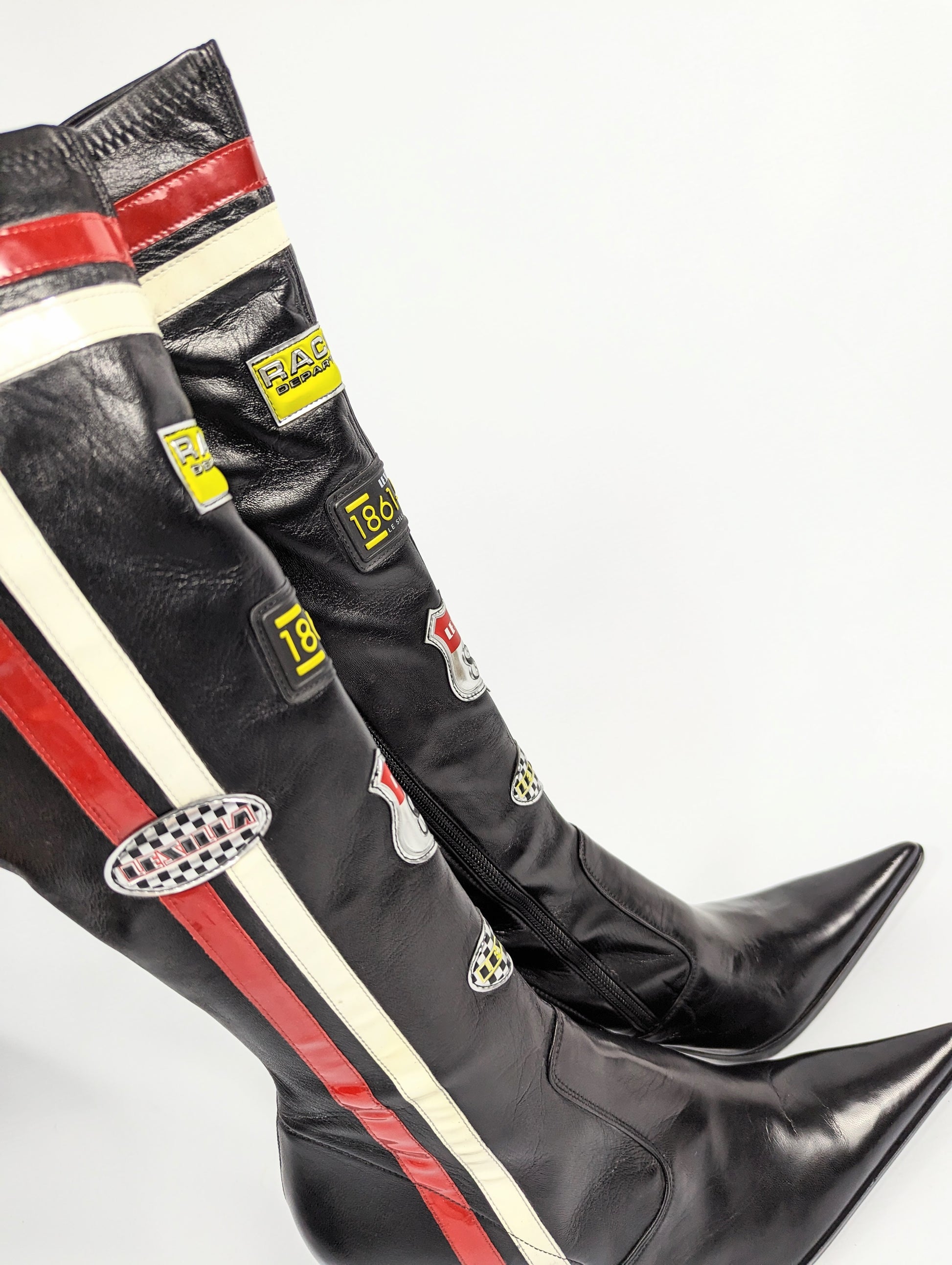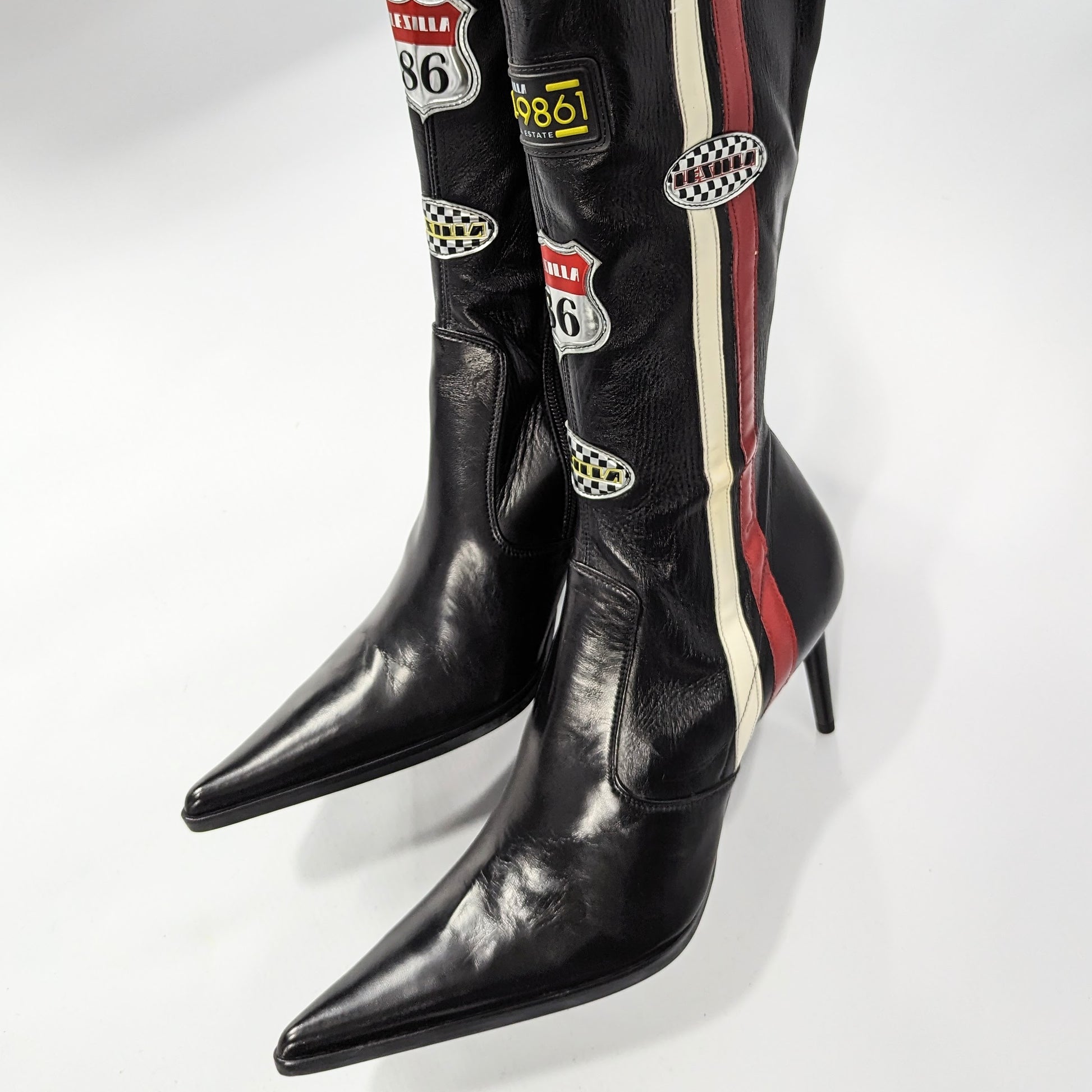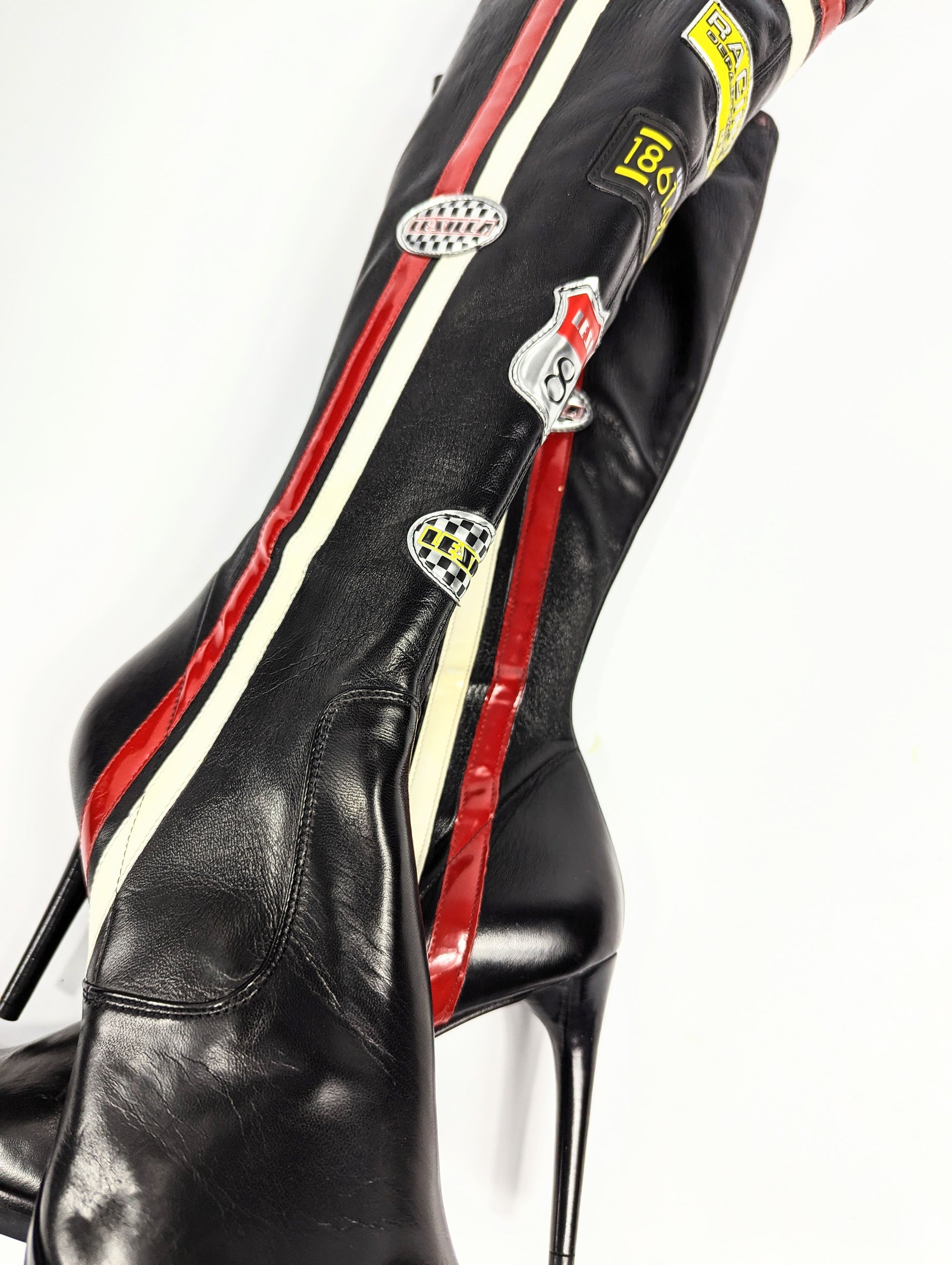 Item: Le silla heeled boots in black leather decorated with racing style inserts with inside zip fastening