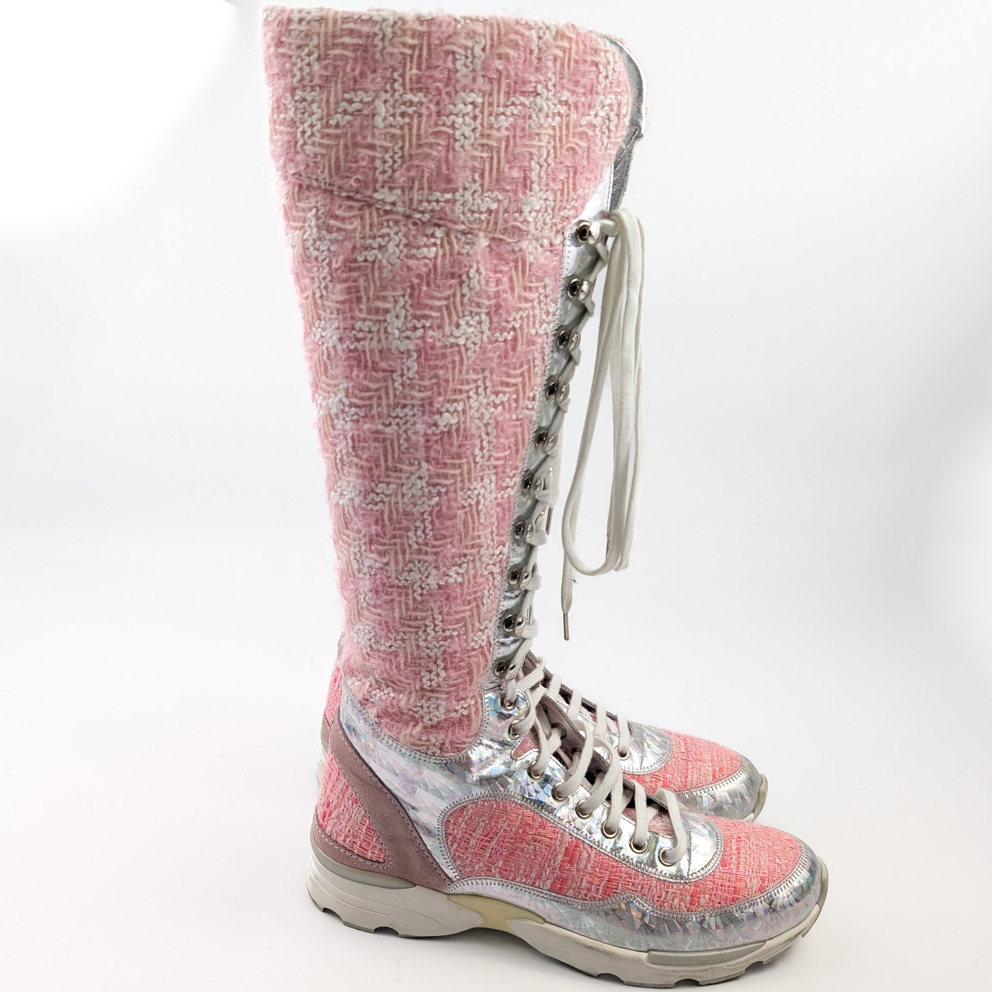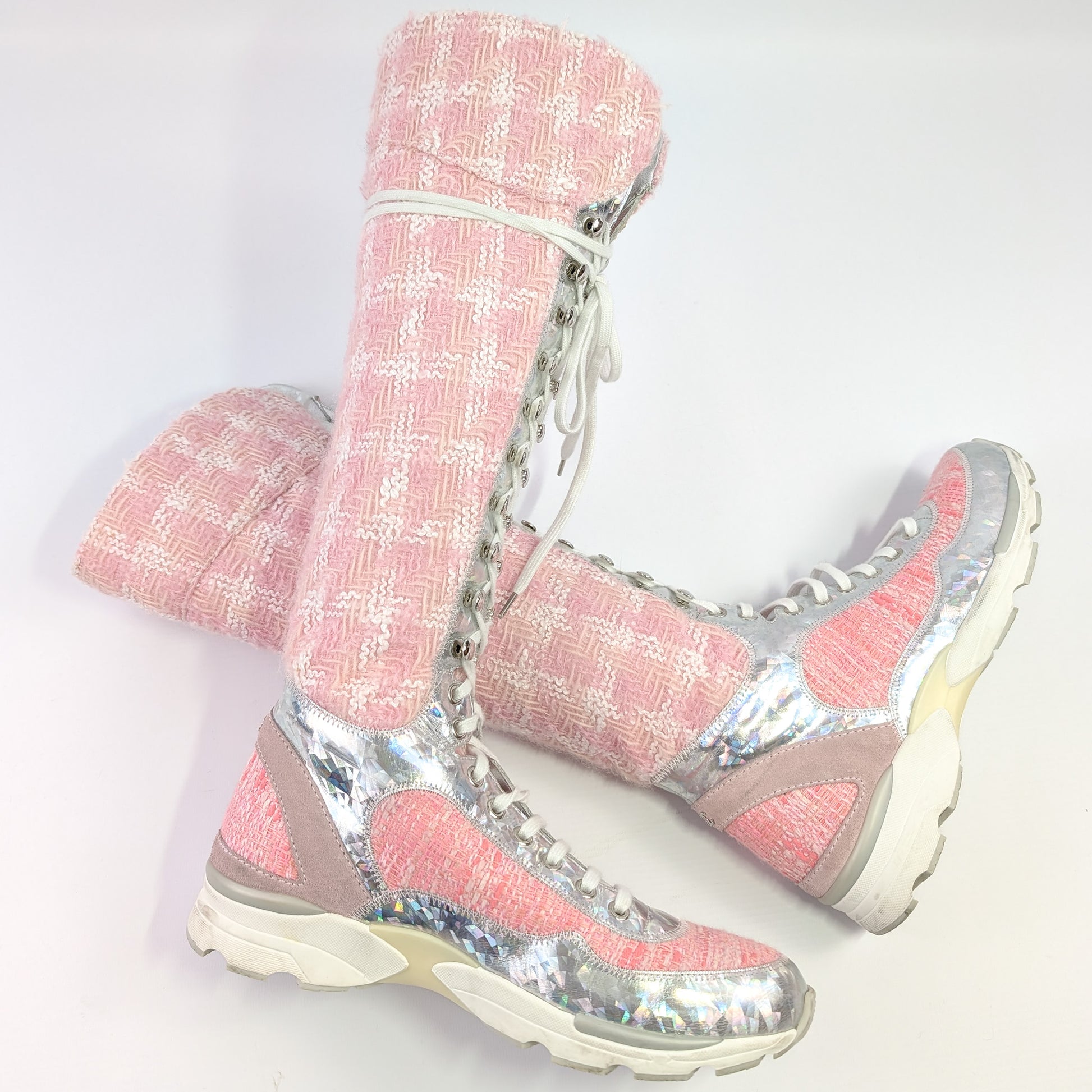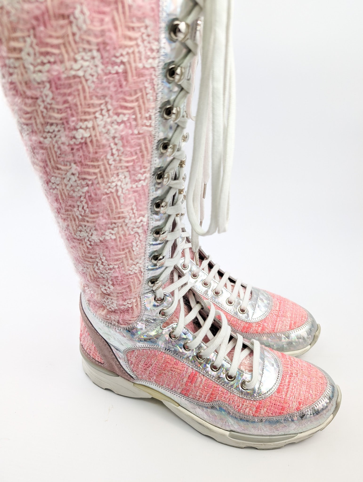 Item: Pink tweed sporty sneaker lace-up boots. Worn during the Winter 2014 runway show.