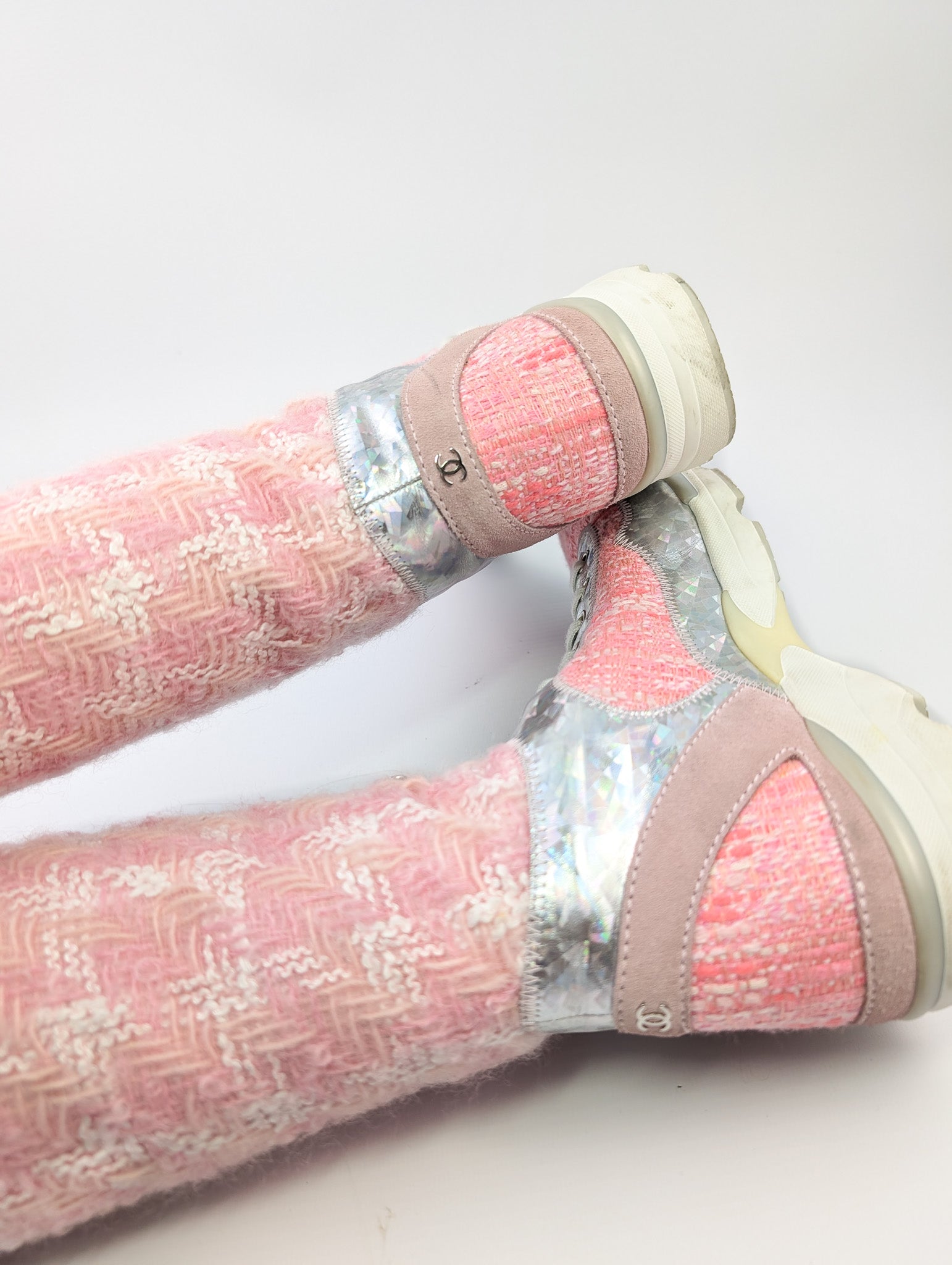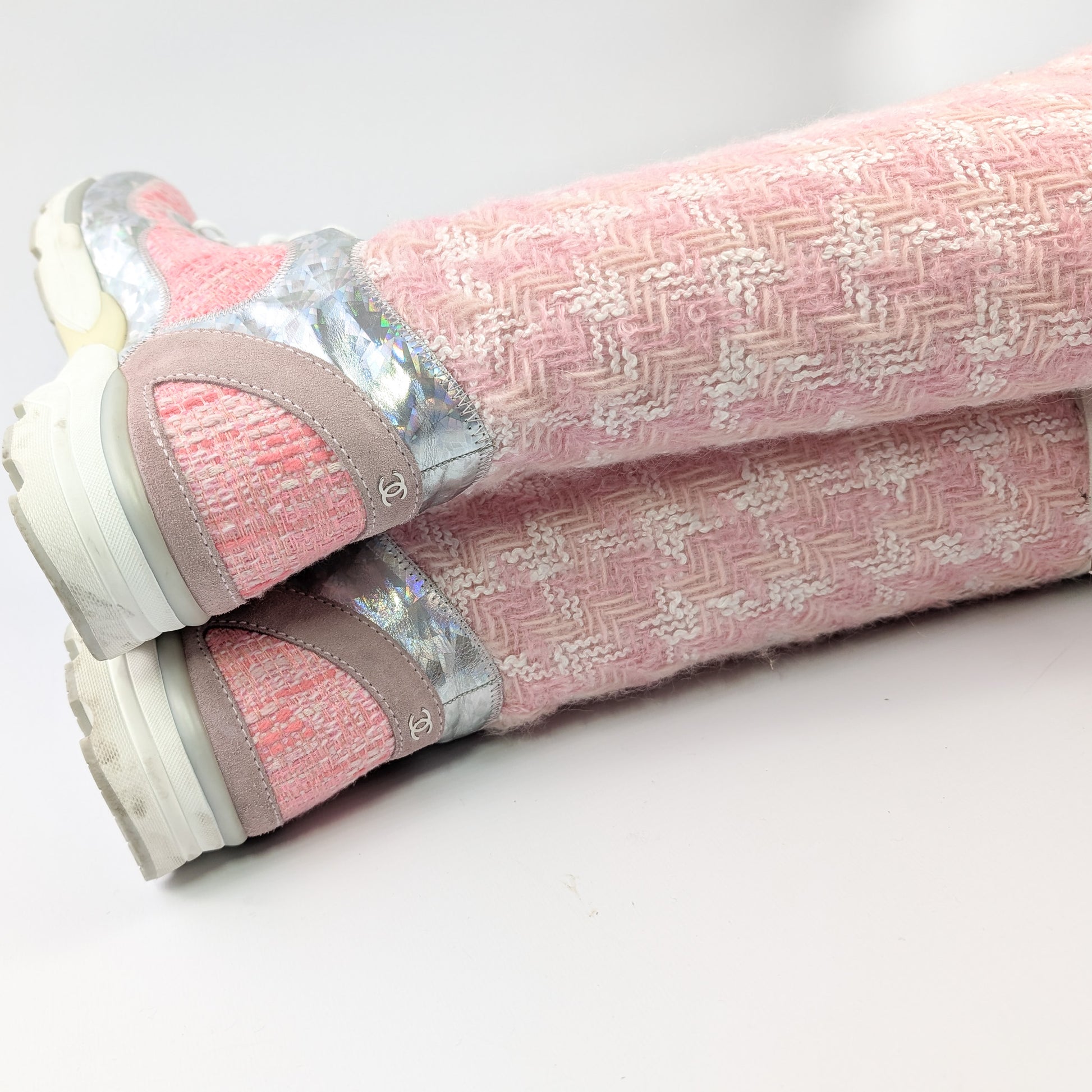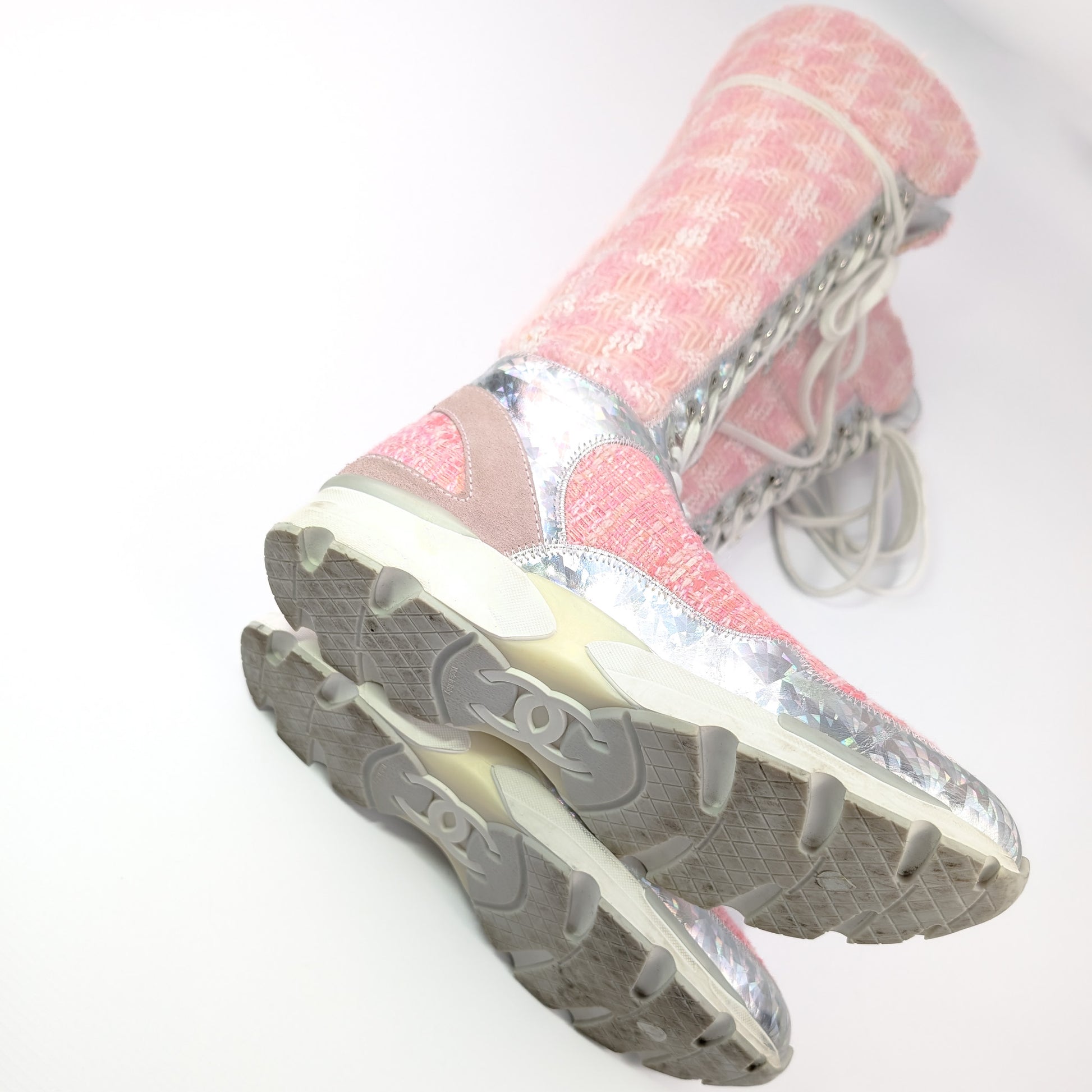 Item: Pink tweed sporty sneaker lace-up boots. Worn during the Winter 2014 runway show.