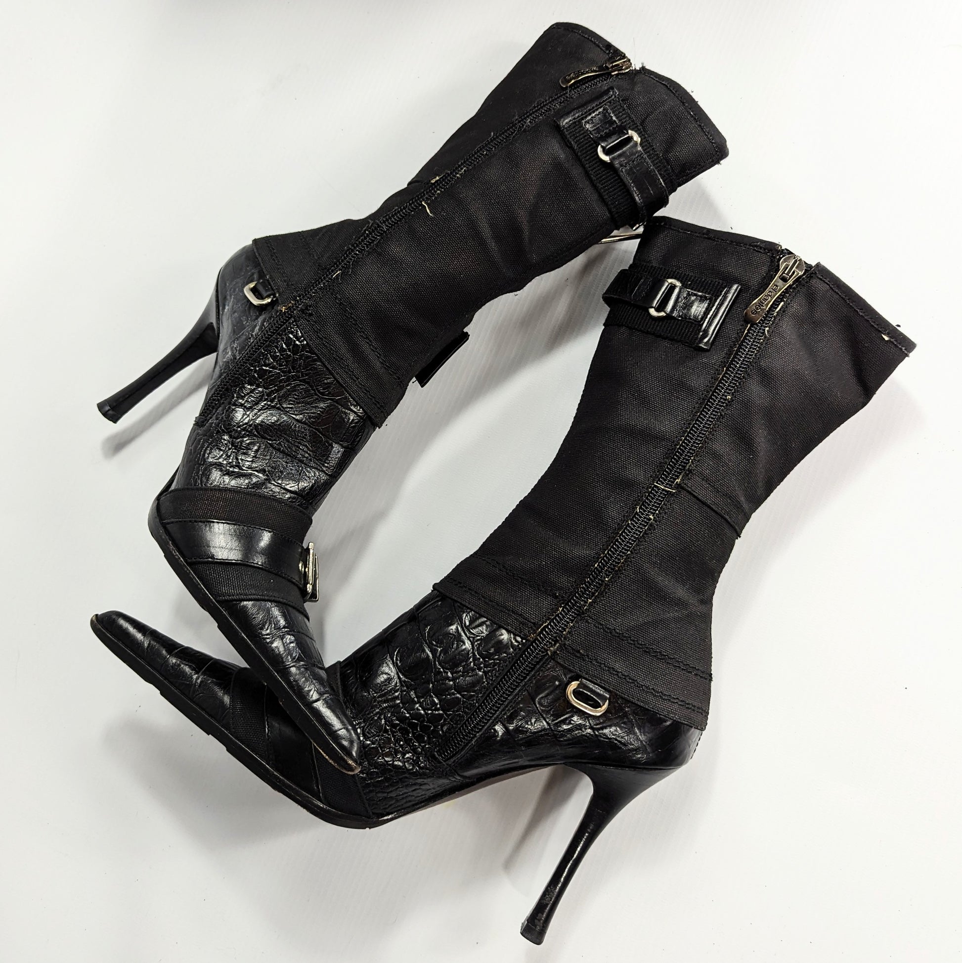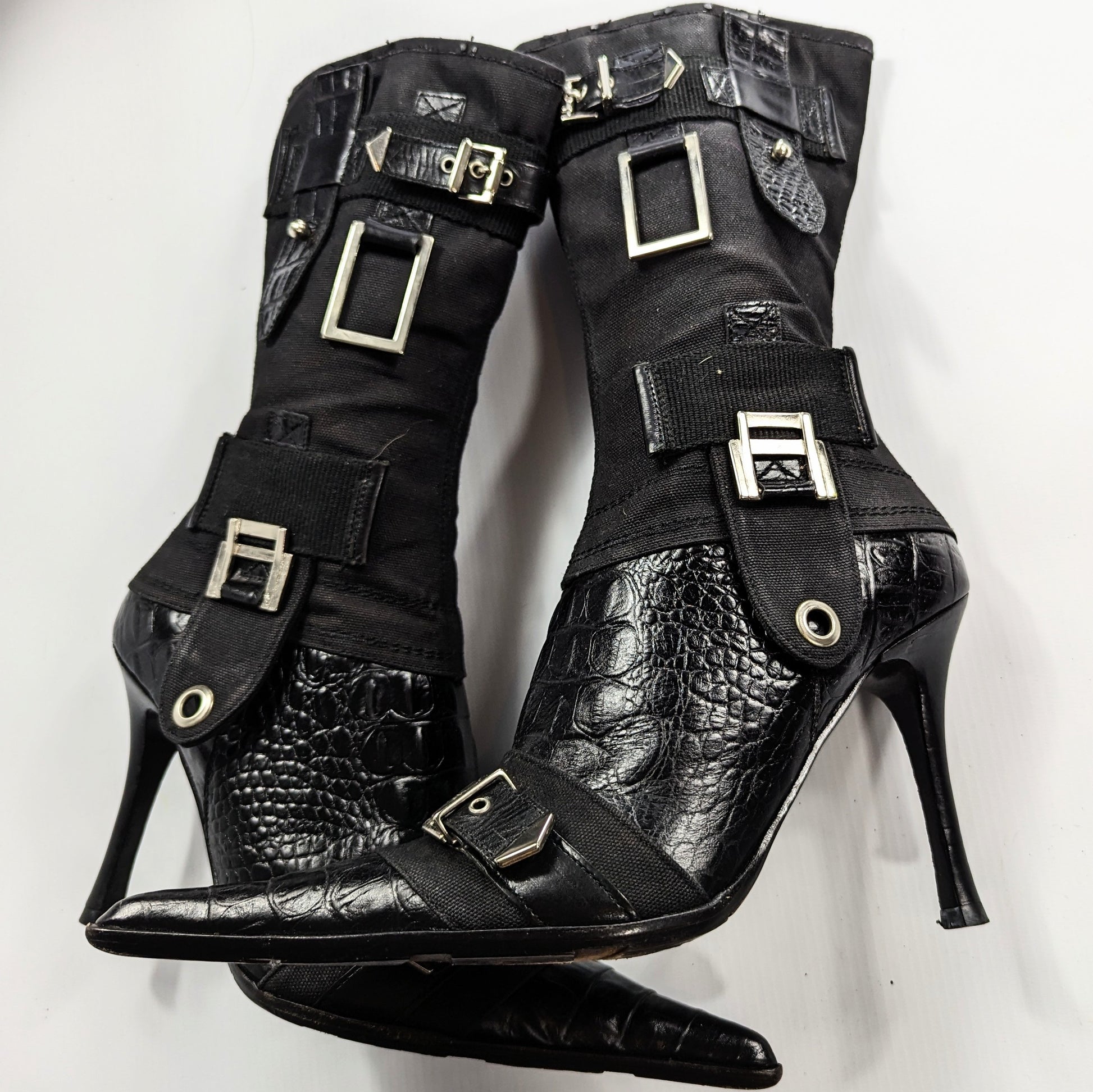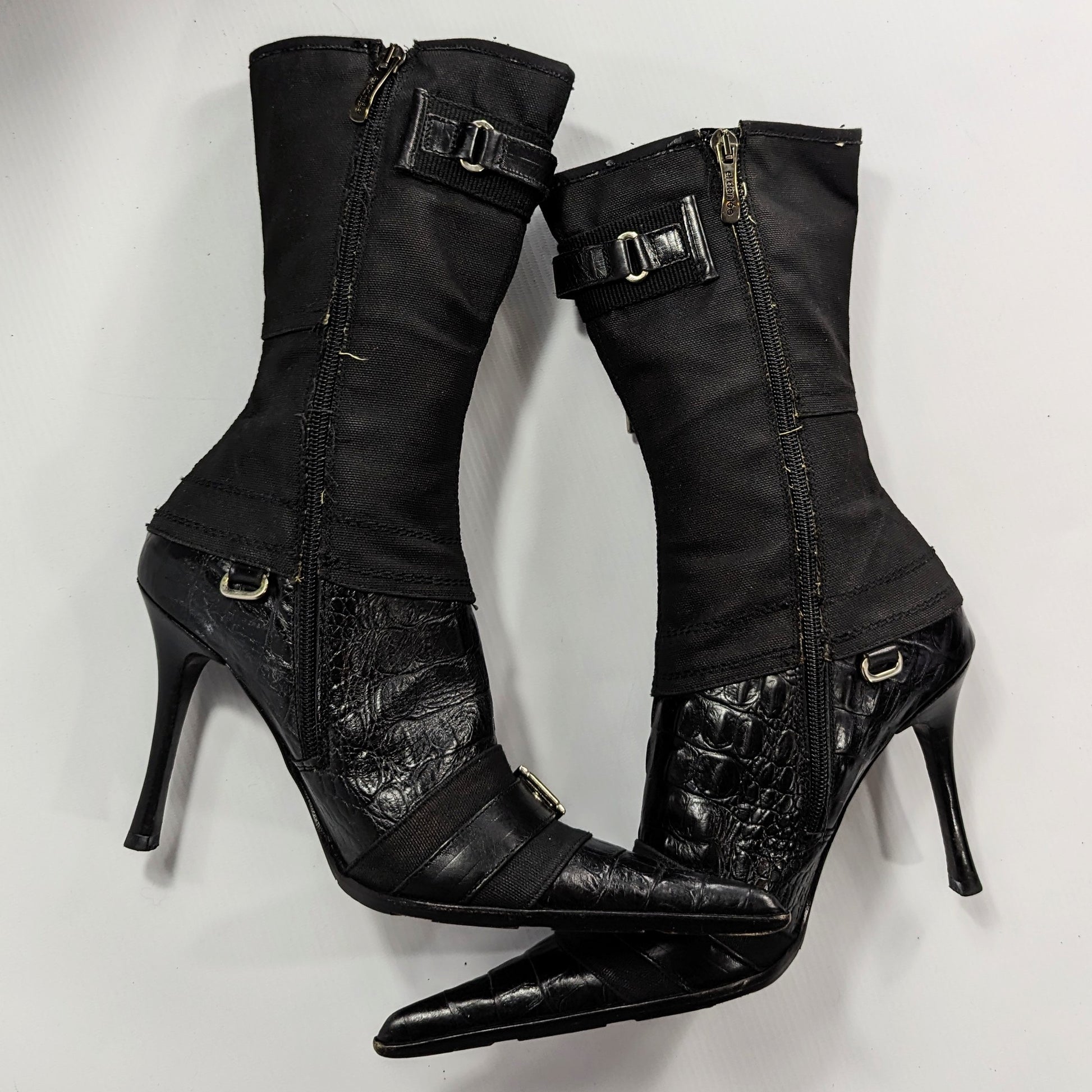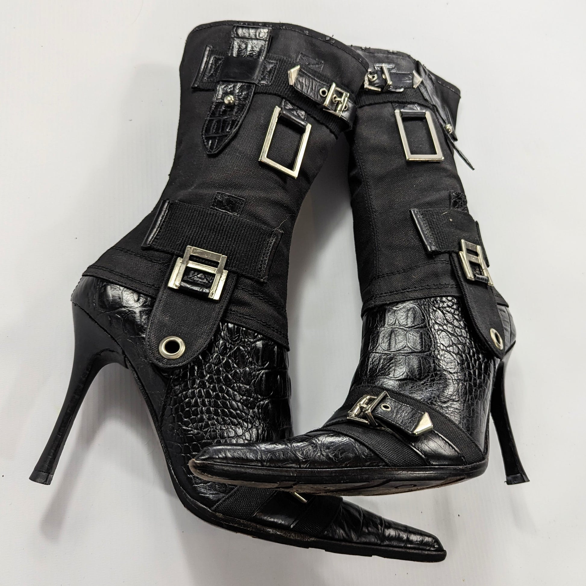Item: El Dantes black ankle boots in python-effect leather and fabric. Multiple metal details.
