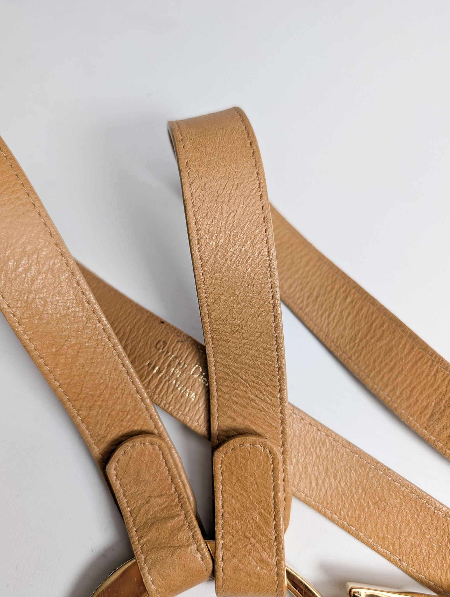 Item: Beige leather belt with a buckle bearing the initials "CD".