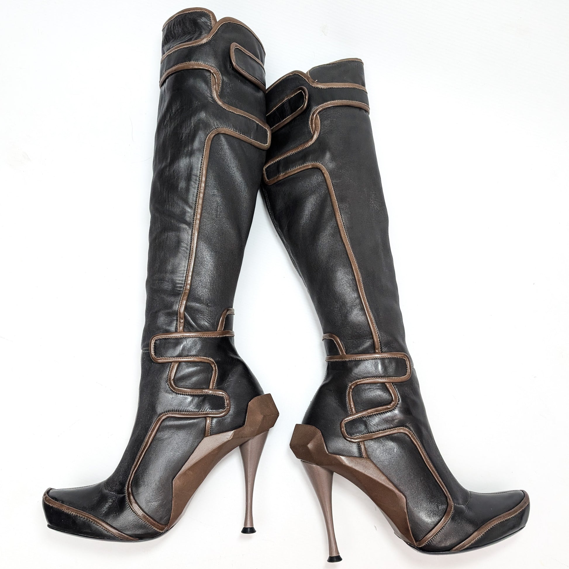 Item: Celine high boots with straps. A key piece from the Celine Autumn/Winter 2008 runway show. Soft leather. Brown shade.