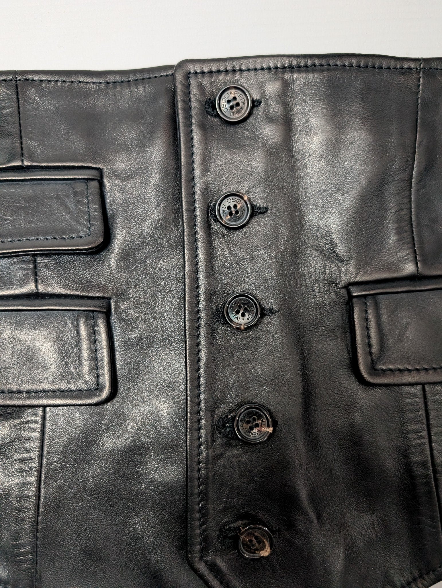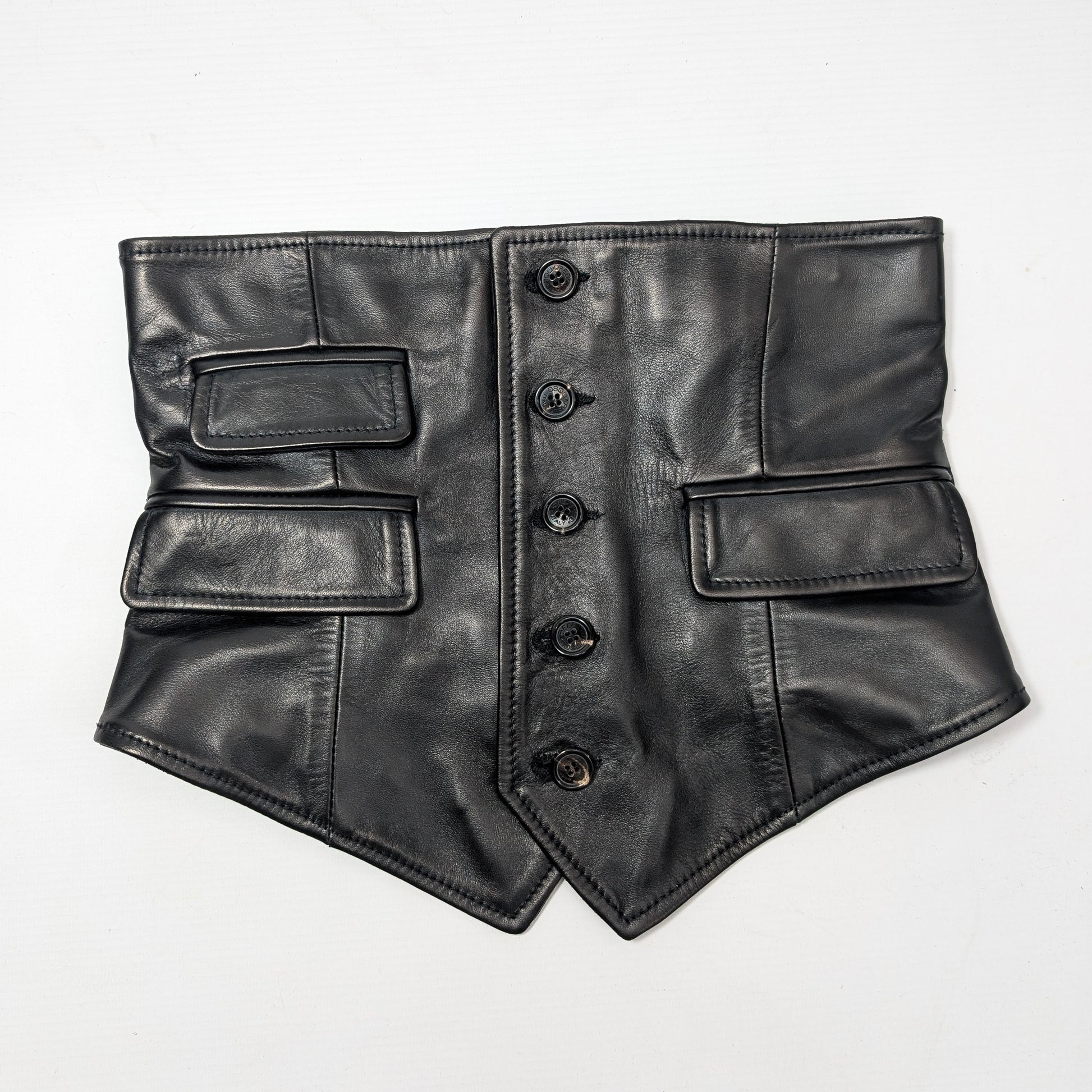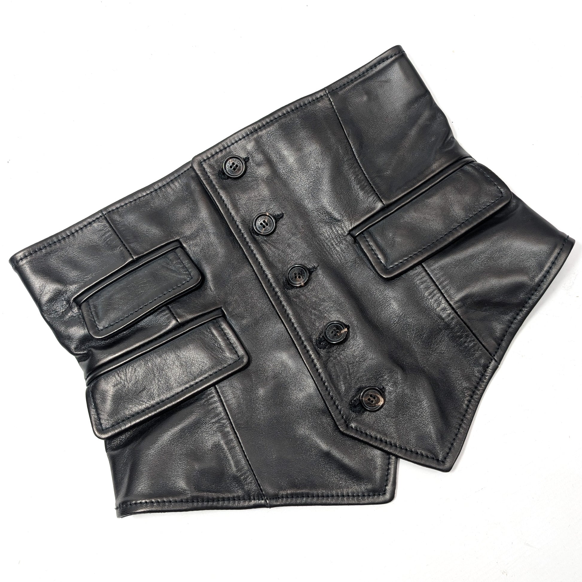 Item: Soft black leather bustier. Elastic at the back to cinch the waist.