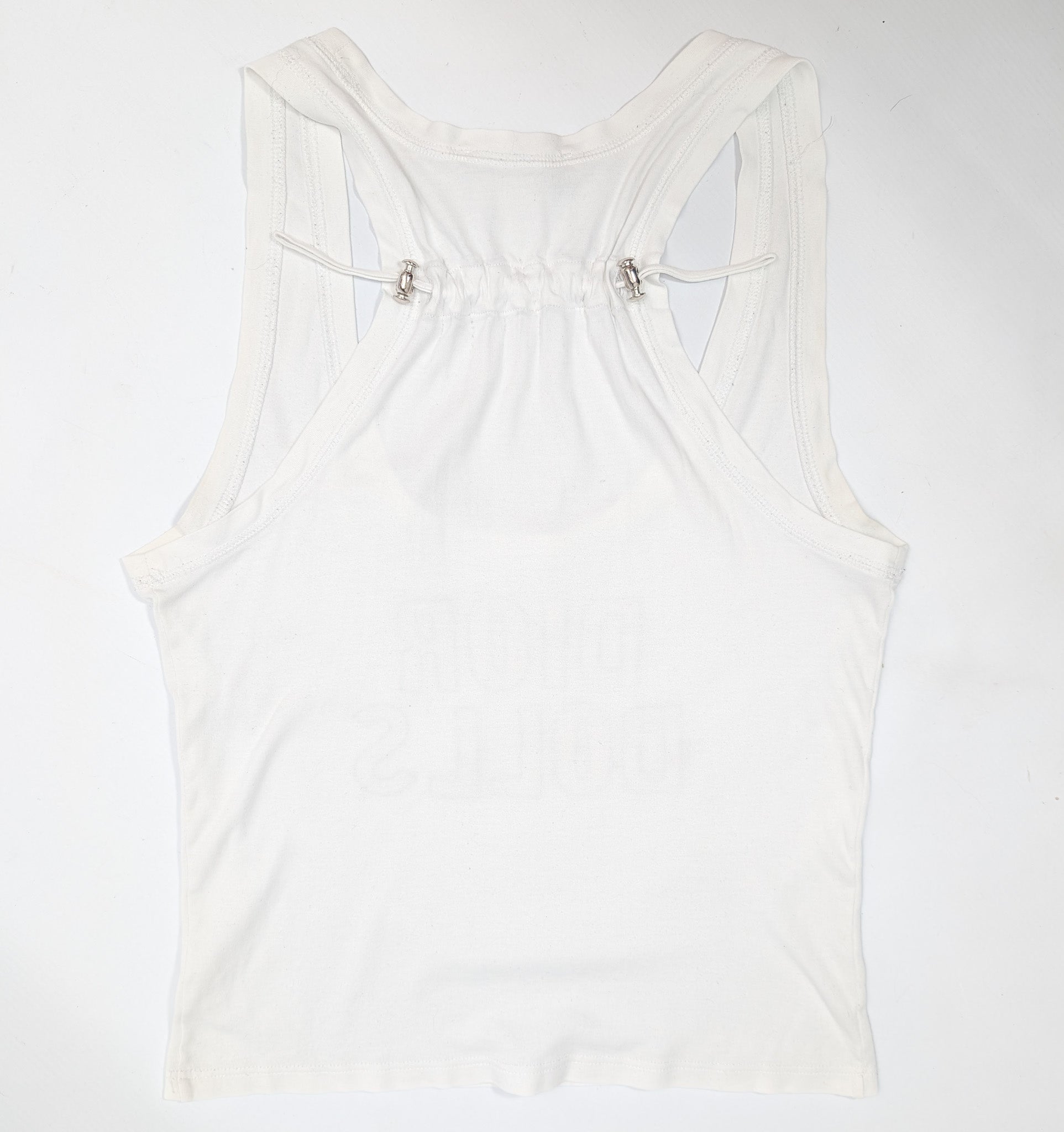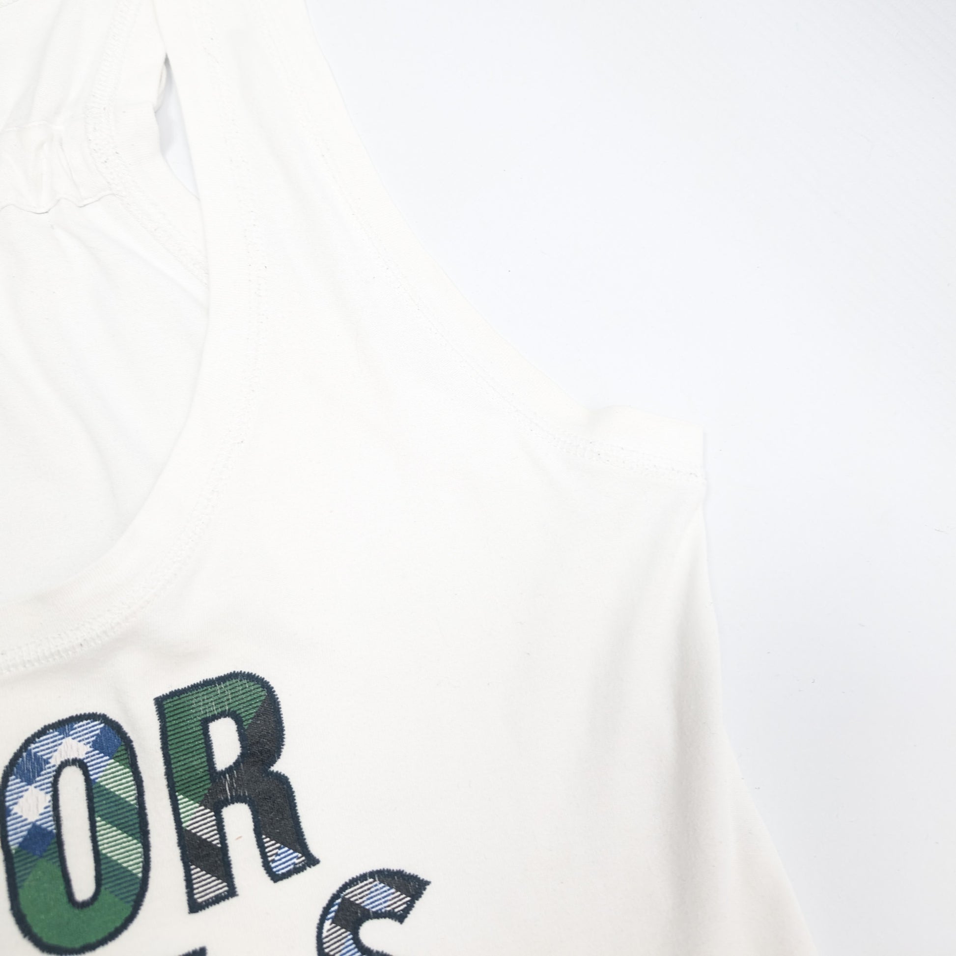 Item: White crew neck tank top featuring a "Dior Dolls" print in green and blue tartan.