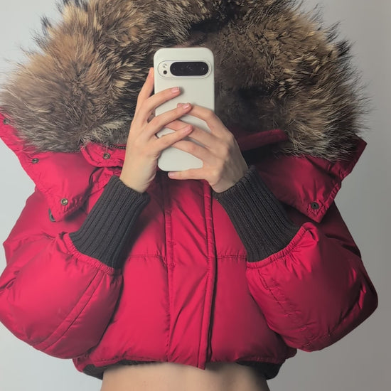 Item: Short, very warm down jacket with real fur, removable collar and hood. Fur collar and fur-trimmed hood.