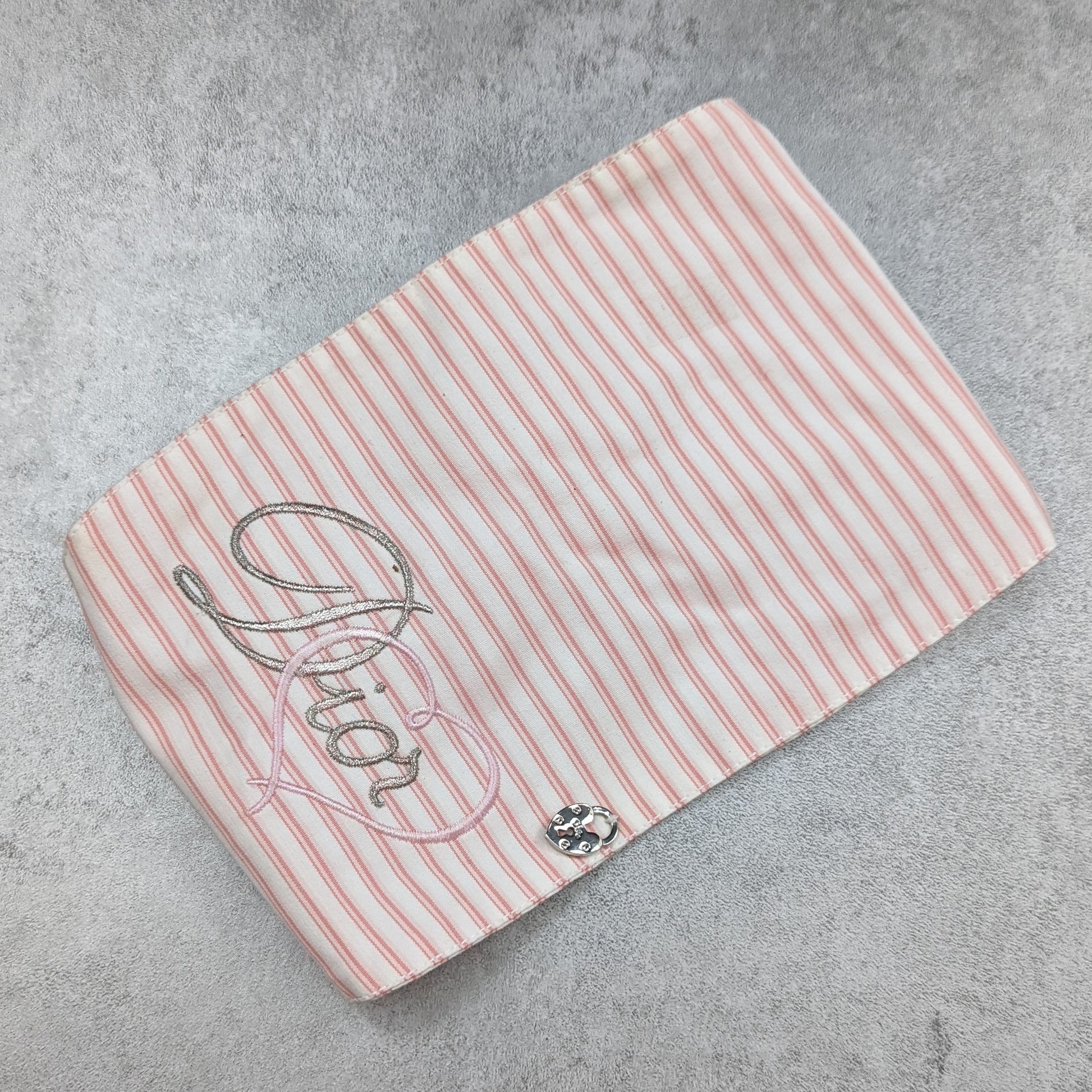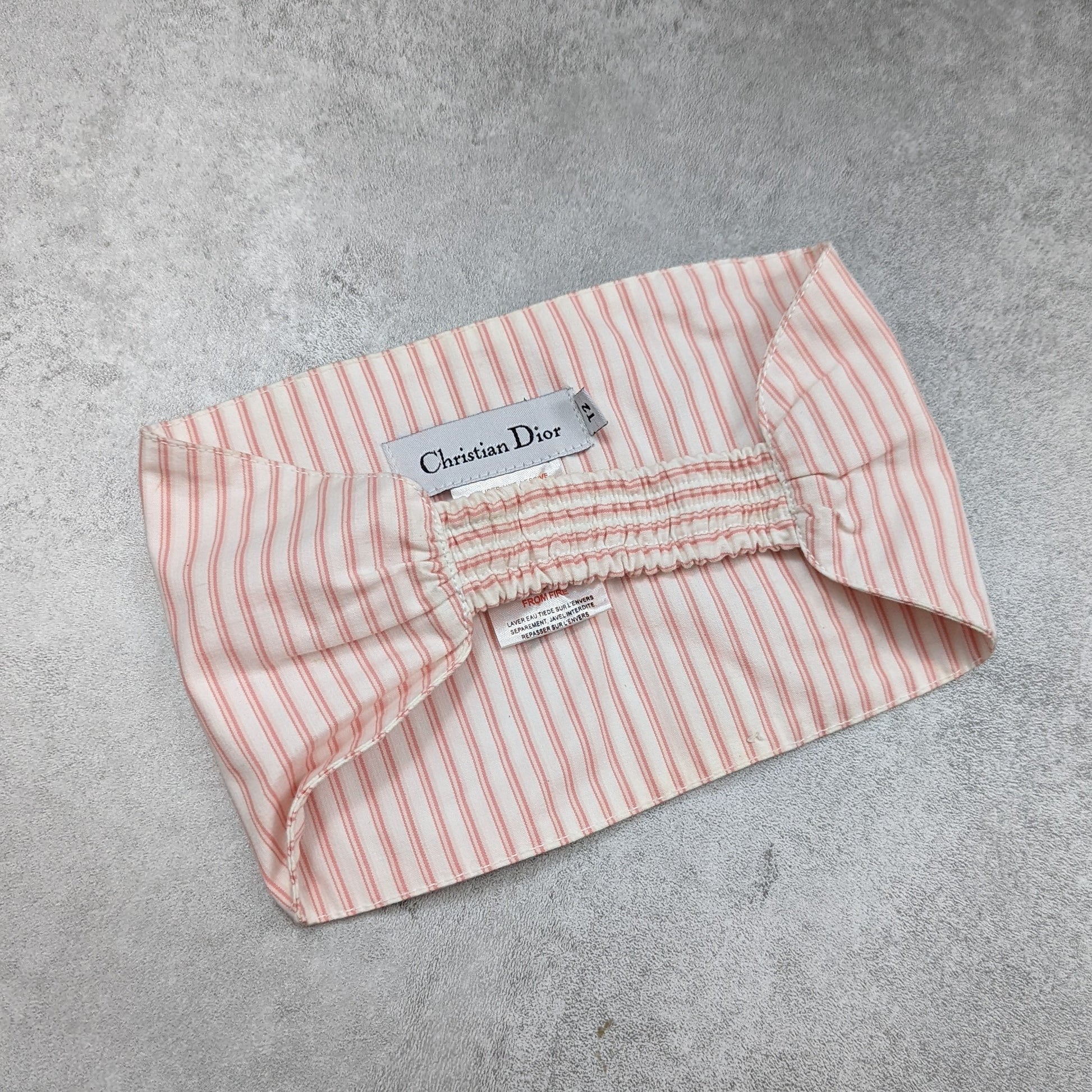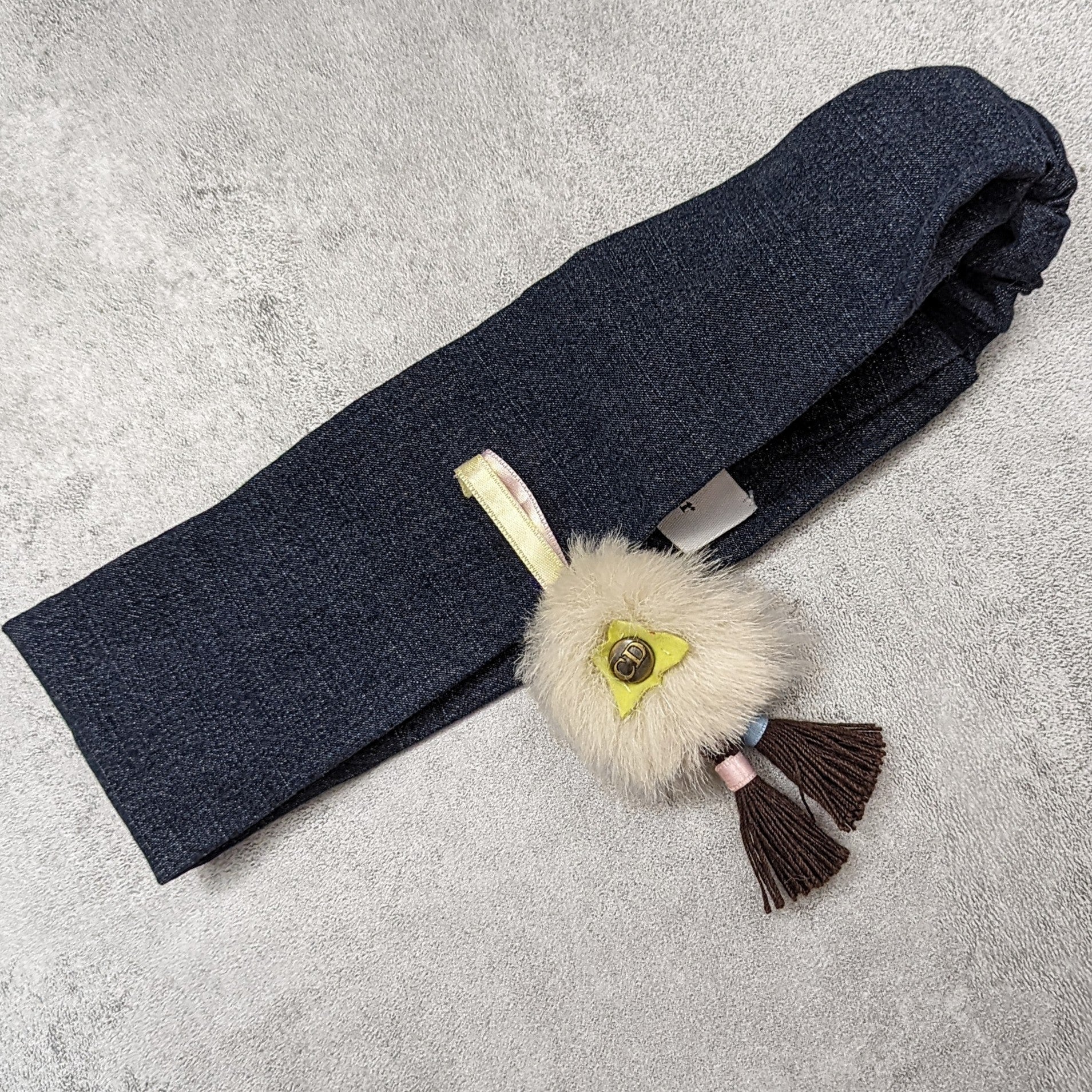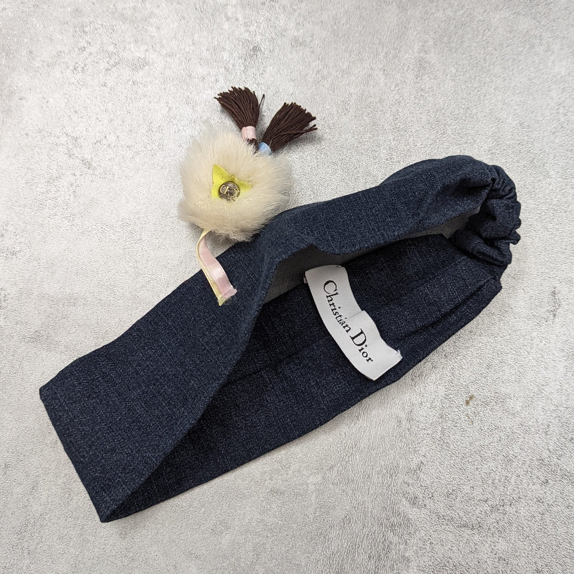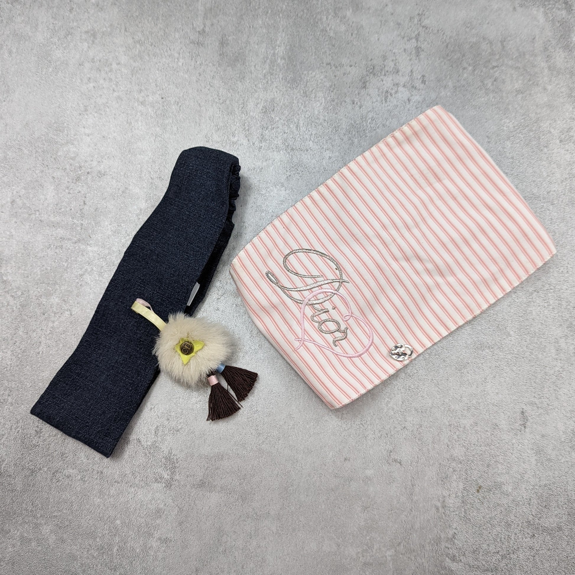 Item: Lot of two headbands, headbands. The first is pink, striped, adorned with a small yoke in the shape of a heart padlock. The second is in denim jeans, adorned with a pompom with the CD initials.