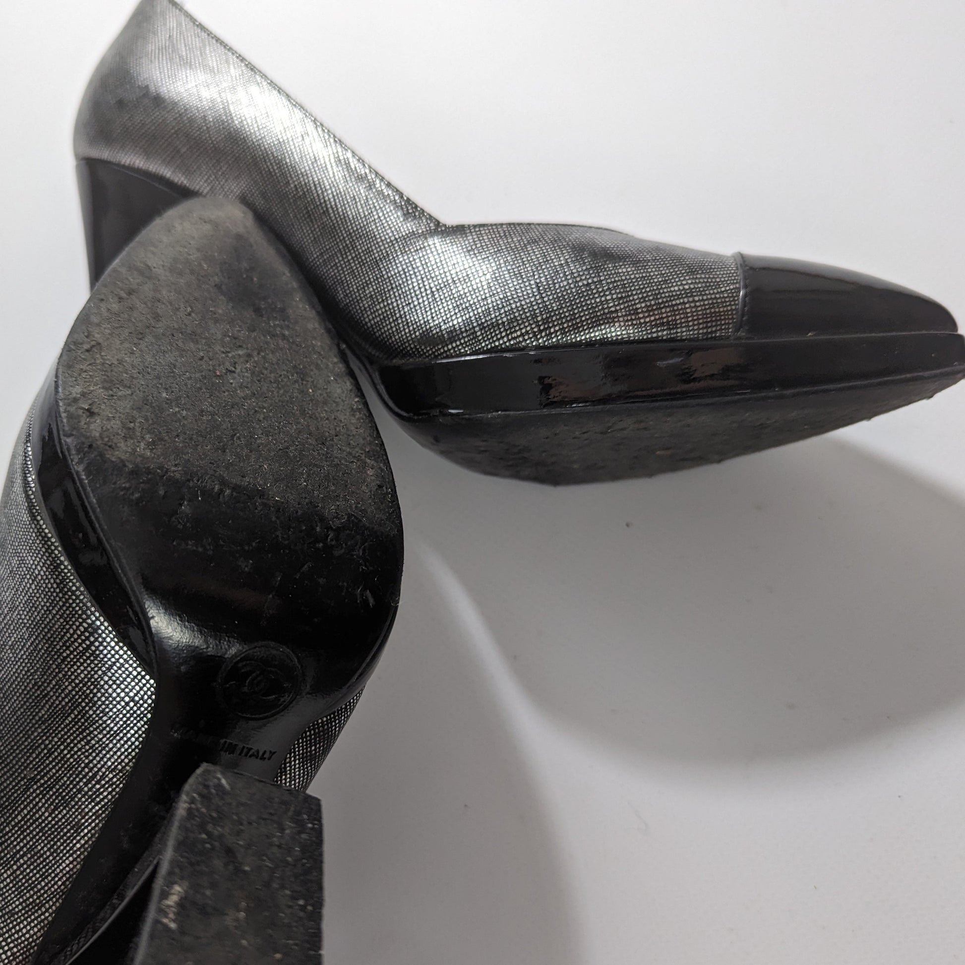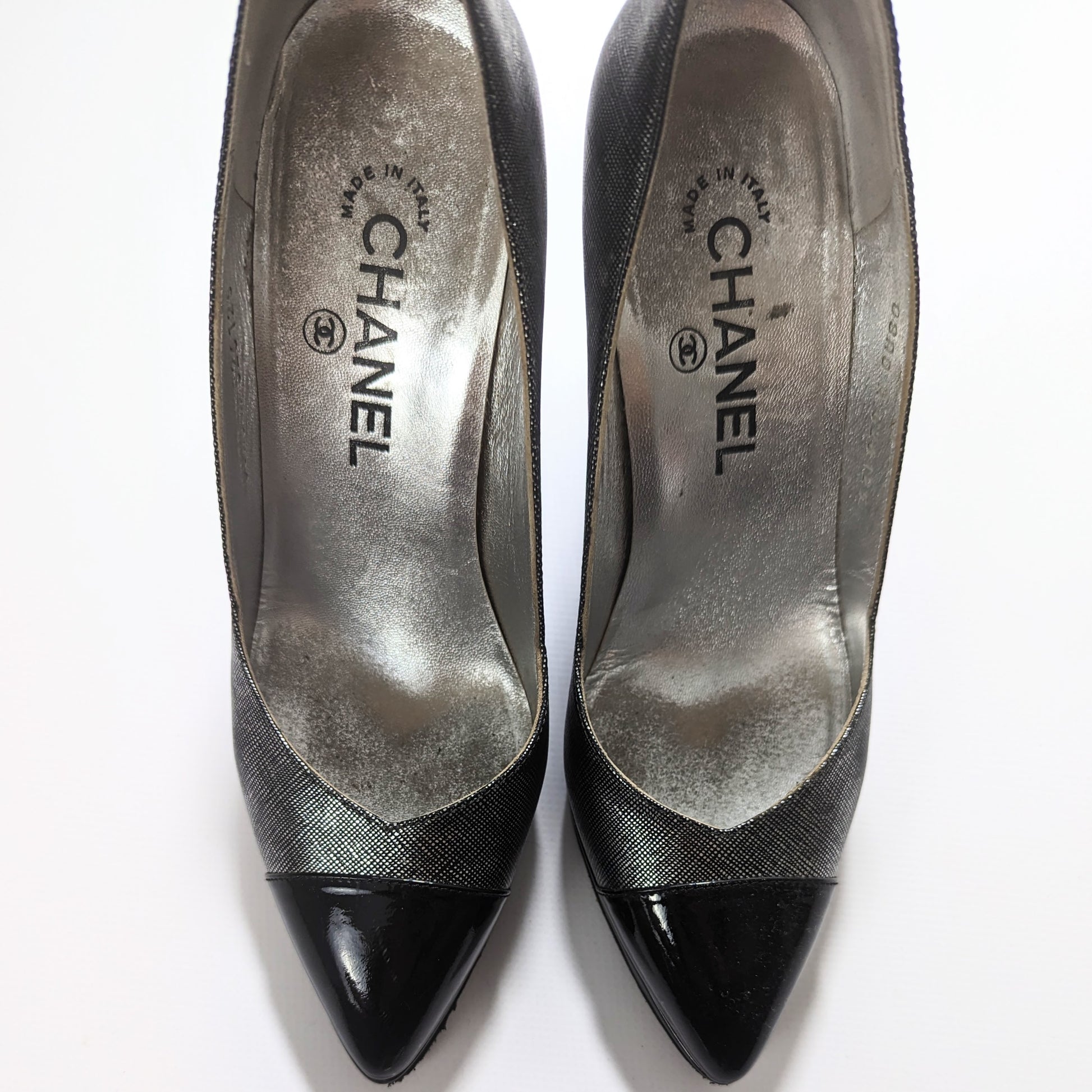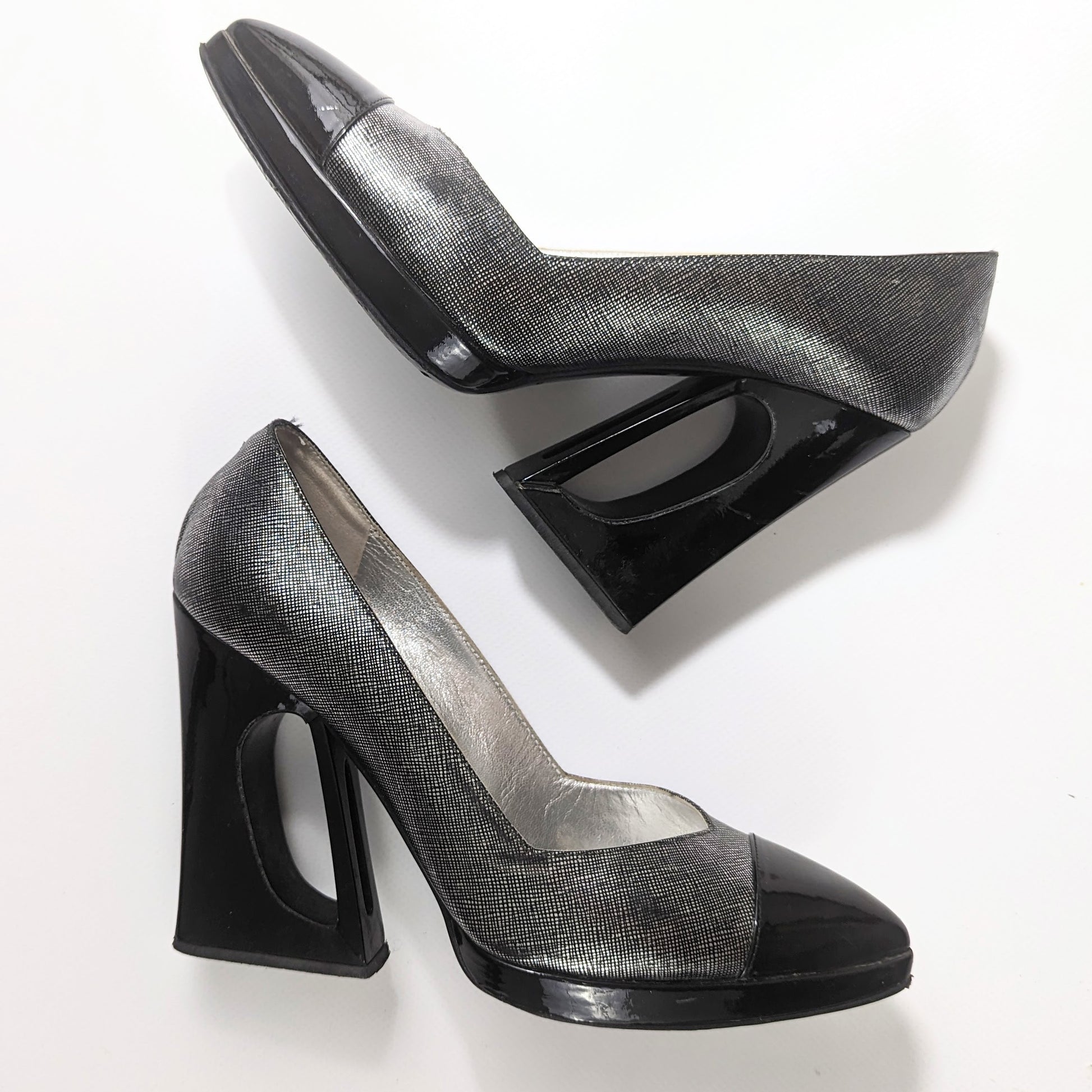 Item: Vintage Chanel pump in silver gray and black patent leather. Geometric heel, extremely comfortable and stable.
