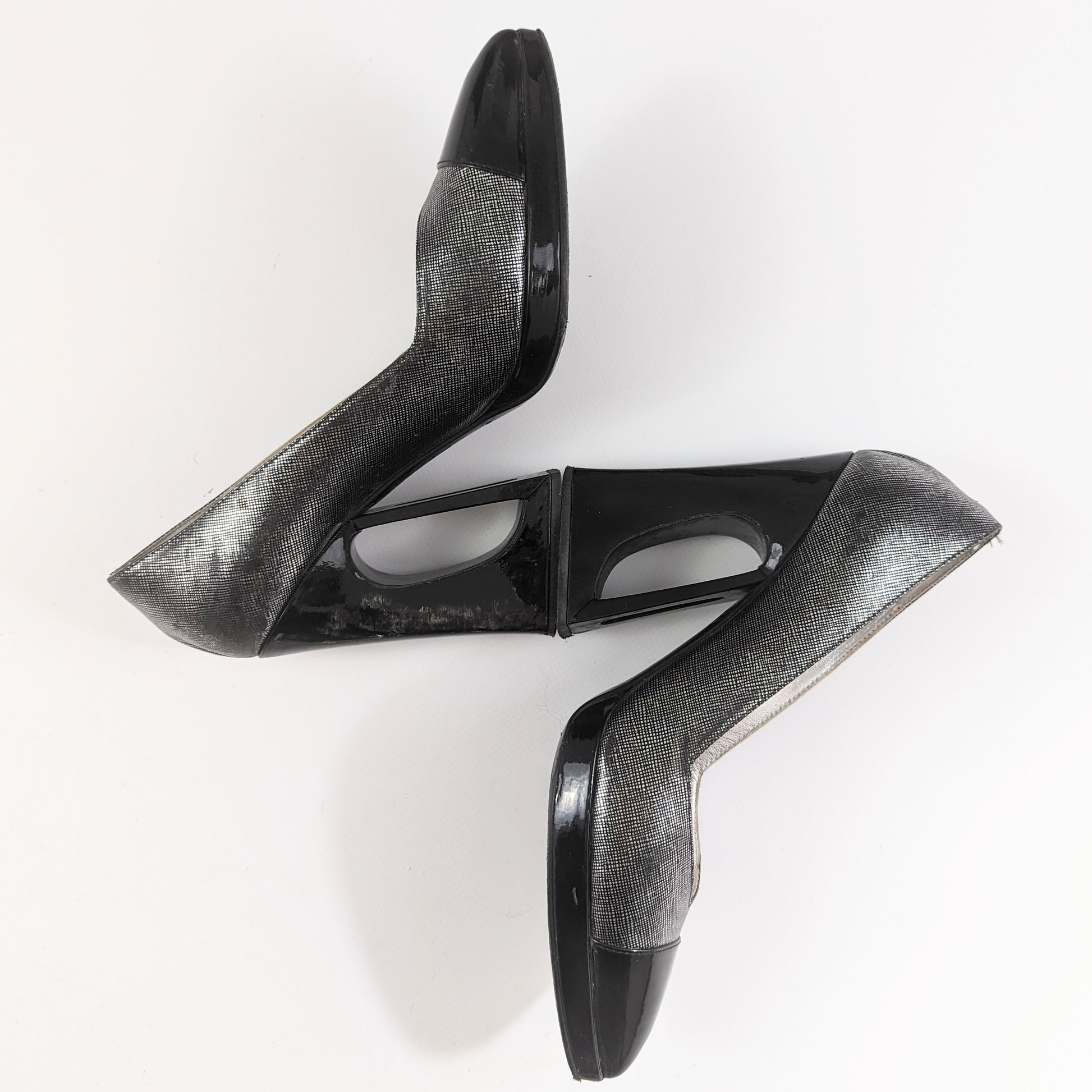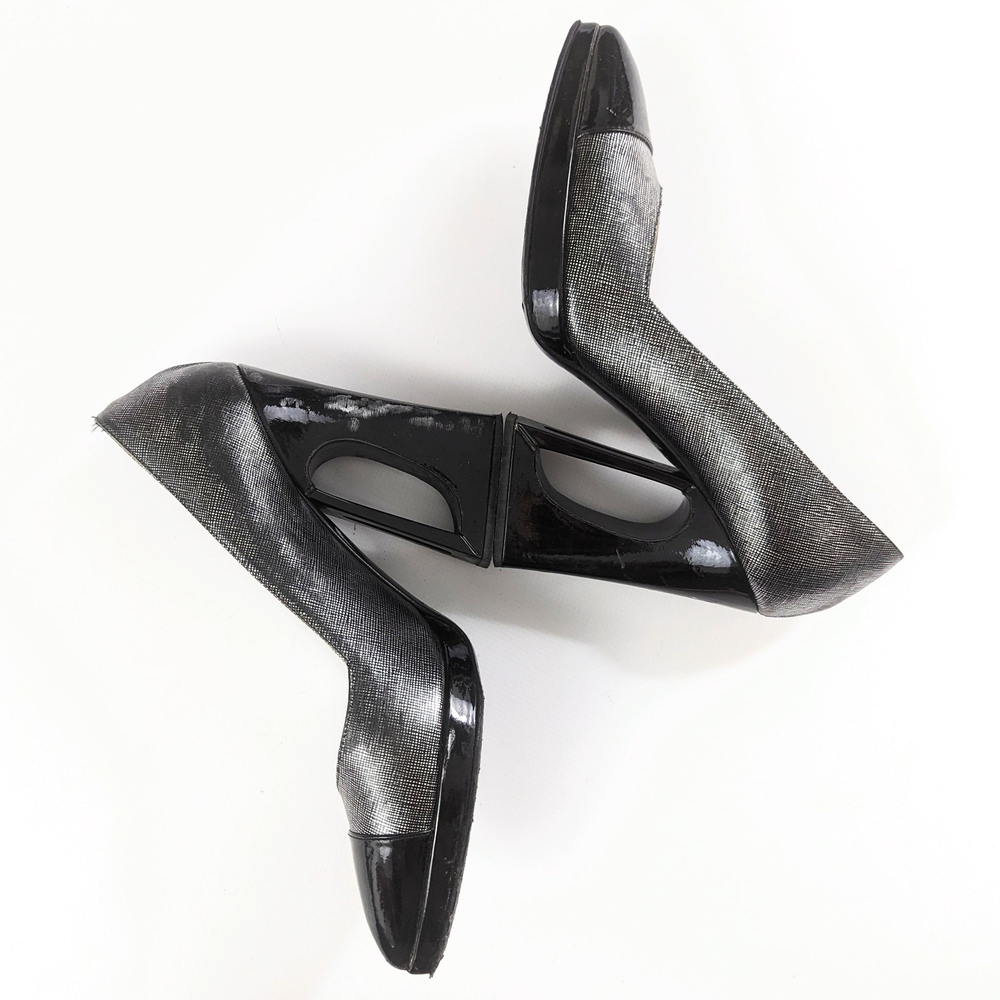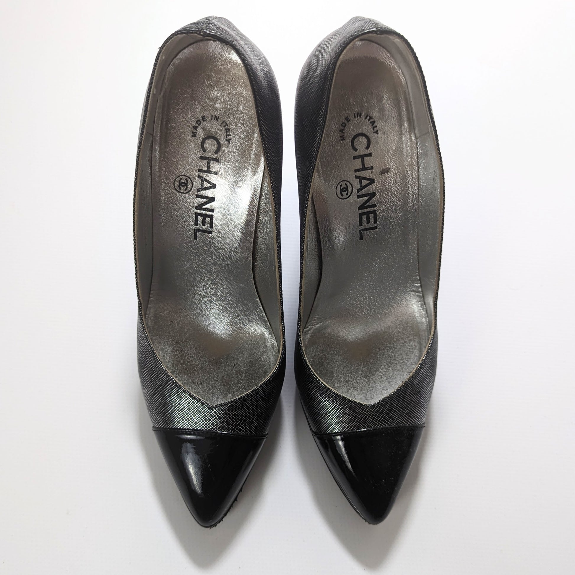 Item: Vintage Chanel pump in silver gray and black patent leather. Geometric heel, extremely comfortable and stable.