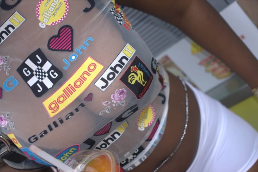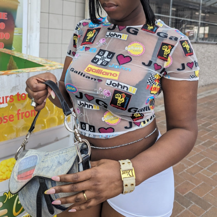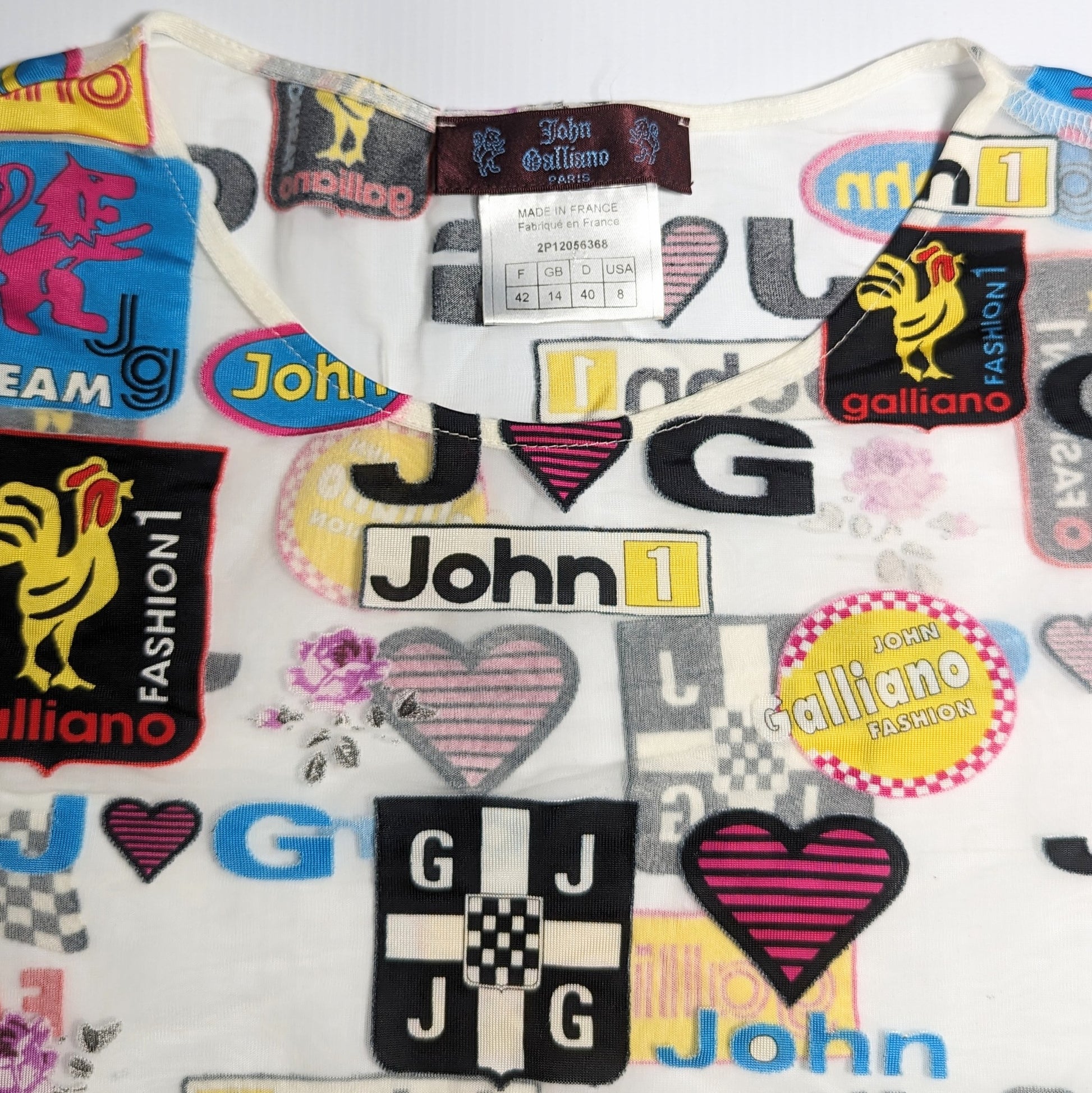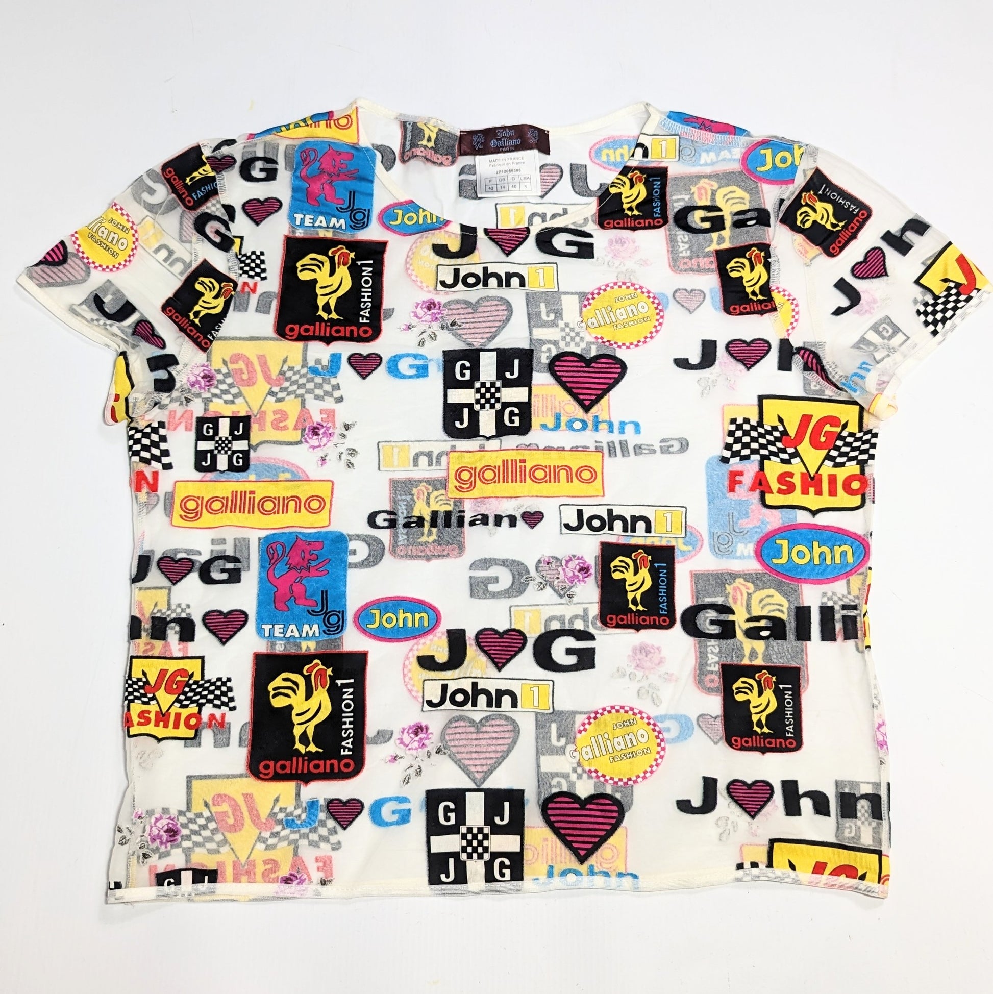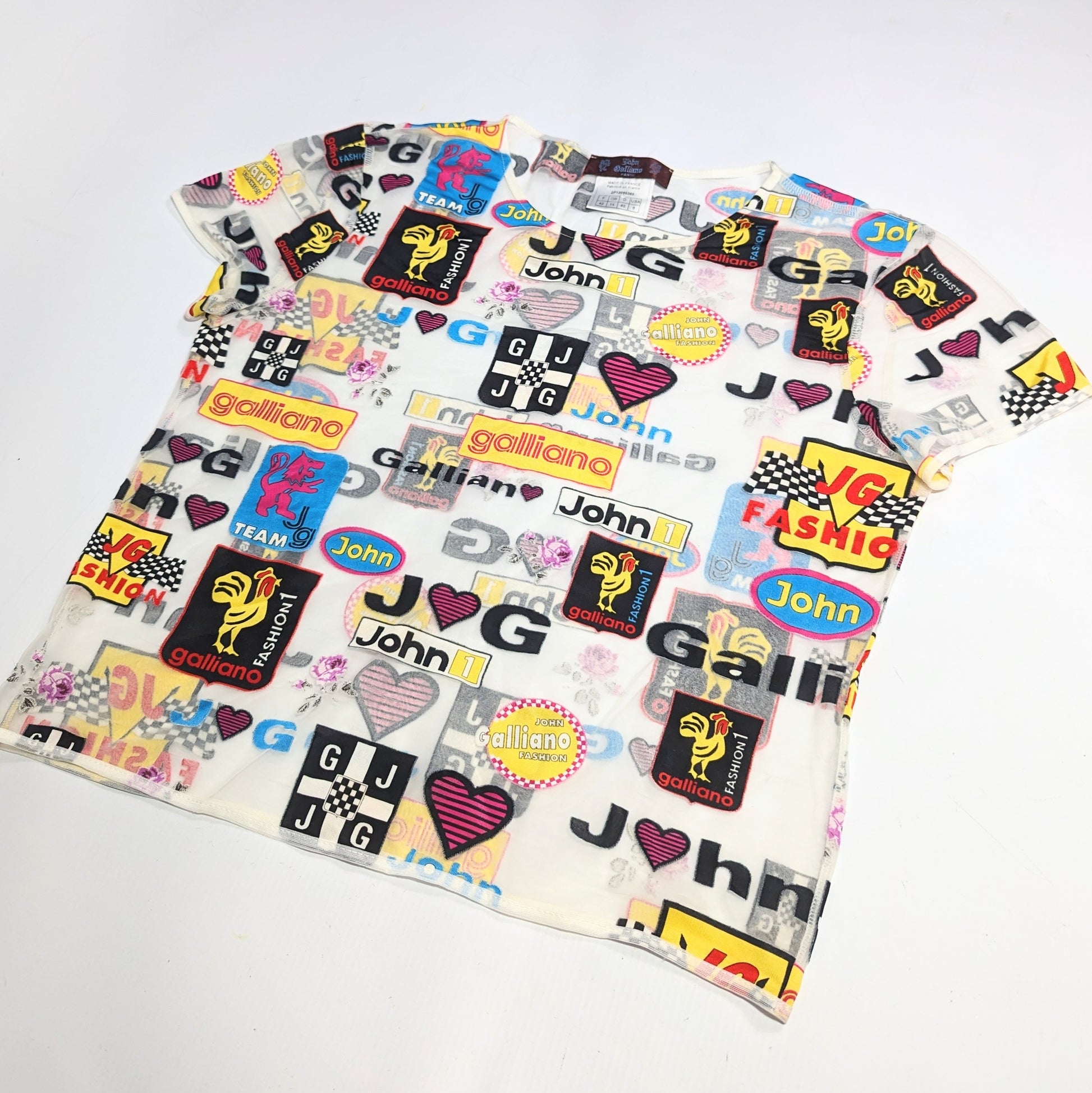 Item: Round neck T-shirt with "racing motorcycle" style monogram print with multiple "I love John Galliano" inscriptions. Transparent mesh material.
