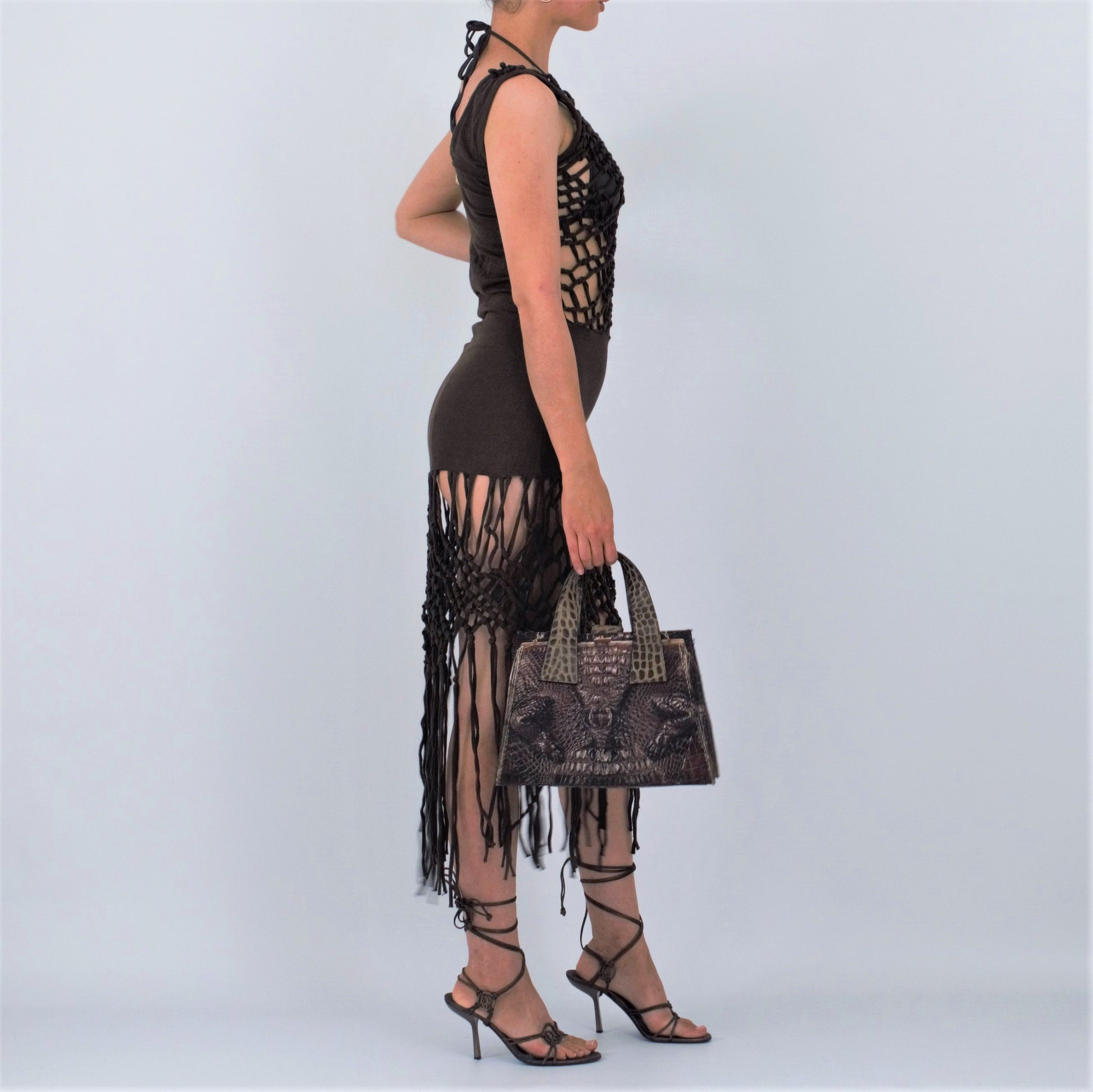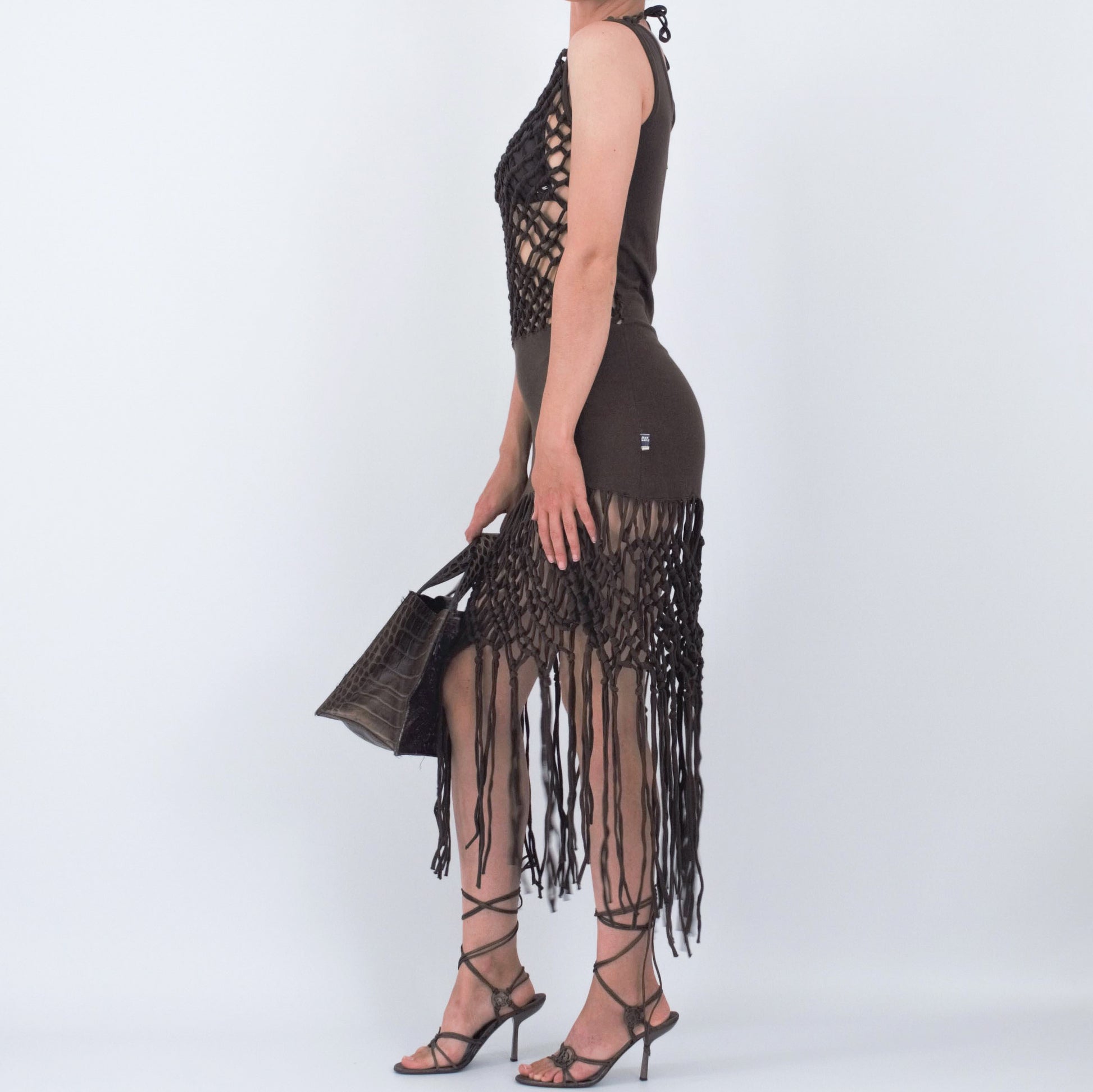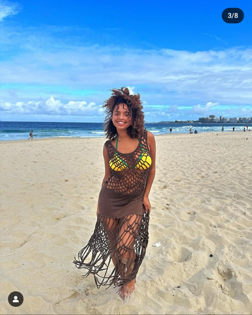 Item : Brown cotton net dress with fringe.