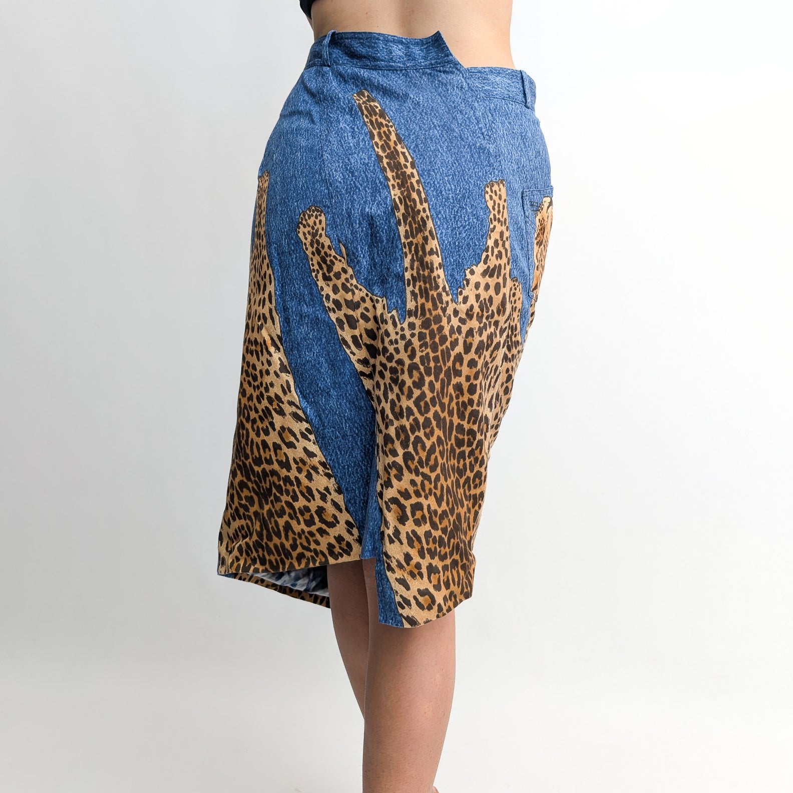 Item: Lightweight denim skirt with faux leopard print. Asymmetrical. Can also be worn as a bandeau dress.