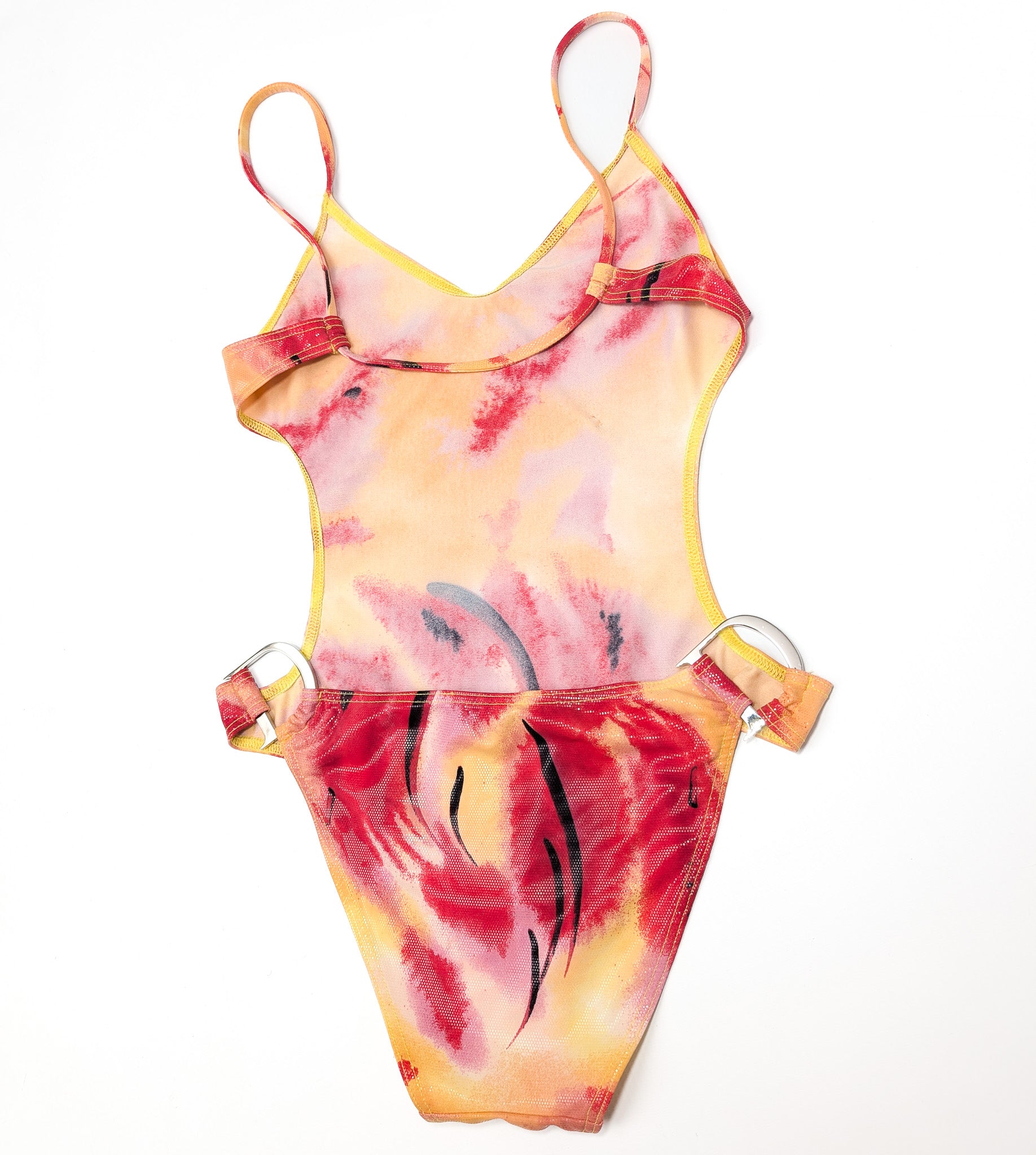 Item: Very rare one-piece swimsuit adorned with a large silver D on the side.