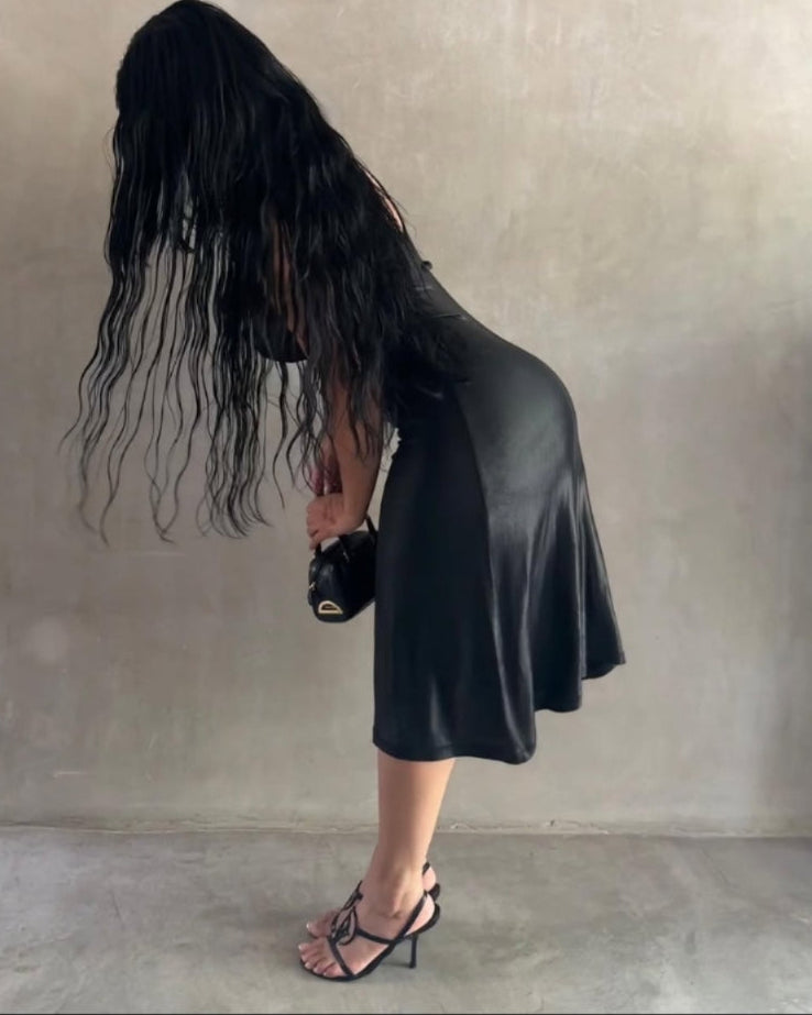 Item: Mini wet look bag. Looks like it rained on the bag. The effect is amazing. Top zip closure and one interior patch pocket.