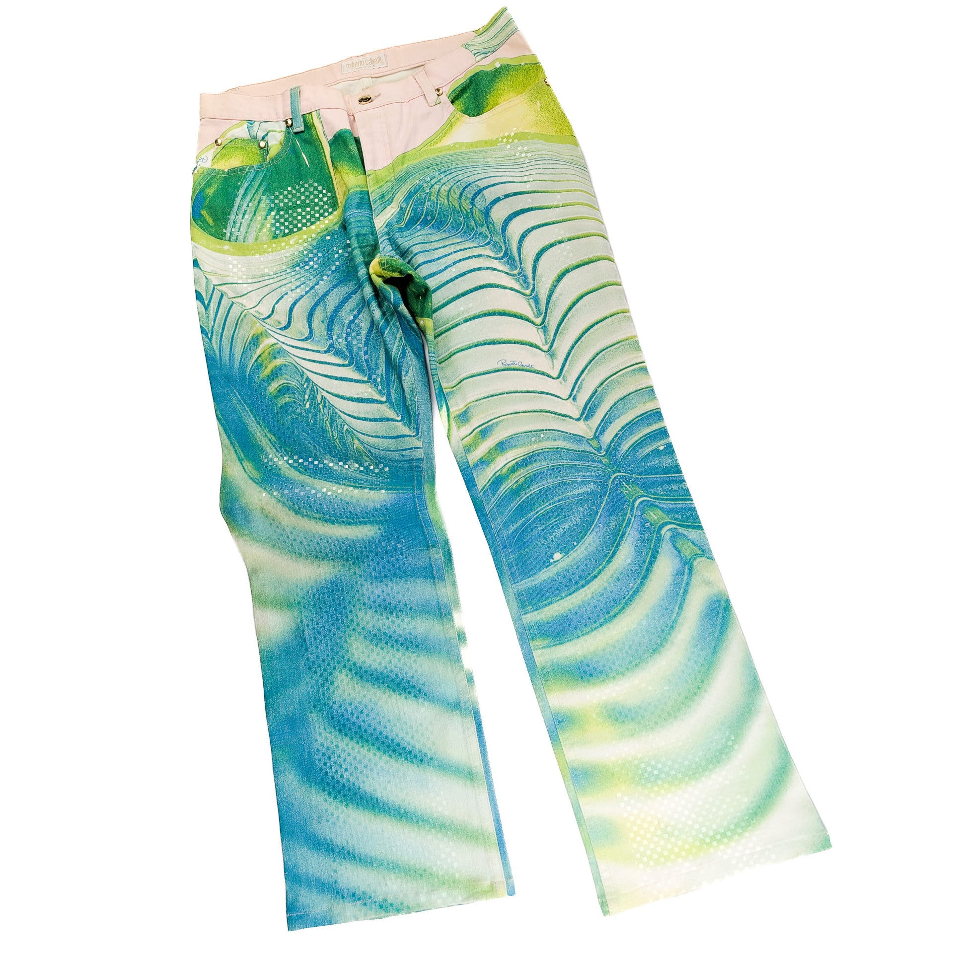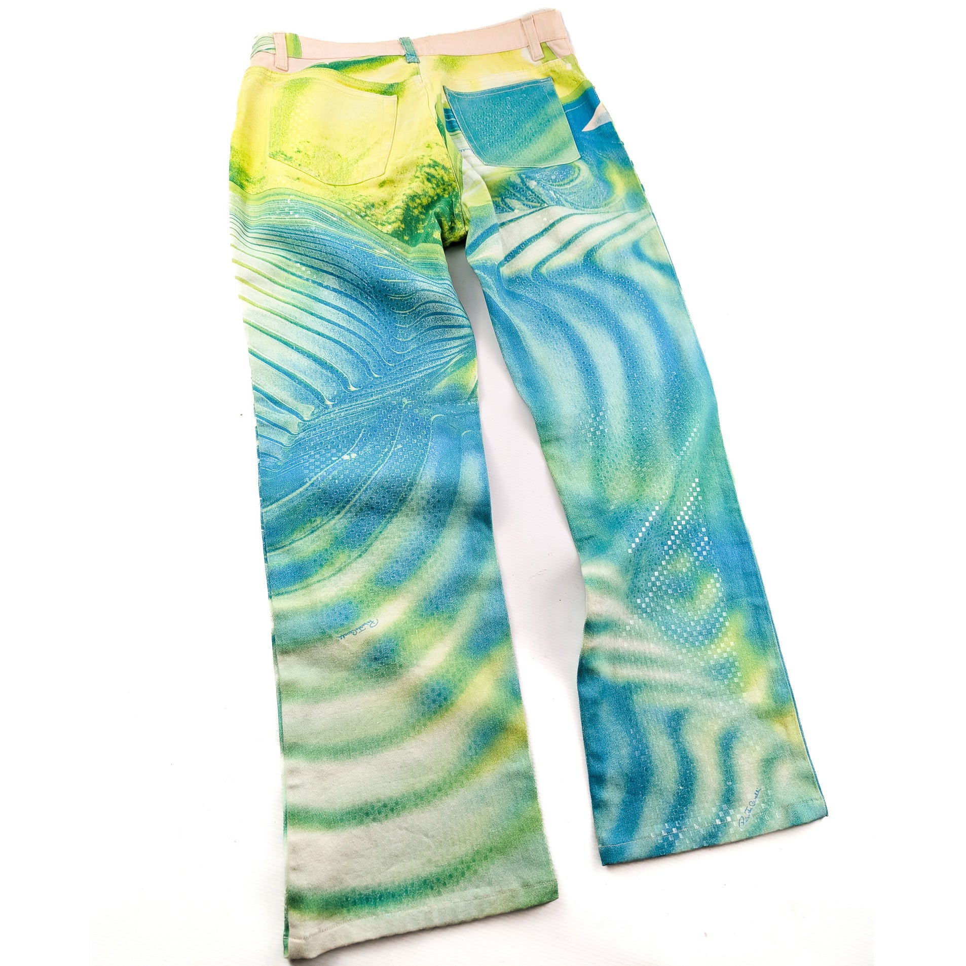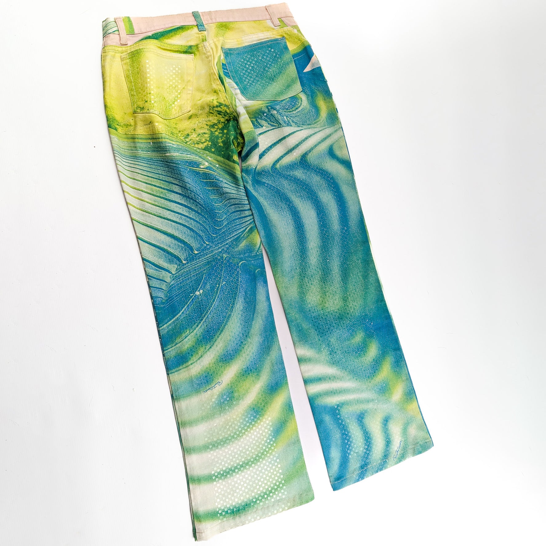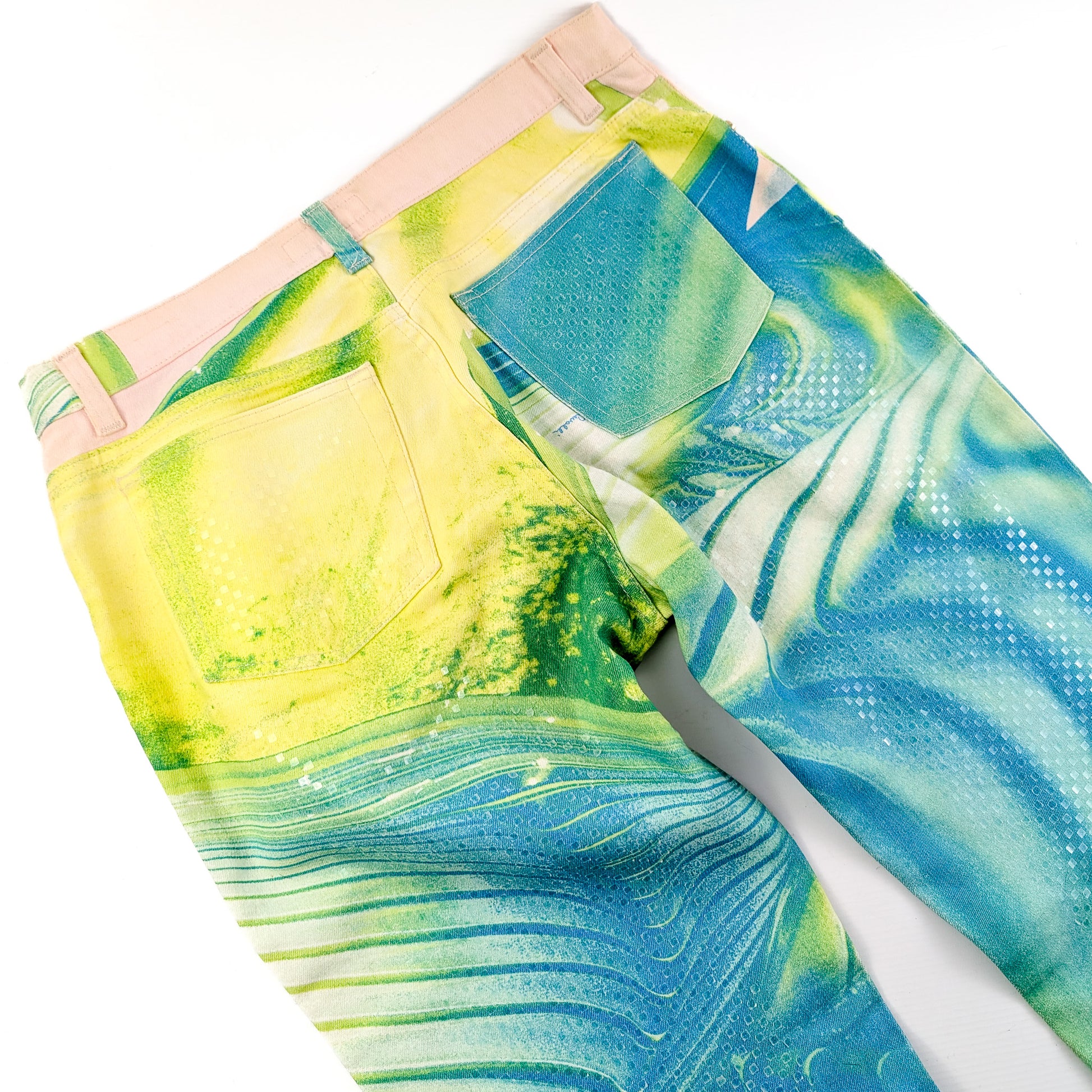 Item: Denim pants with a multi-colored abstract pattern. Sequins.