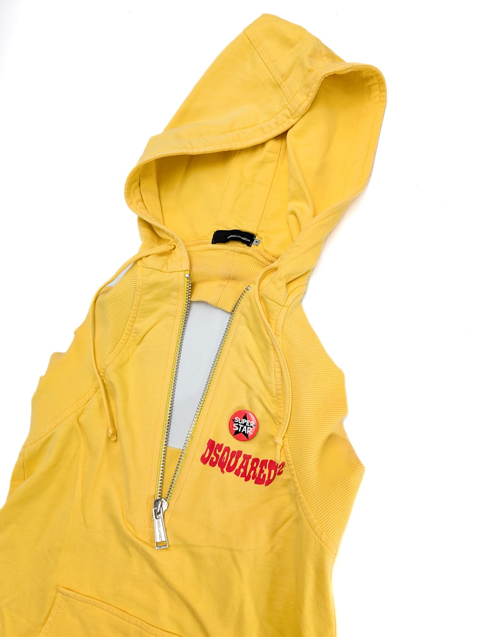 Item: Robe mini jaune à capuche style sport. Pin's.