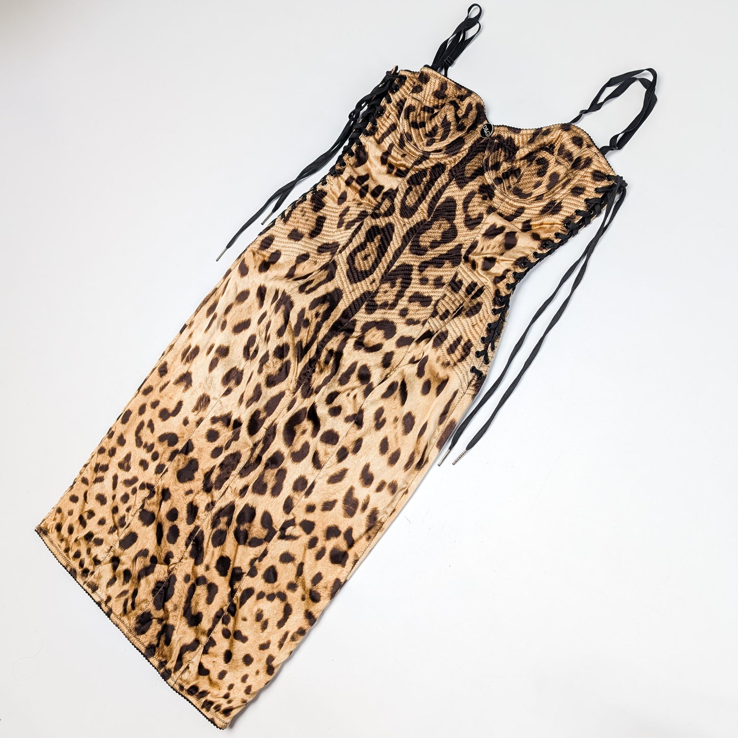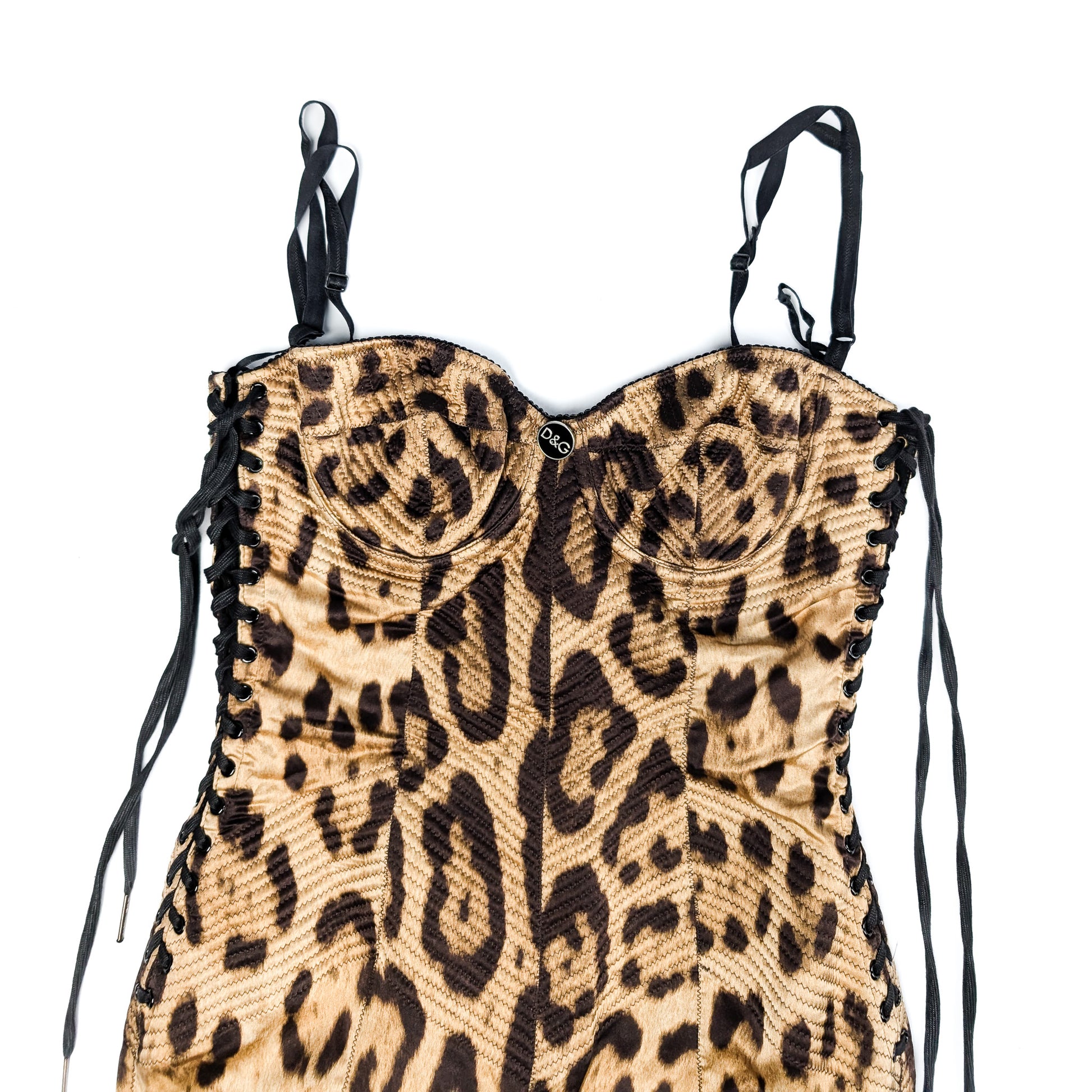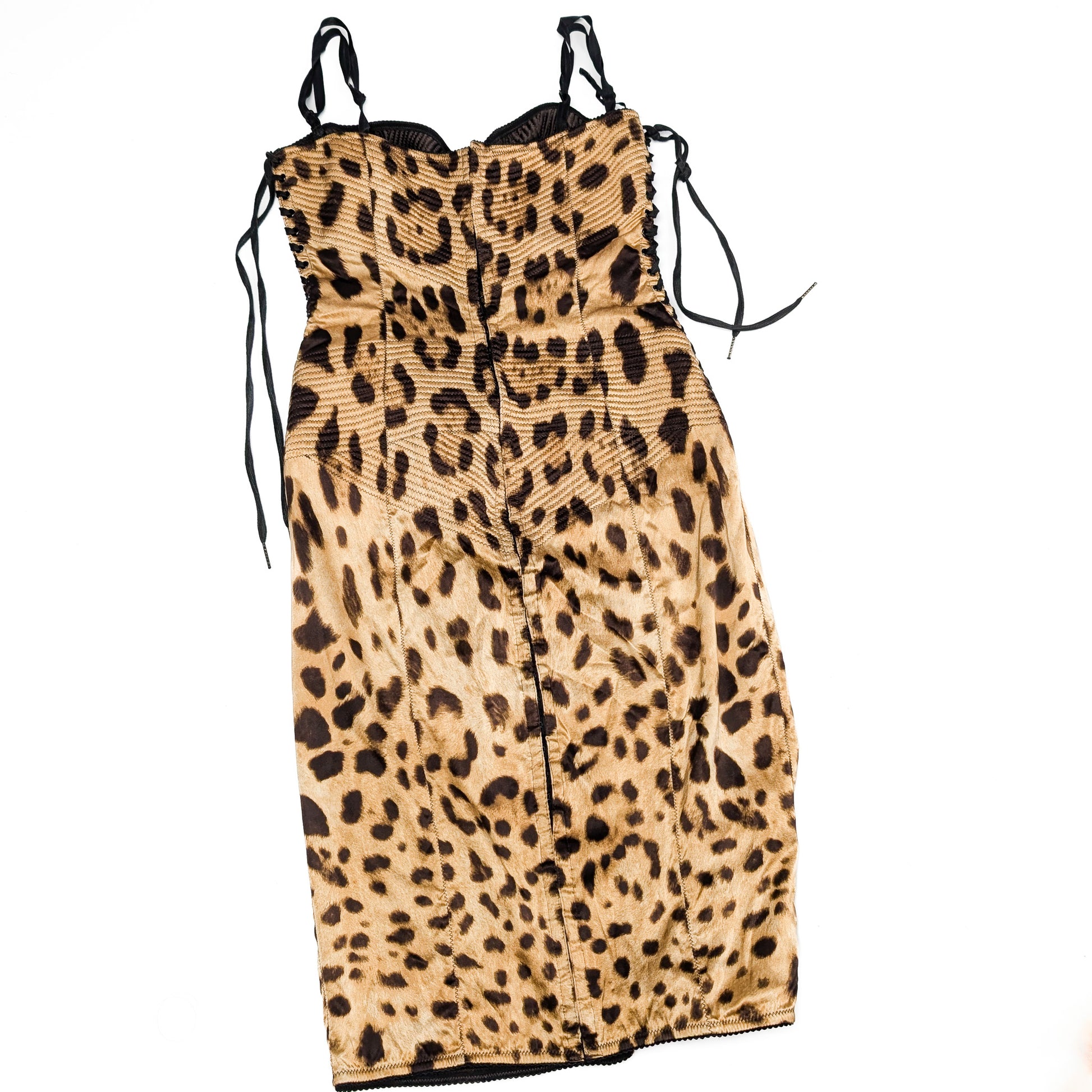 Item: Dolce & Gabanna silk dress with bodice, famous leopard print. This satin dress hugs the curves perfectly. Balconette bustier.