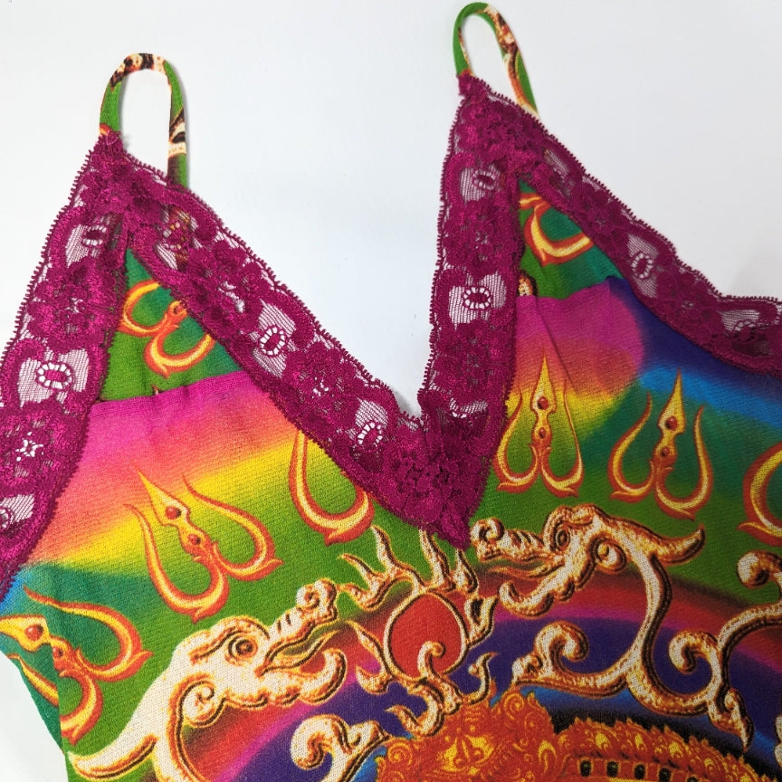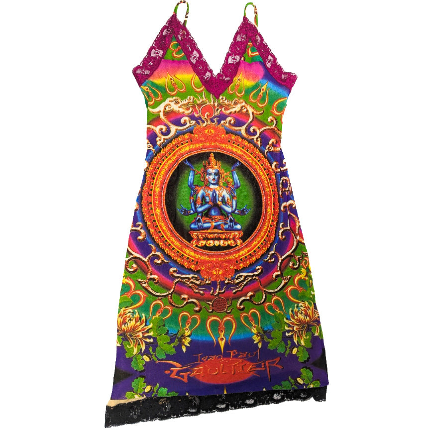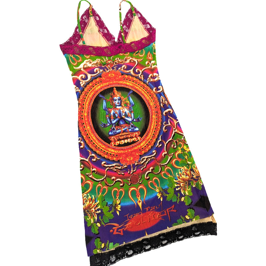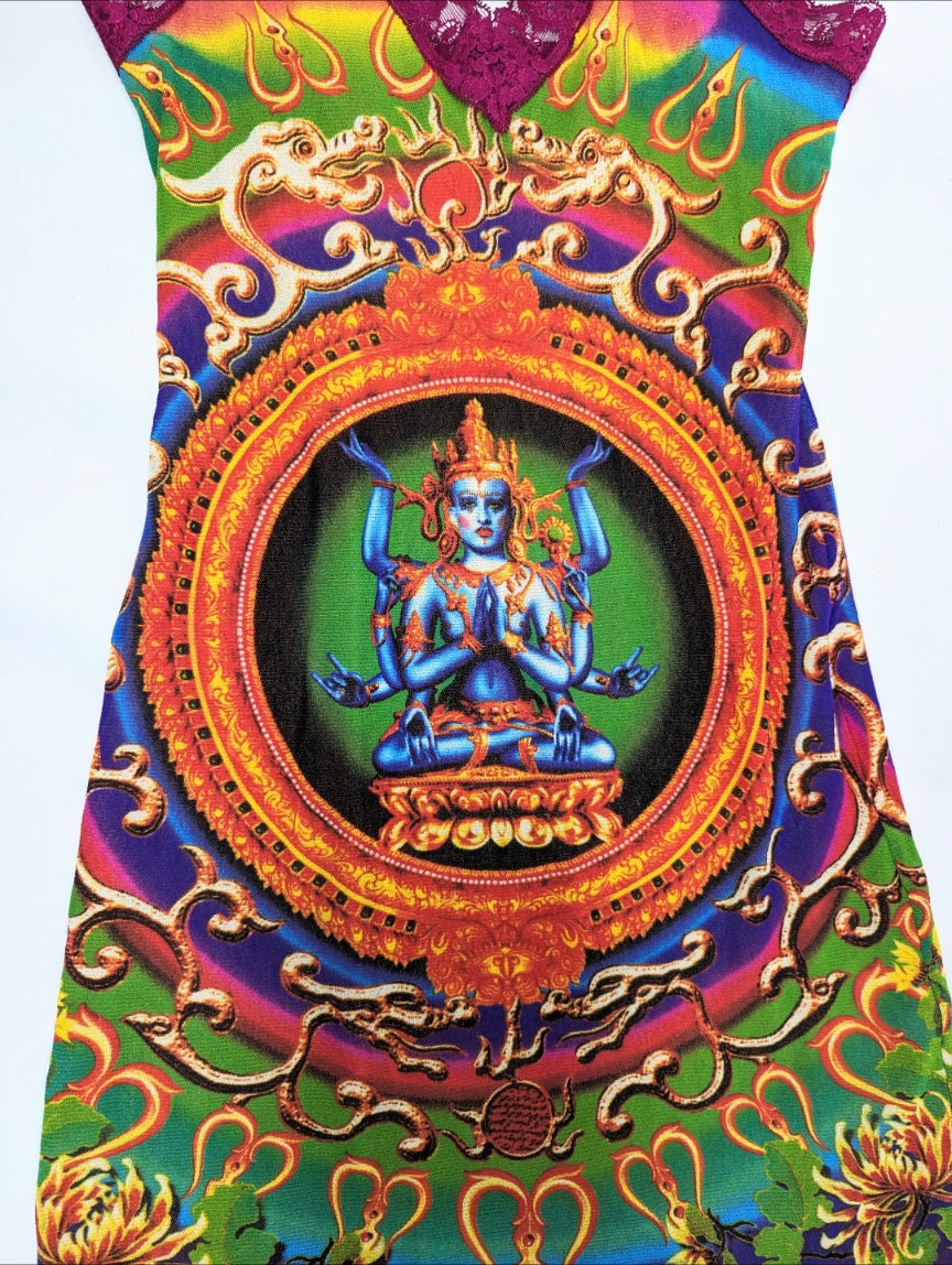 Item: Knit dress with a print of Hindu deities in vibrant colors. Lined with transparent mesh decorated with lace edging at the bottom.