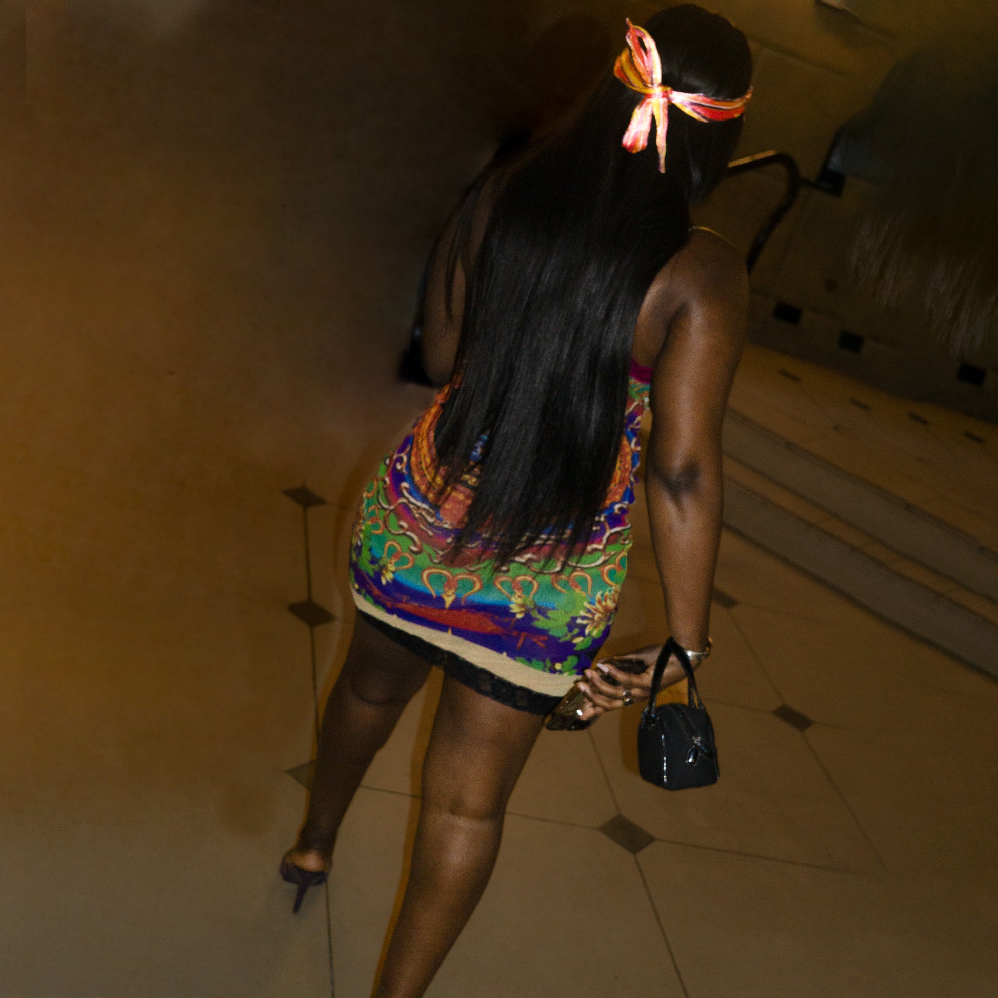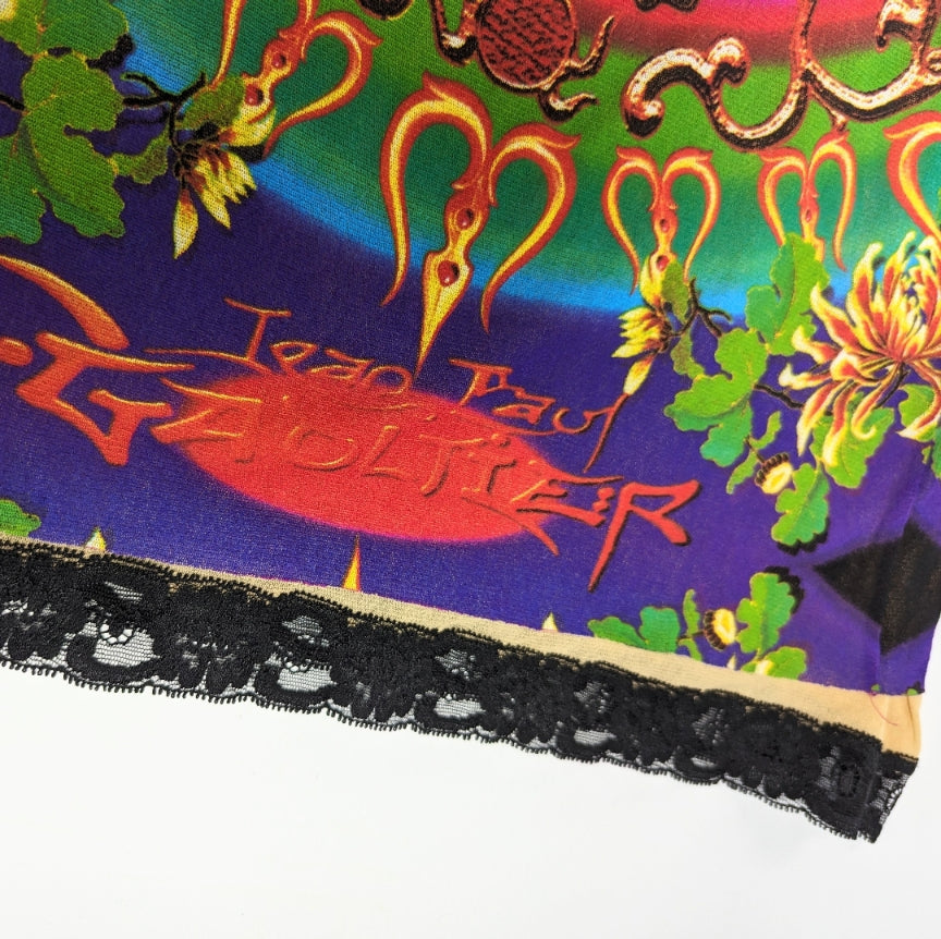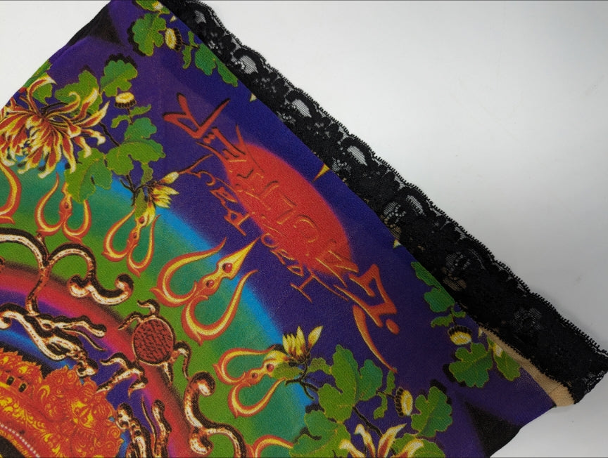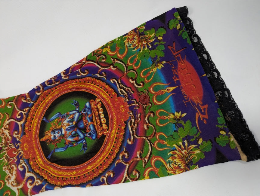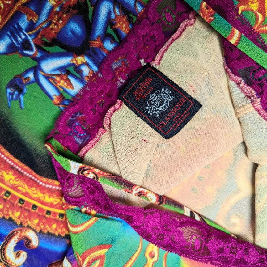 Item: Knit dress with a print of Hindu deities in vibrant colors. Lined with transparent mesh decorated with lace edging at the bottom.
