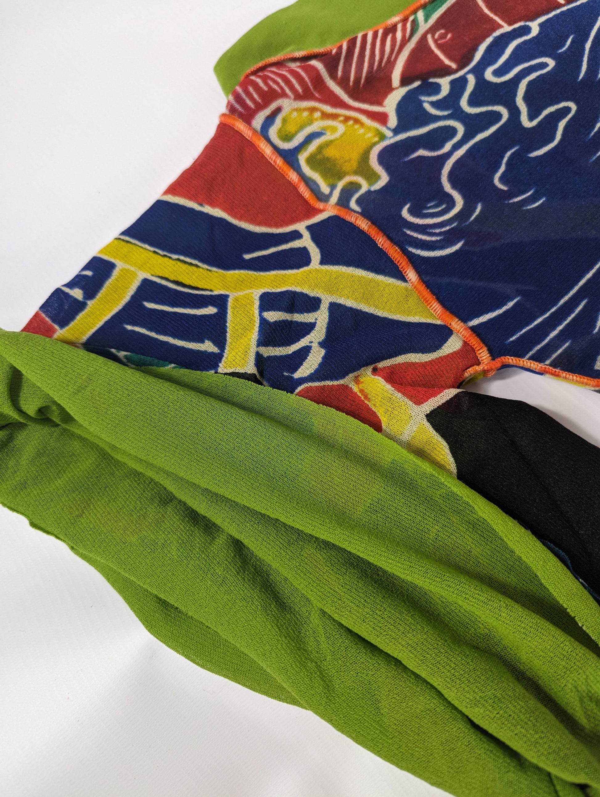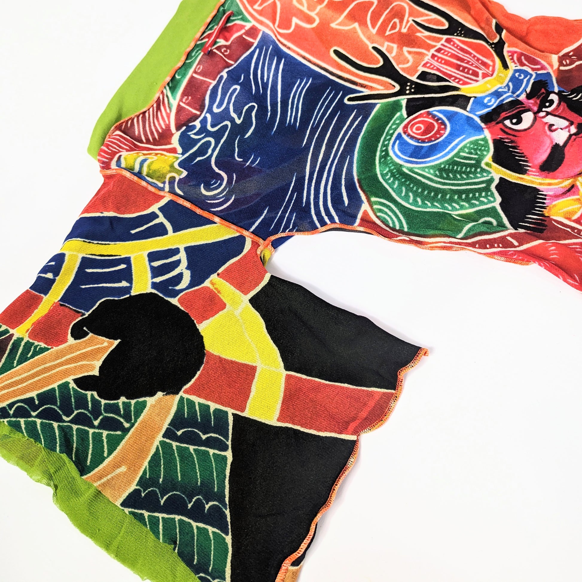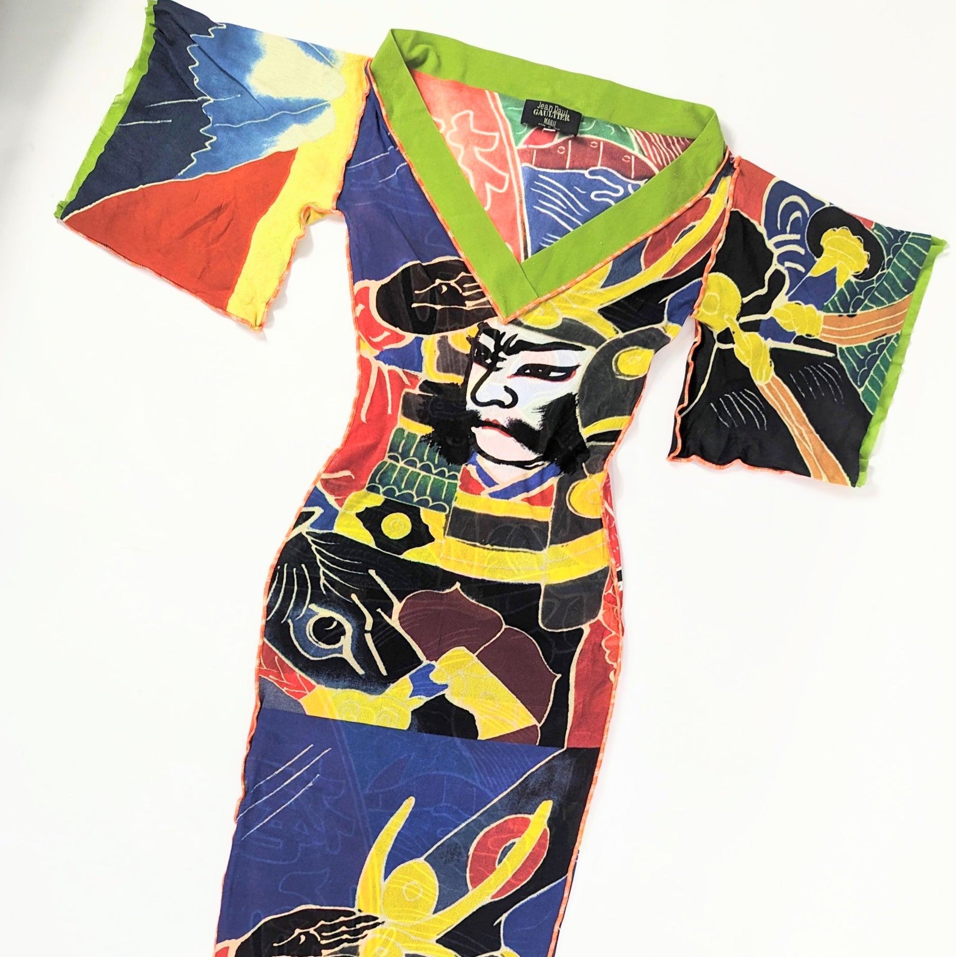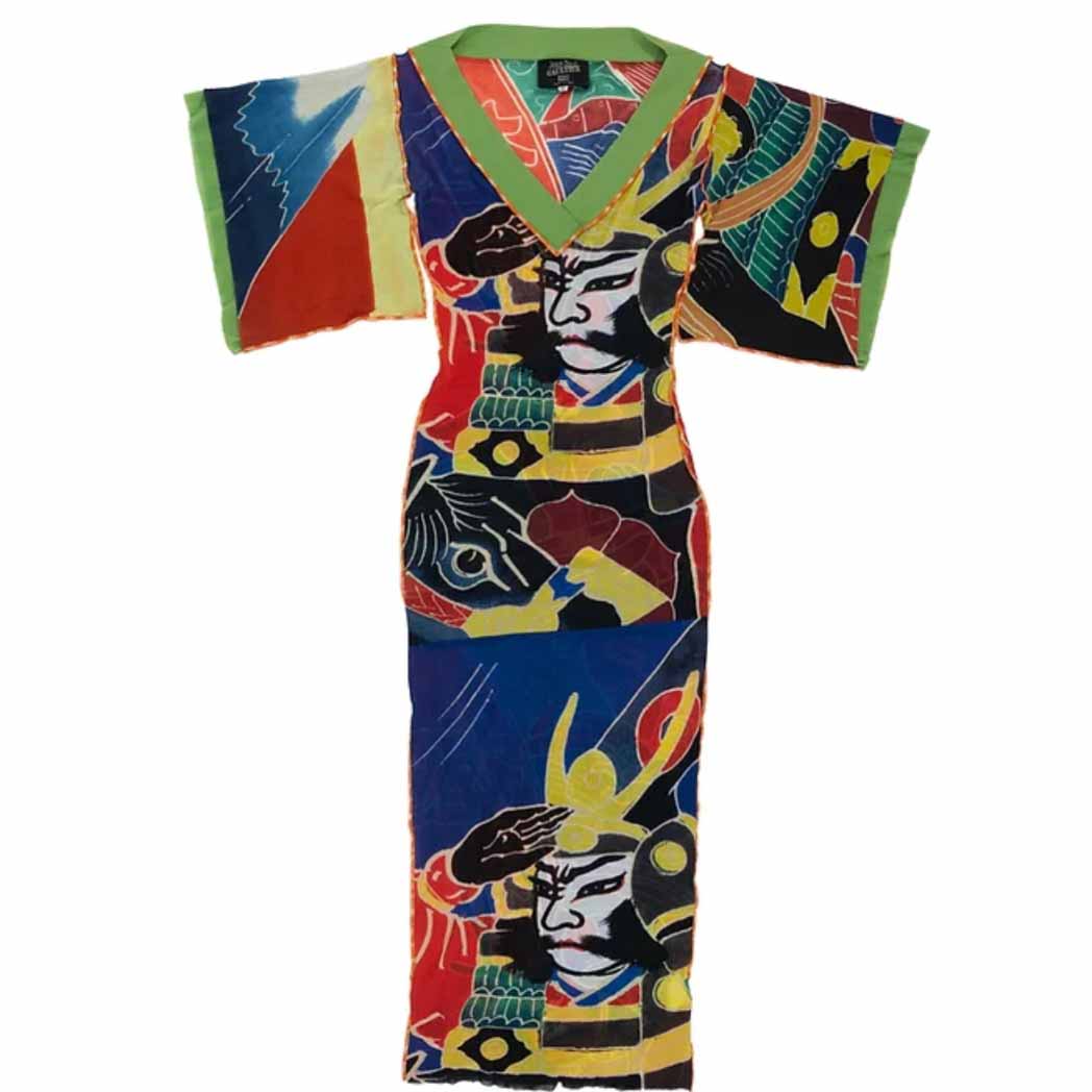 Item: Long vintage bodycon kimono style dress in multicolor knit. Geisha print Multicolored Japanese tourists from the 1999 parade at the Louvre. V-neckline, kimono sleeves with layered green mesh lining. Reverse seam finishes. Raw cut finishes on the bottom. Slightly transparent and stretchy.