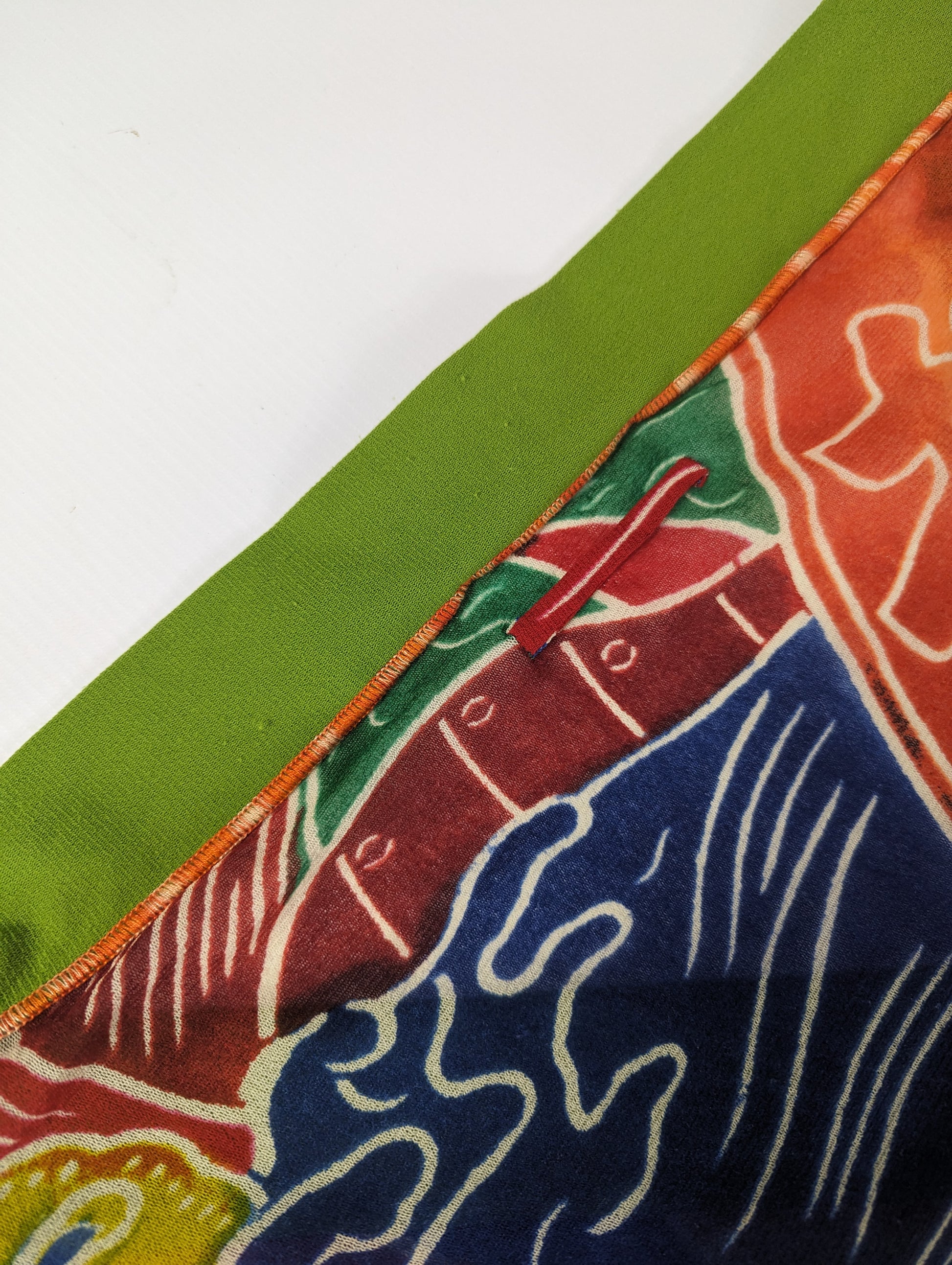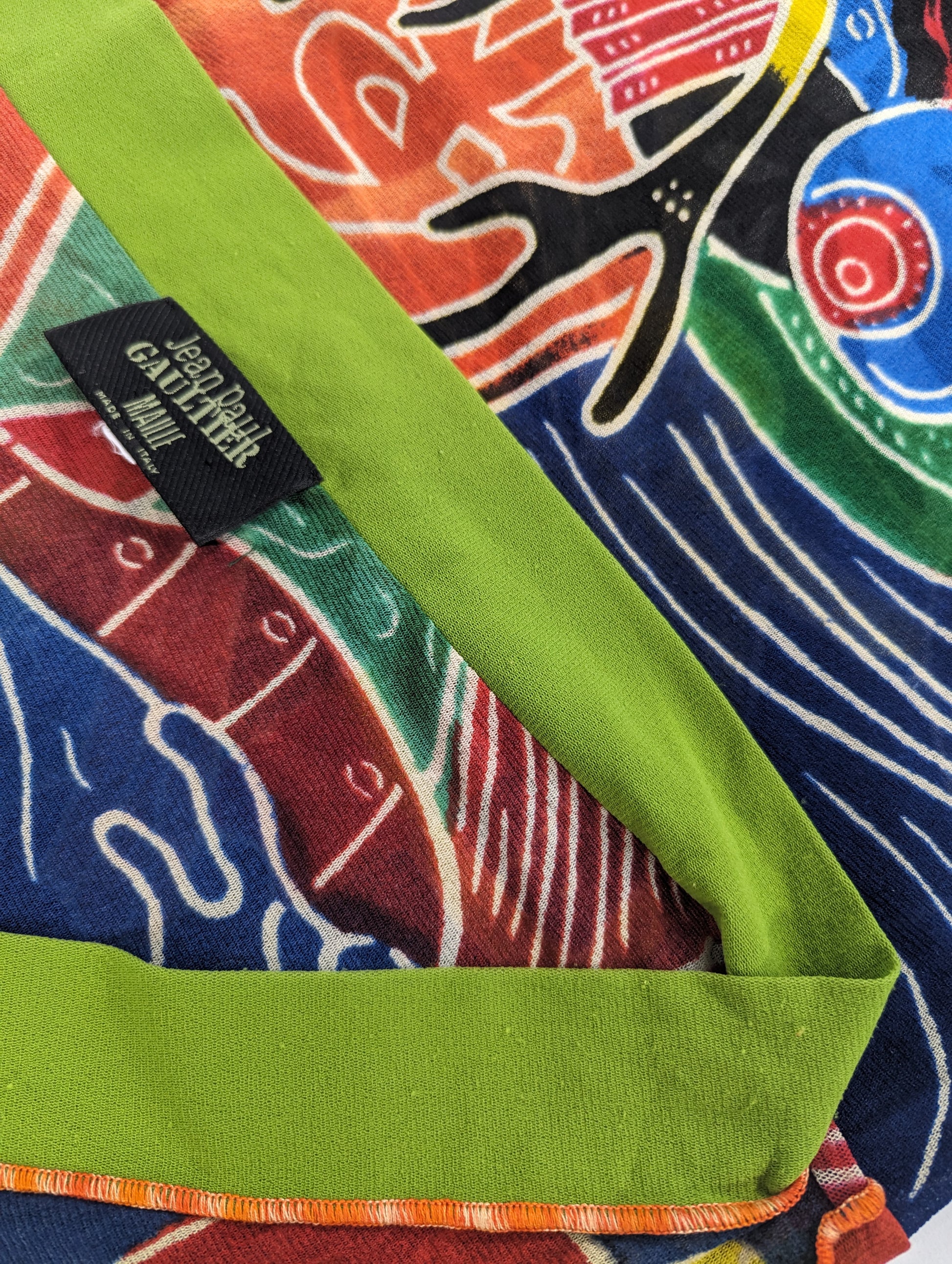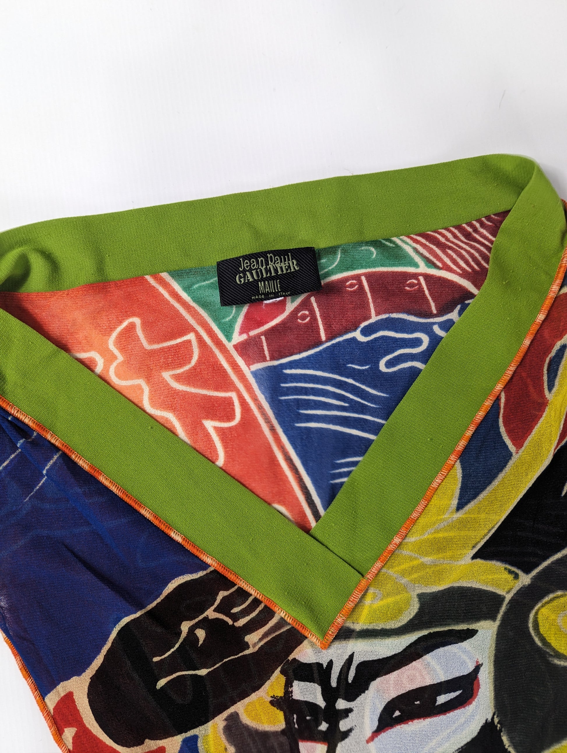 Item: Long vintage bodycon kimono style dress in multicolor knit. Geisha print Multicolored Japanese tourists from the 1999 parade at the Louvre. V-neckline, kimono sleeves with layered green mesh lining. Reverse seam finishes. Raw cut finishes on the bottom. Slightly transparent and stretchy.