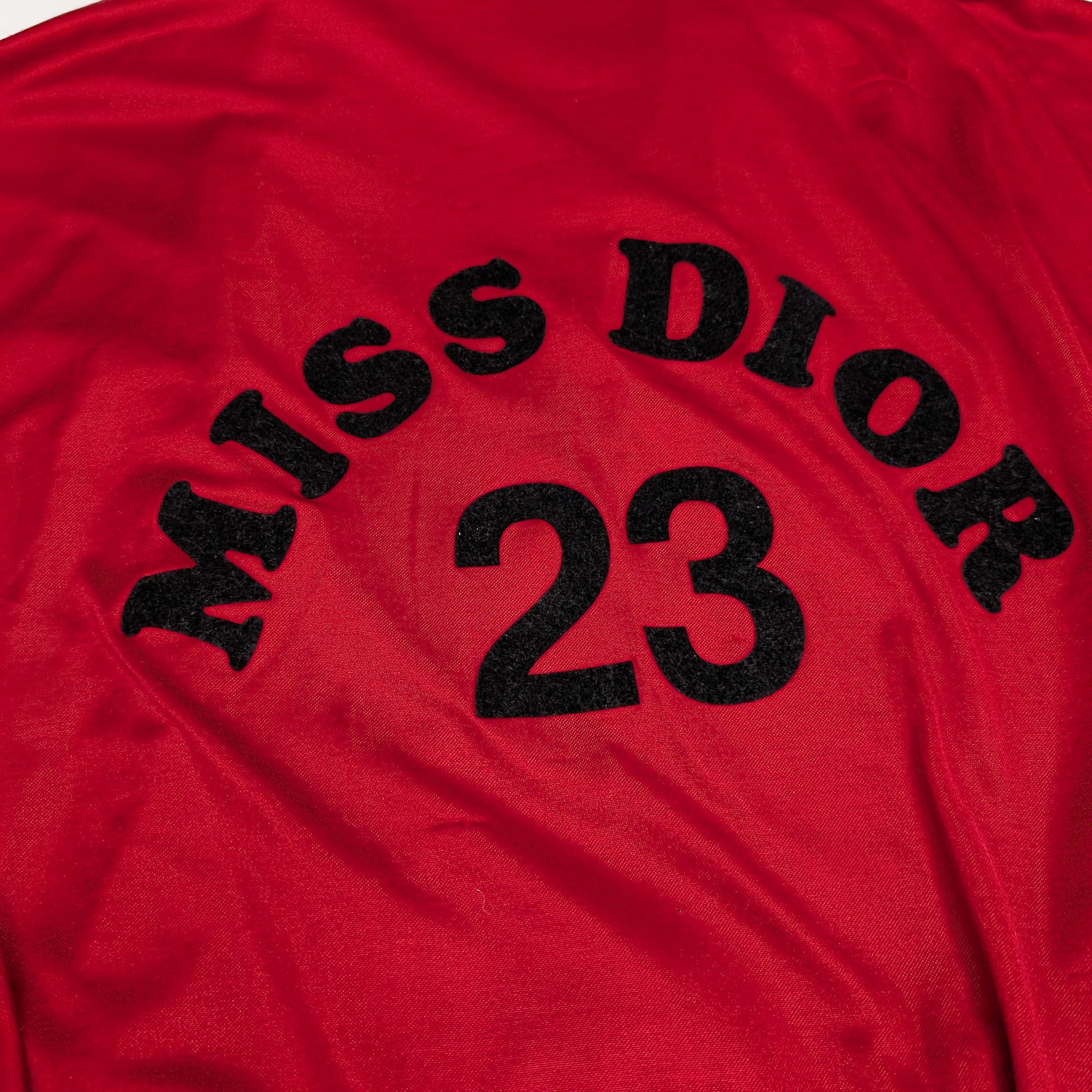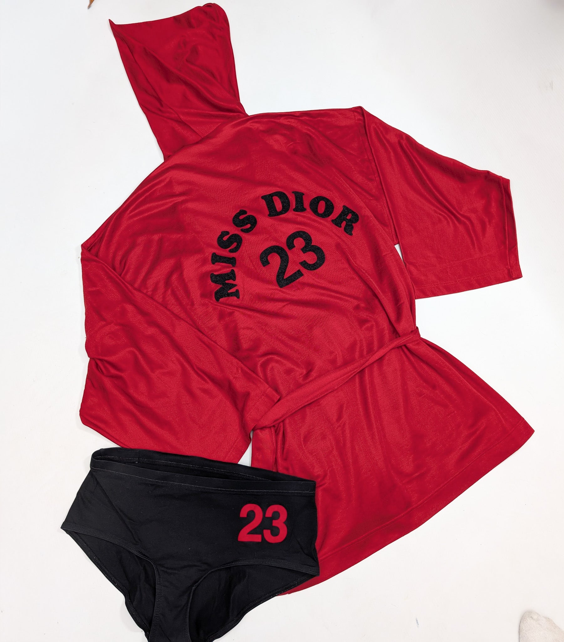 Item: Kimono-style belted robe dress with hood. "Miss Dior 23" inscription in red and black. Matching panties.