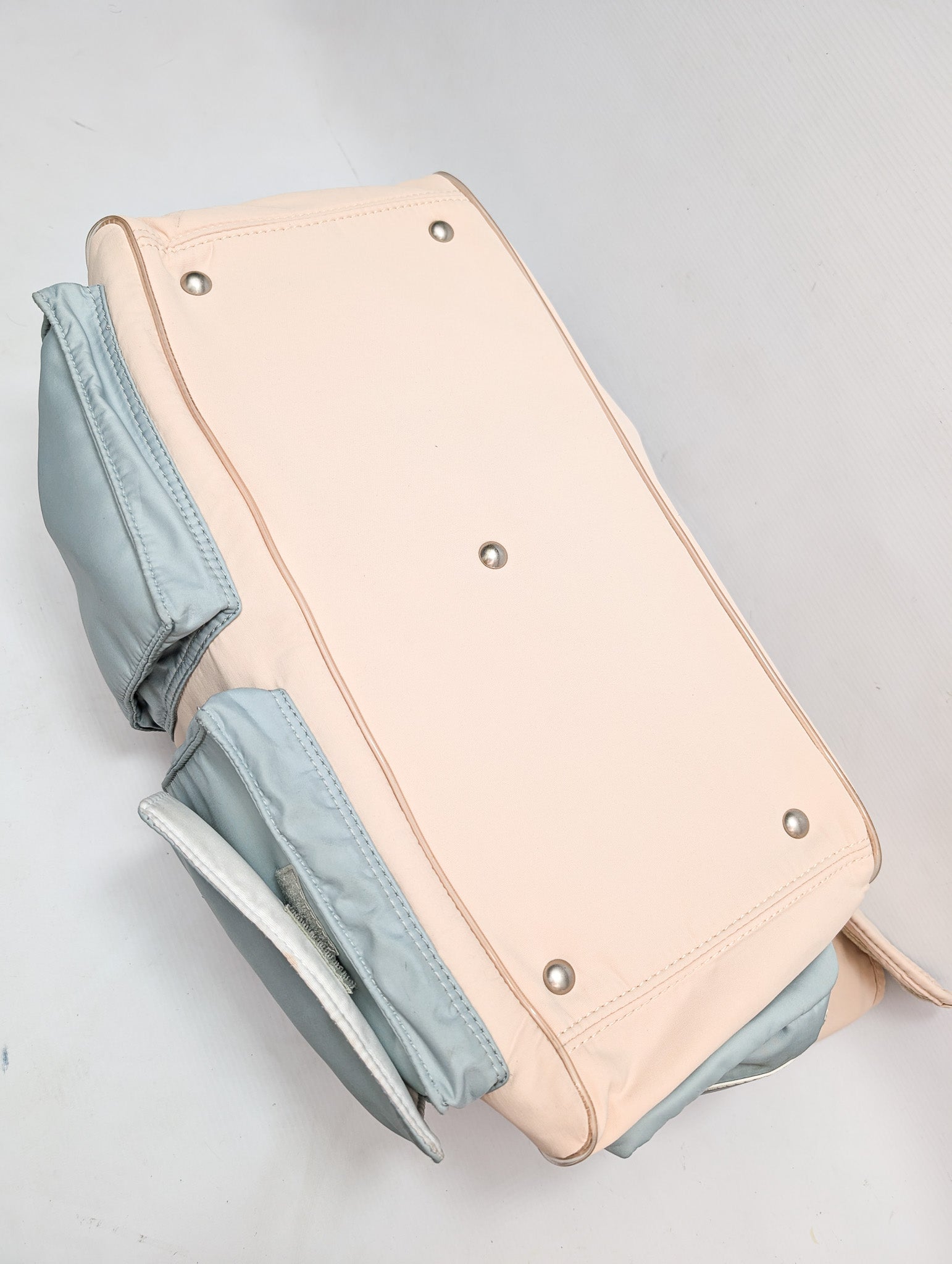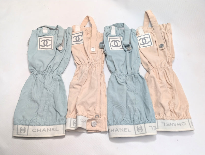 Item : Chanel Messenger shoulder bag and set of two Gaiter (pink and blue). Features two large pockets on the front, one on the side with the Chanel CC logo, and a large pocket on the back of the bag.