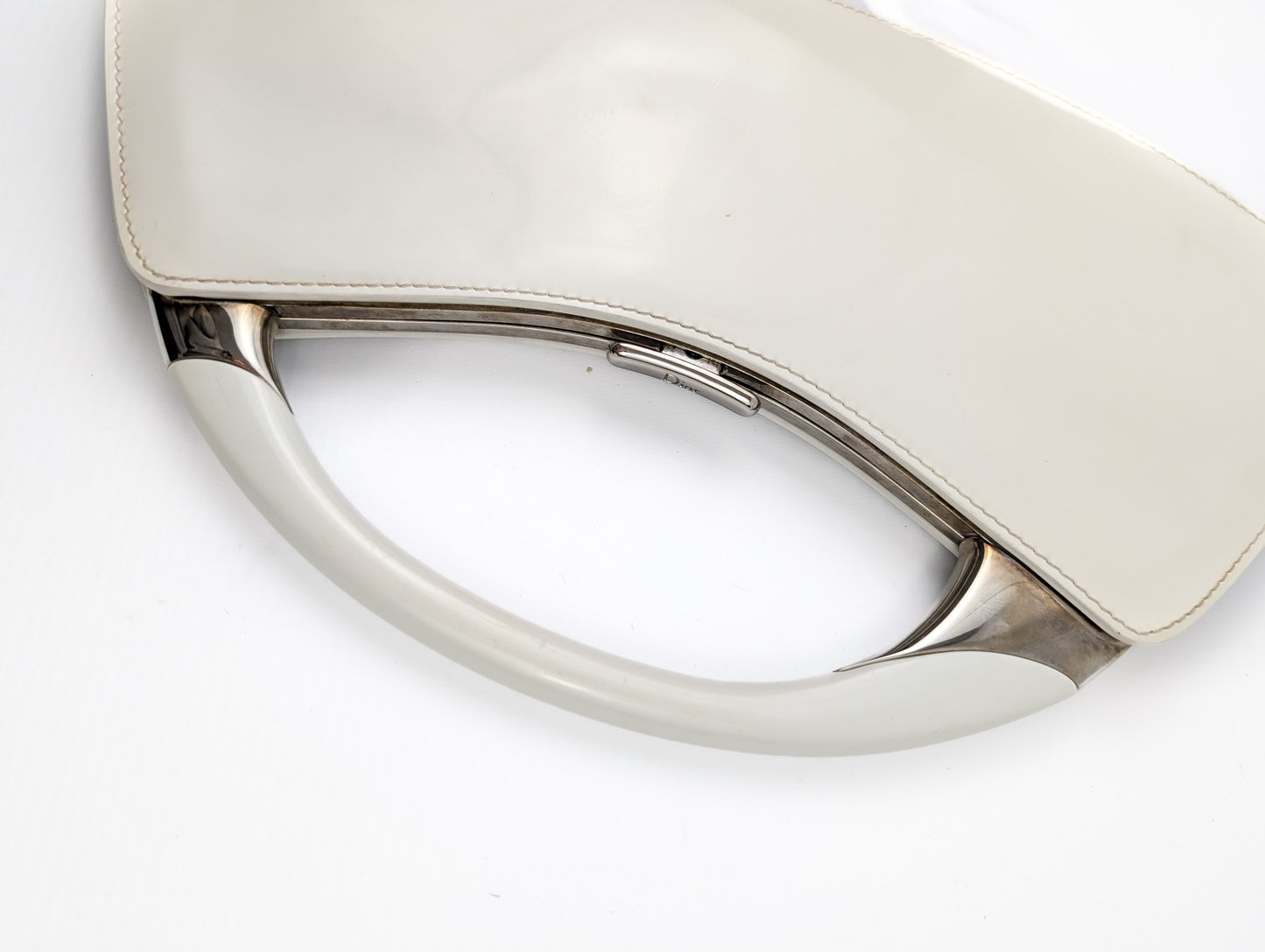 Item: White patent leather handbag adorned with bondage-inspired straps with a silver "Dior" plaque and Dior monogram lining. Silver top handle. The interior leather tag is stamped Christian Dior Paris with the serial code on the opposite side.