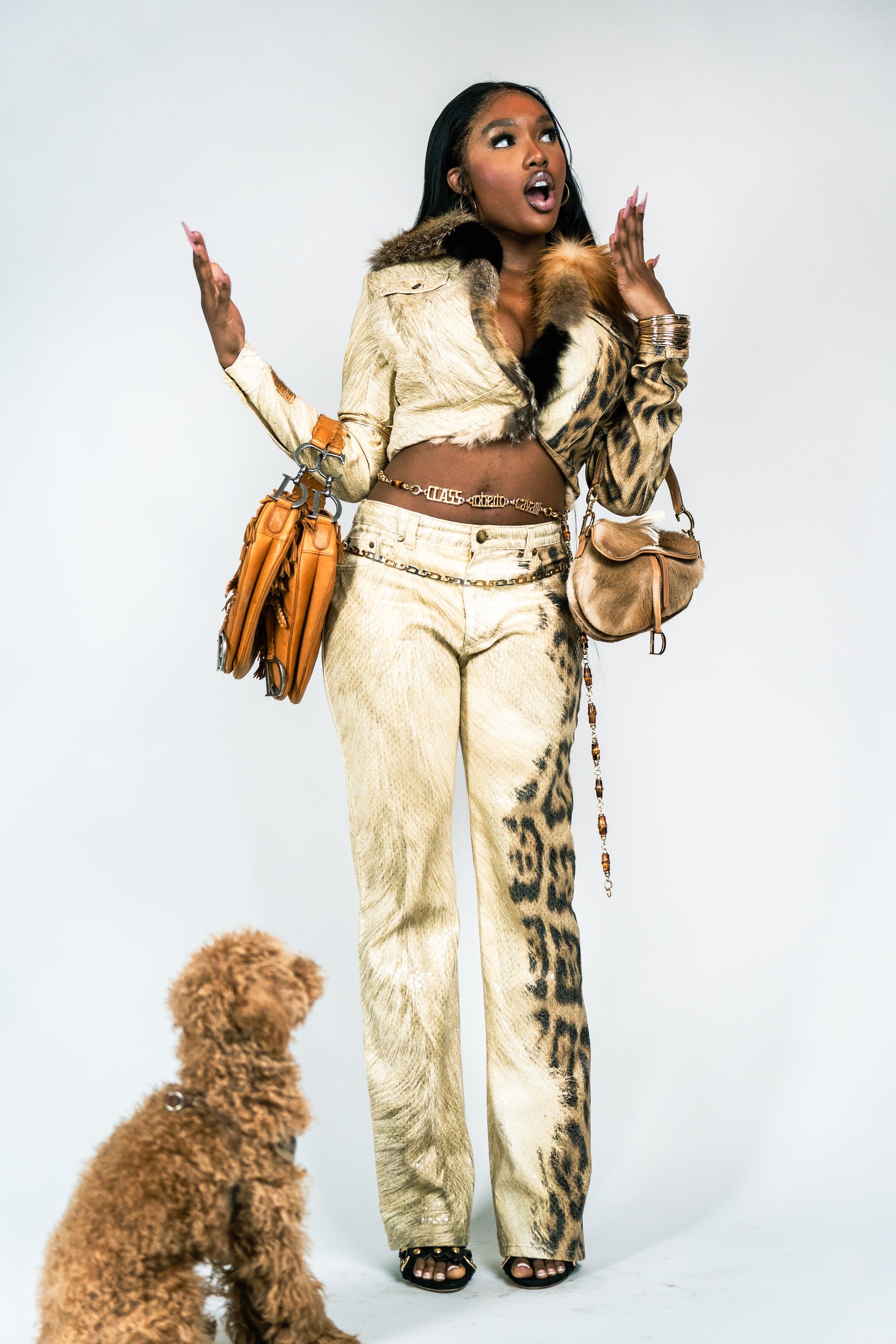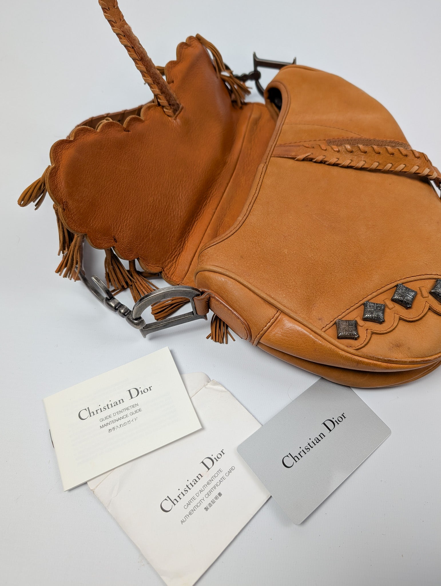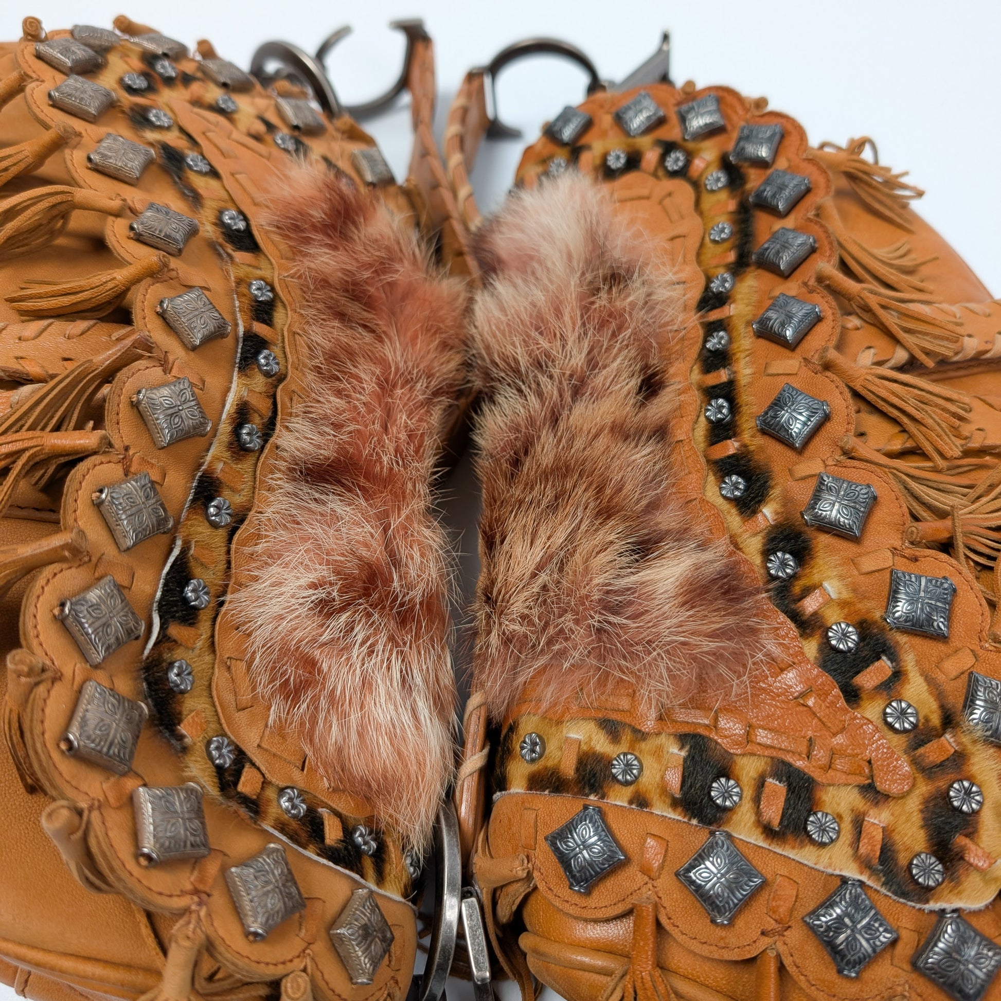 Item: Brown leather saddle decorated with studs and rabbit fur.