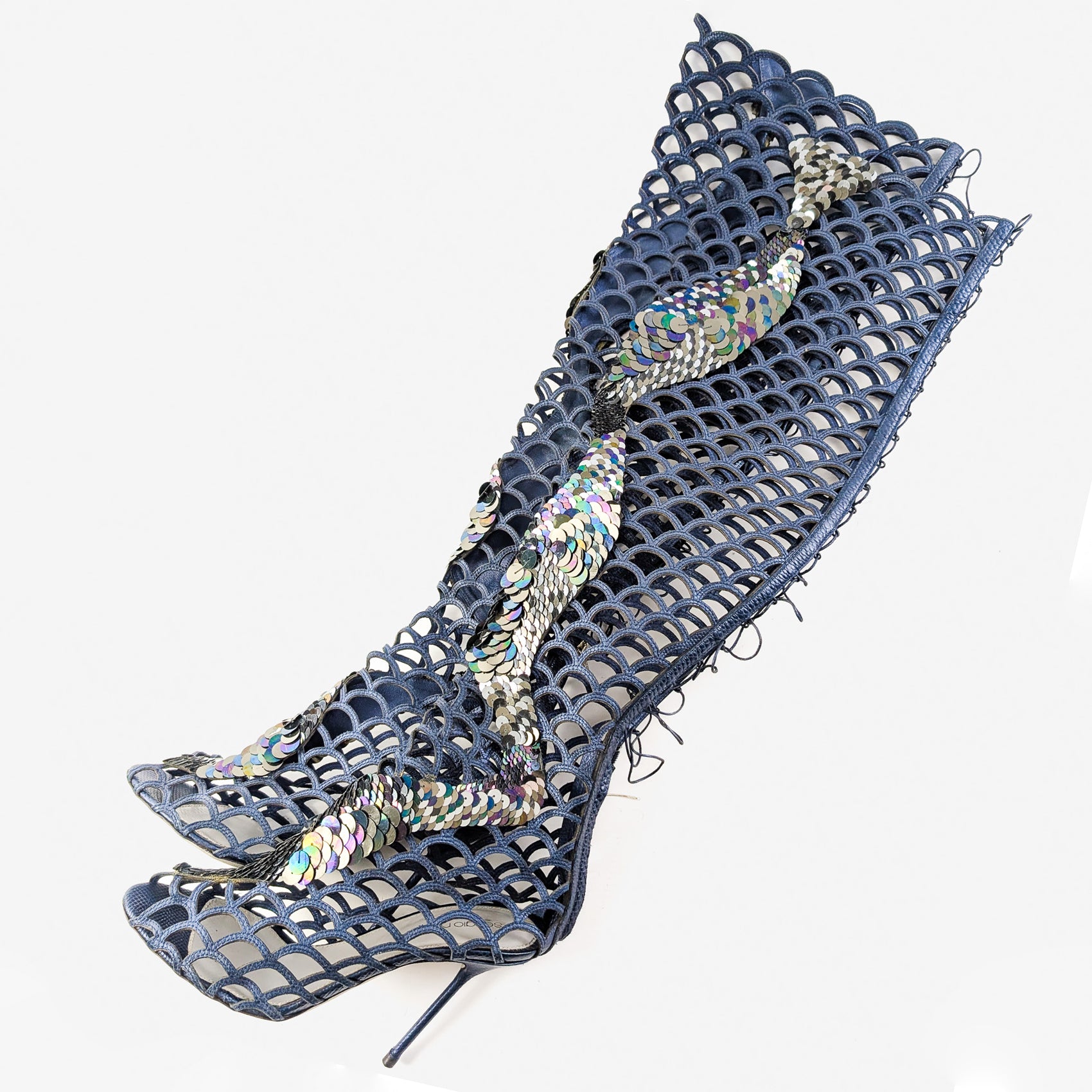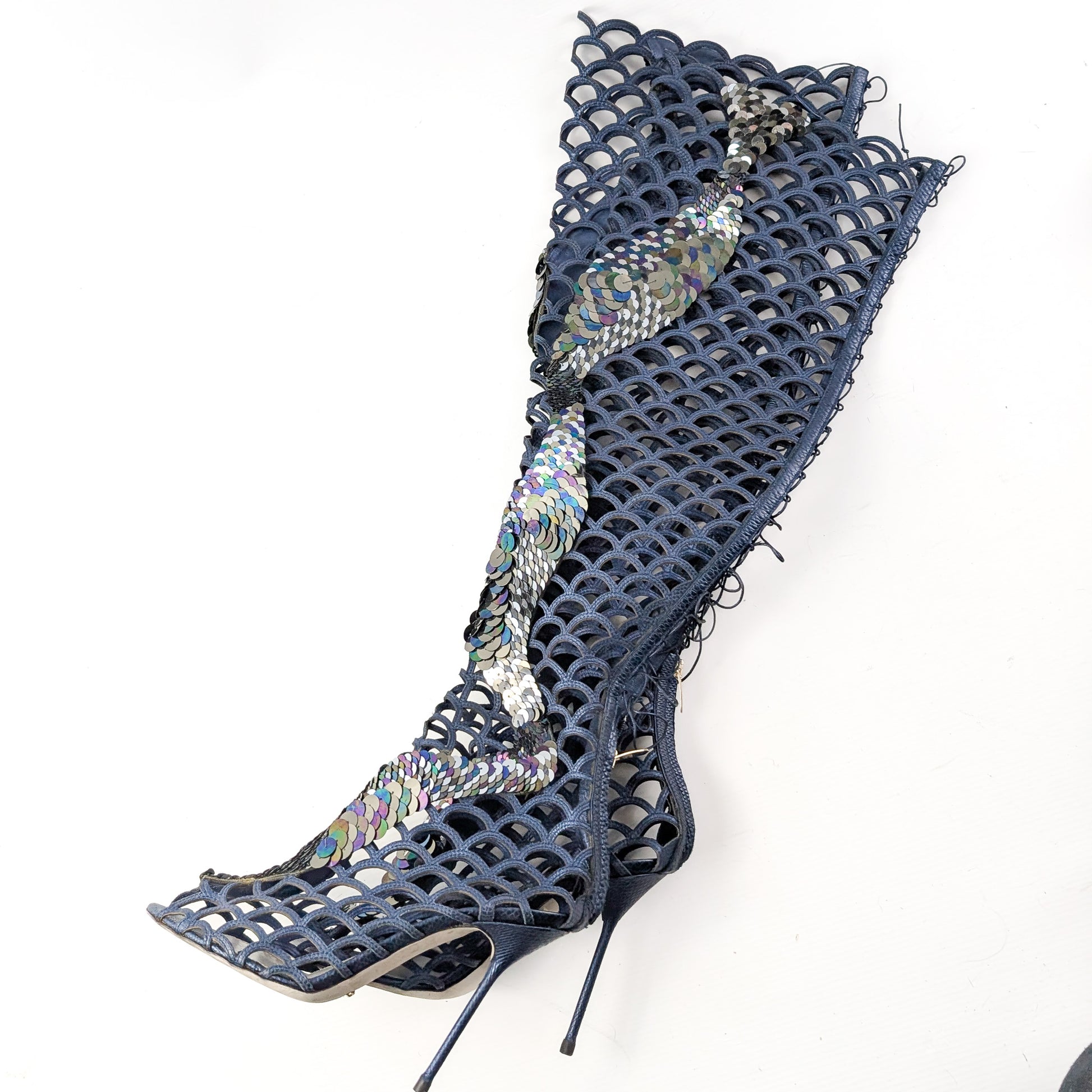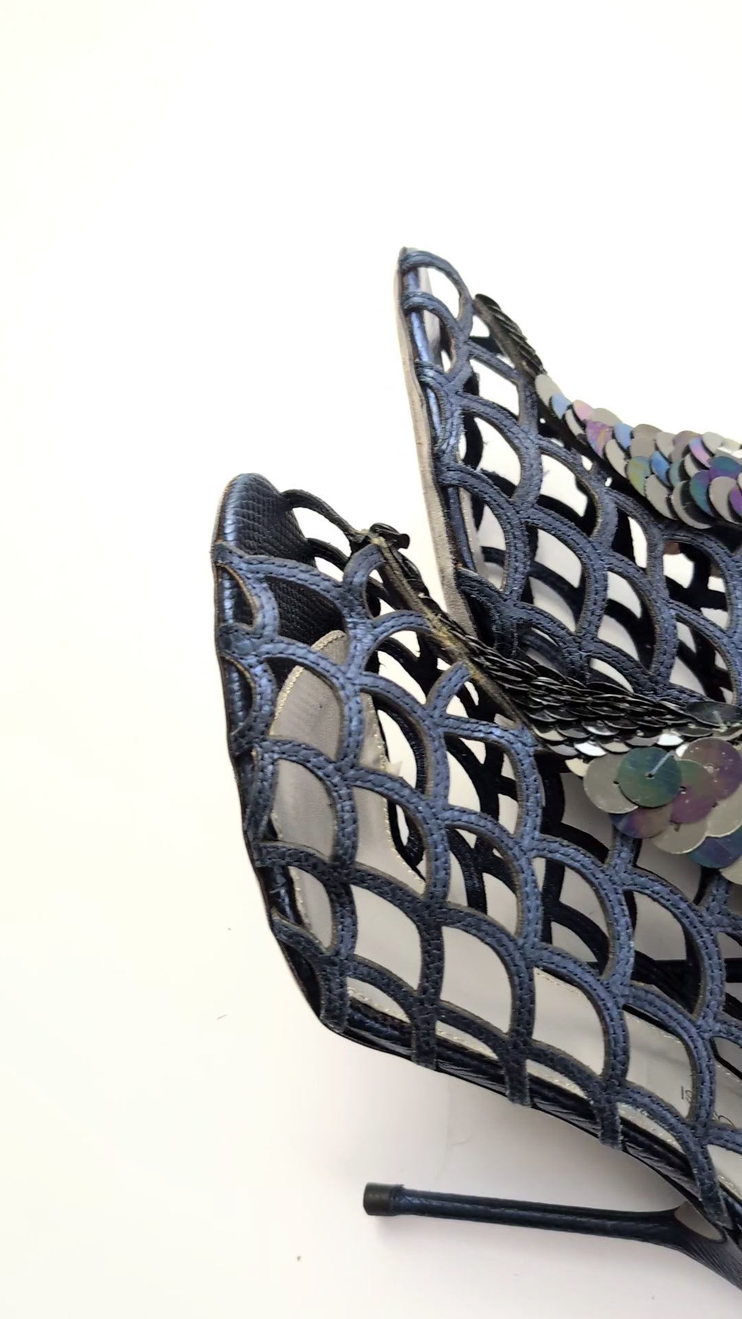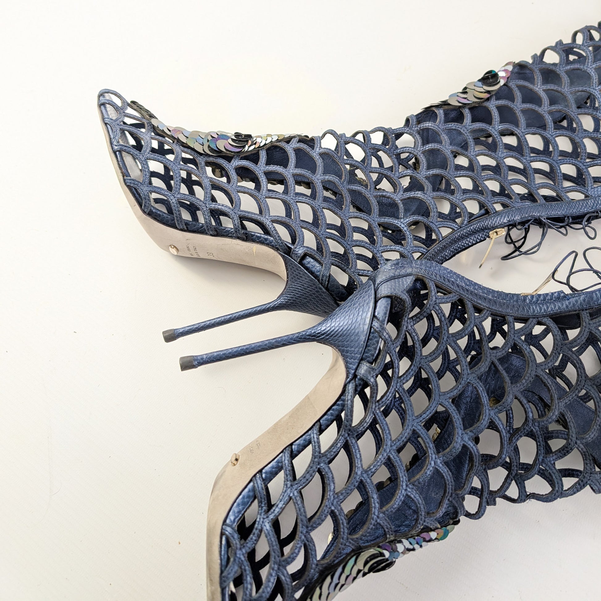 Item: Sergio Rossi Cage high sandals. Midnight blue. Rhinestone fish on the front.
