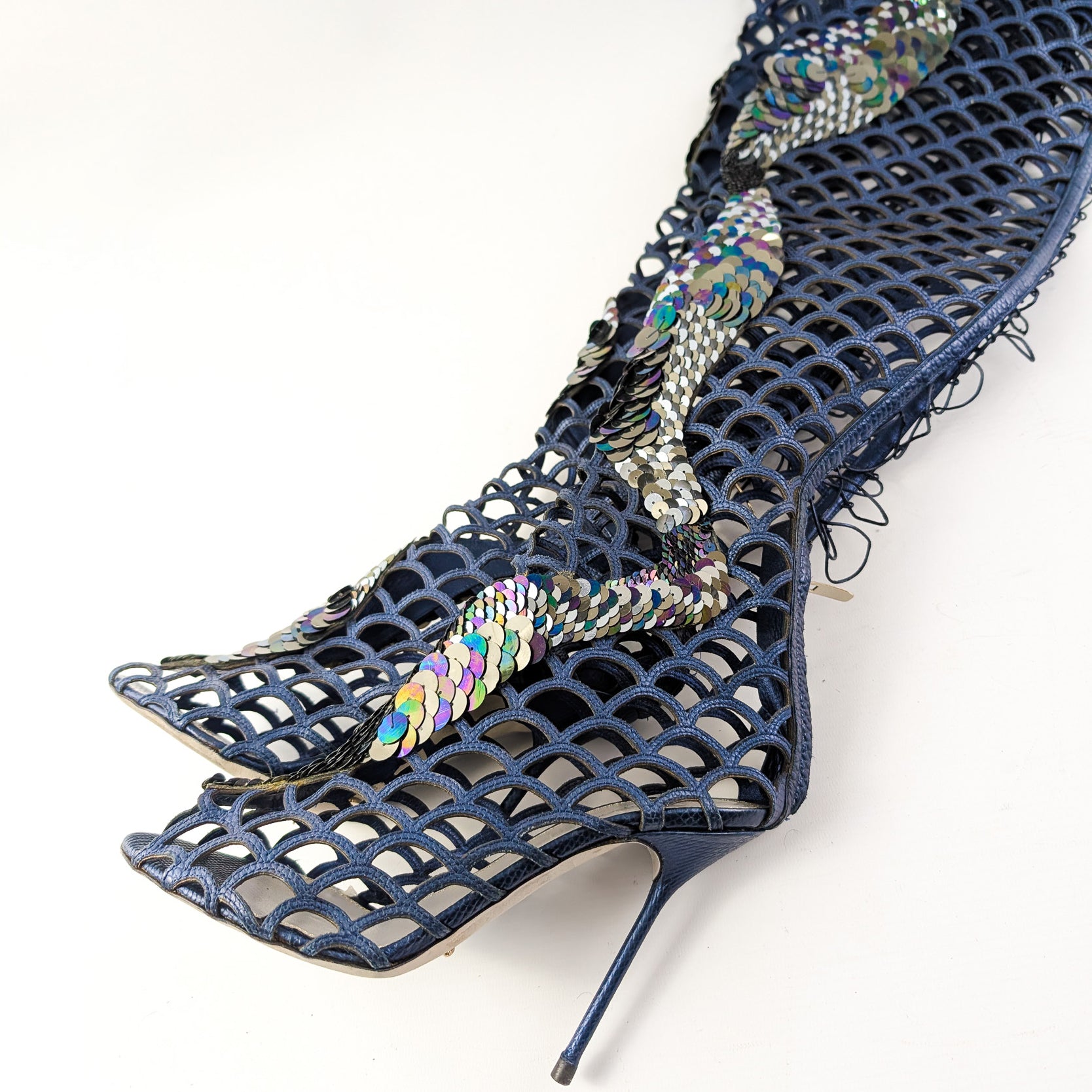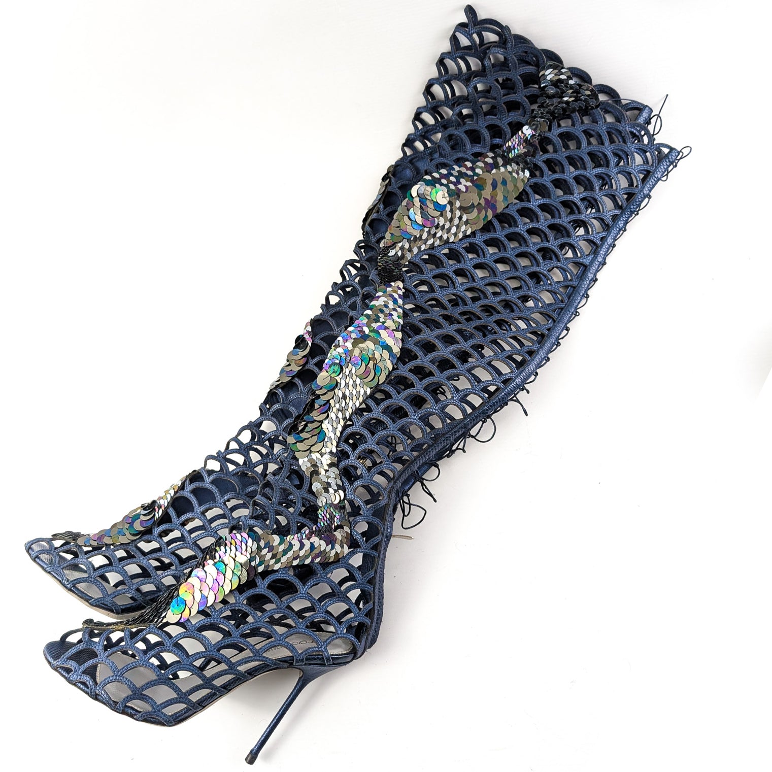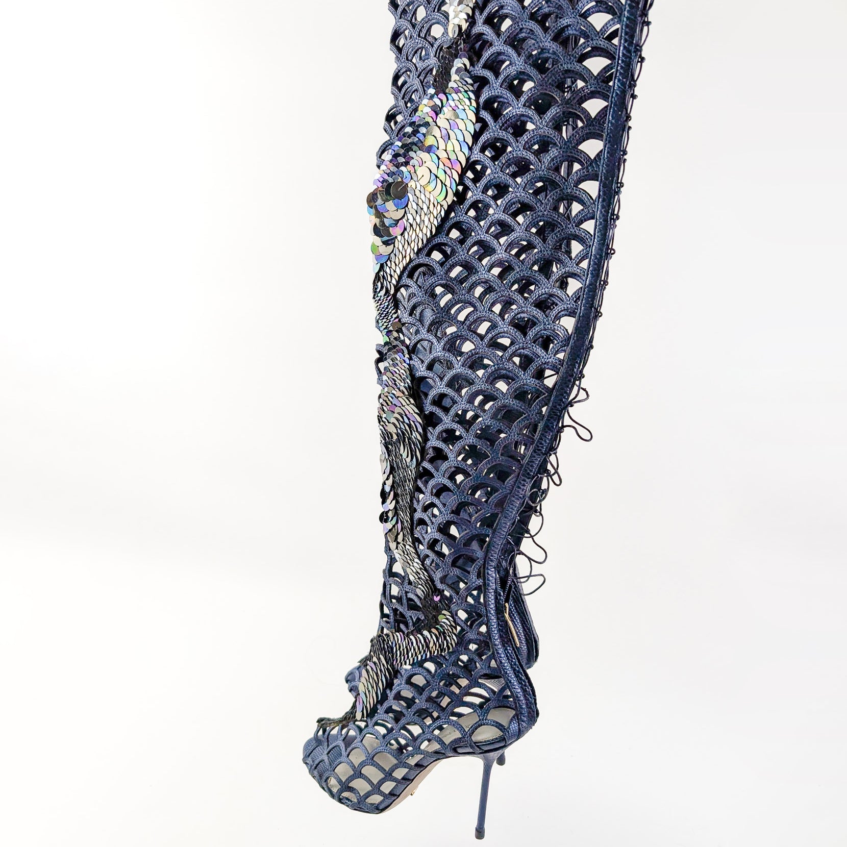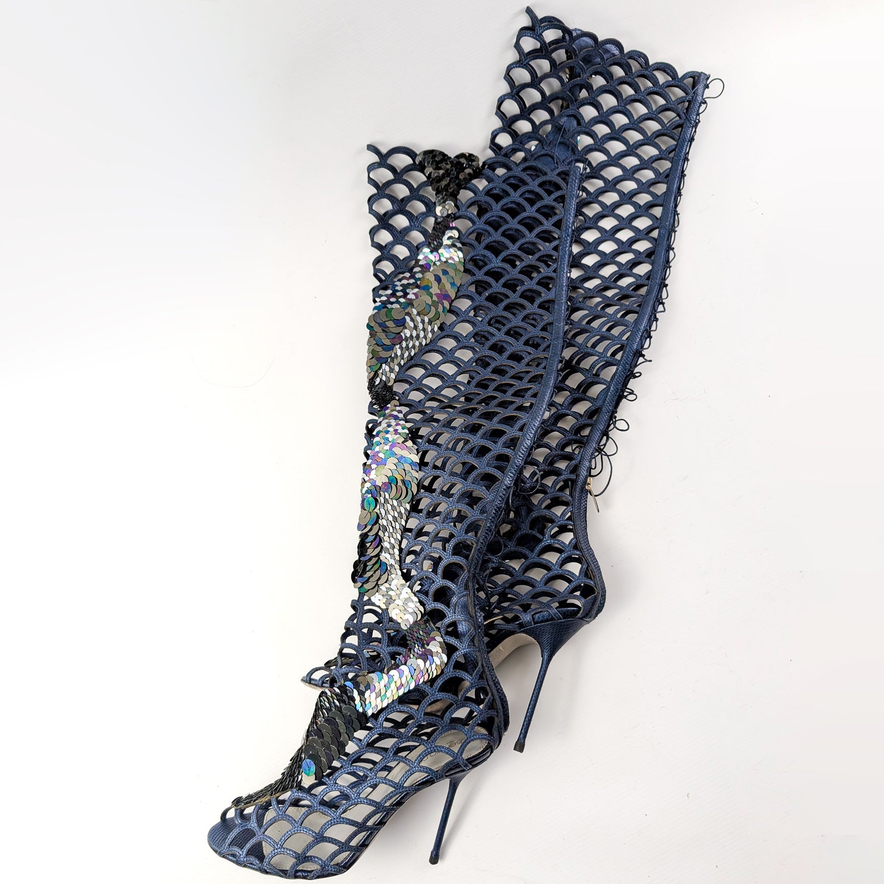 Item: Sergio Rossi Cage high sandals. Midnight blue. Rhinestone fish on the front.