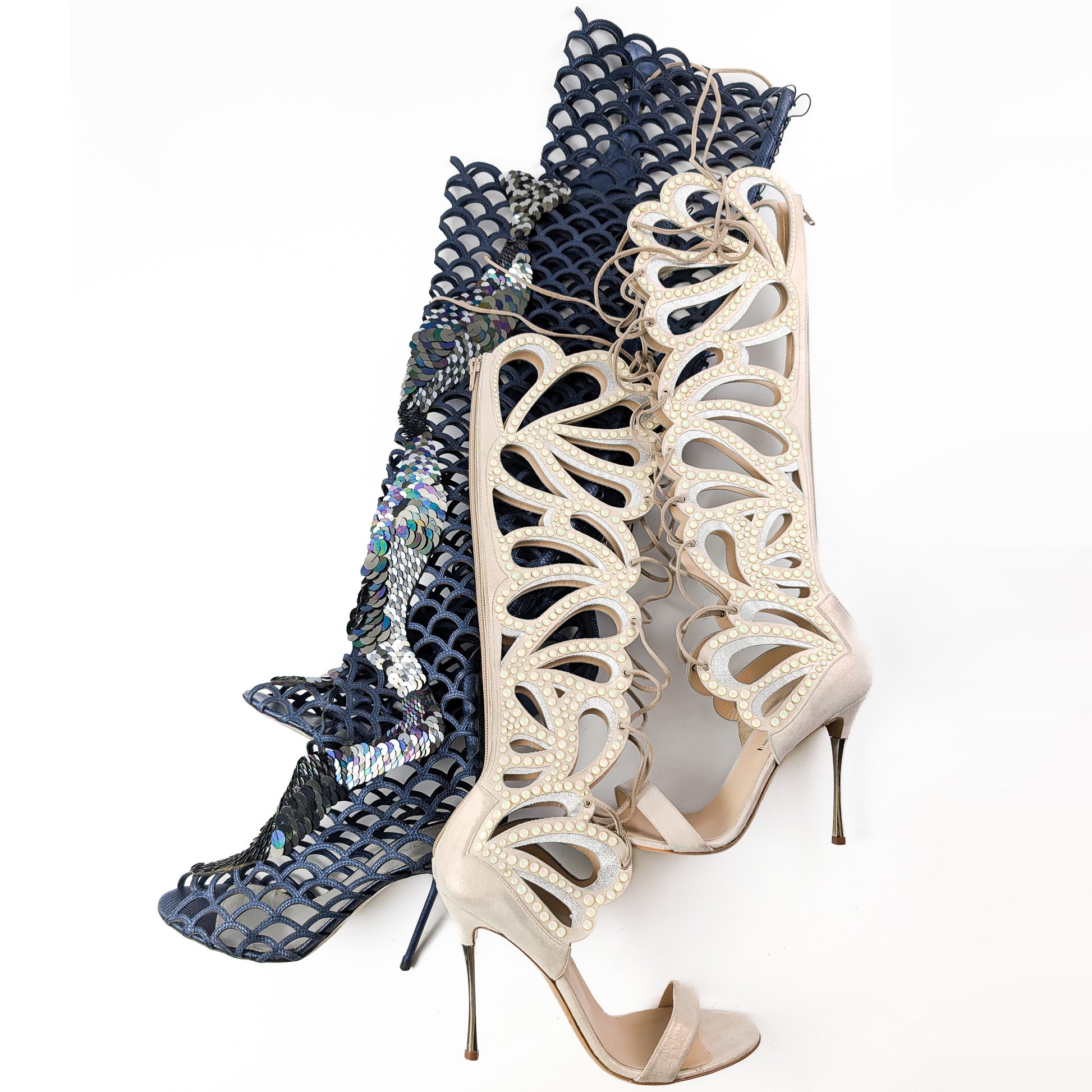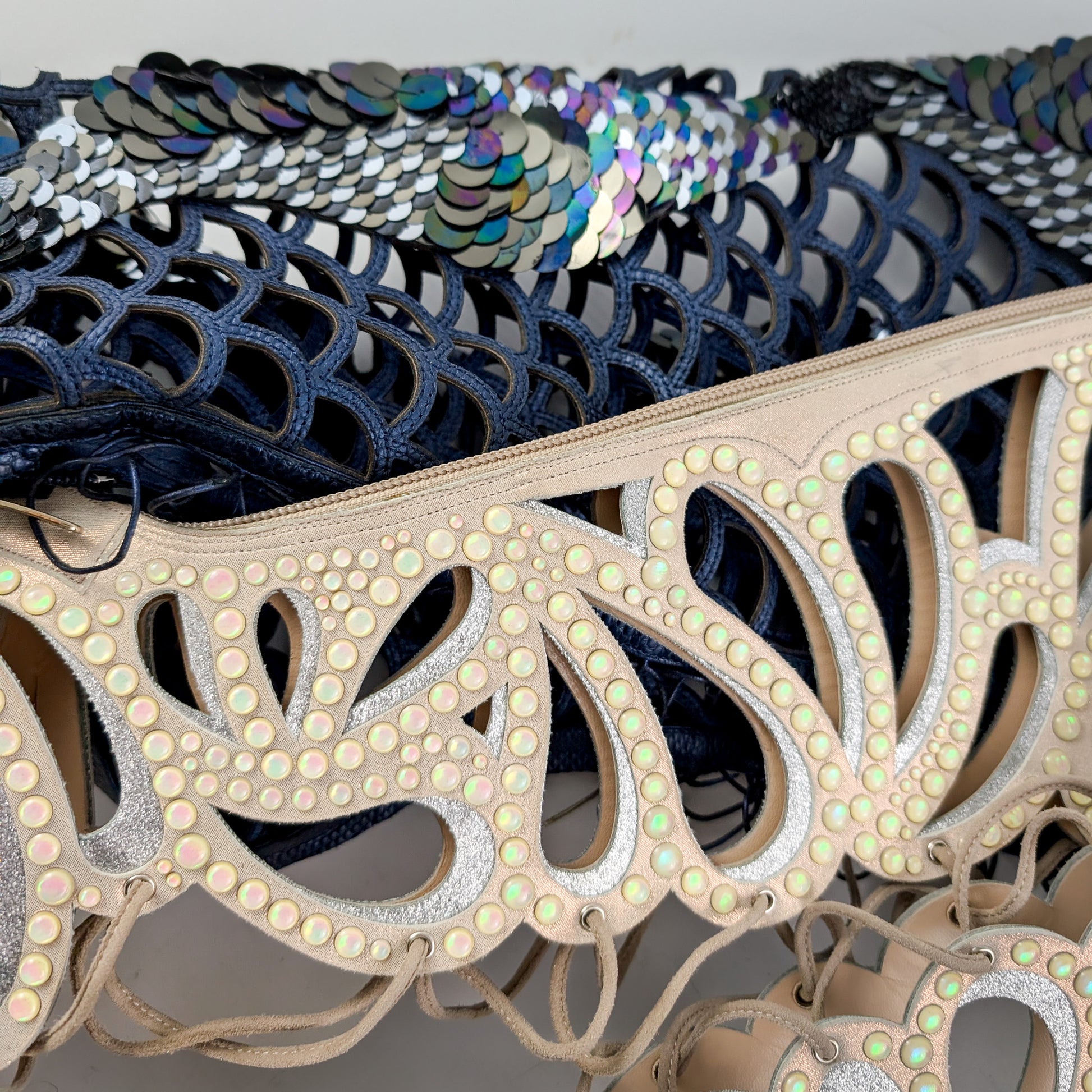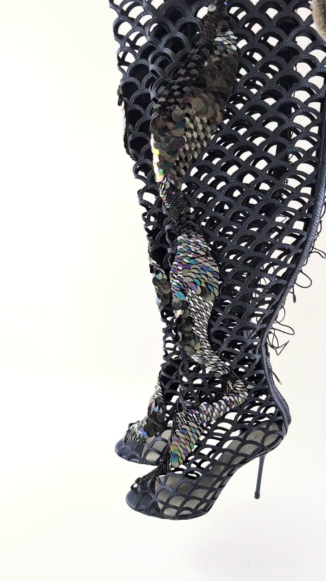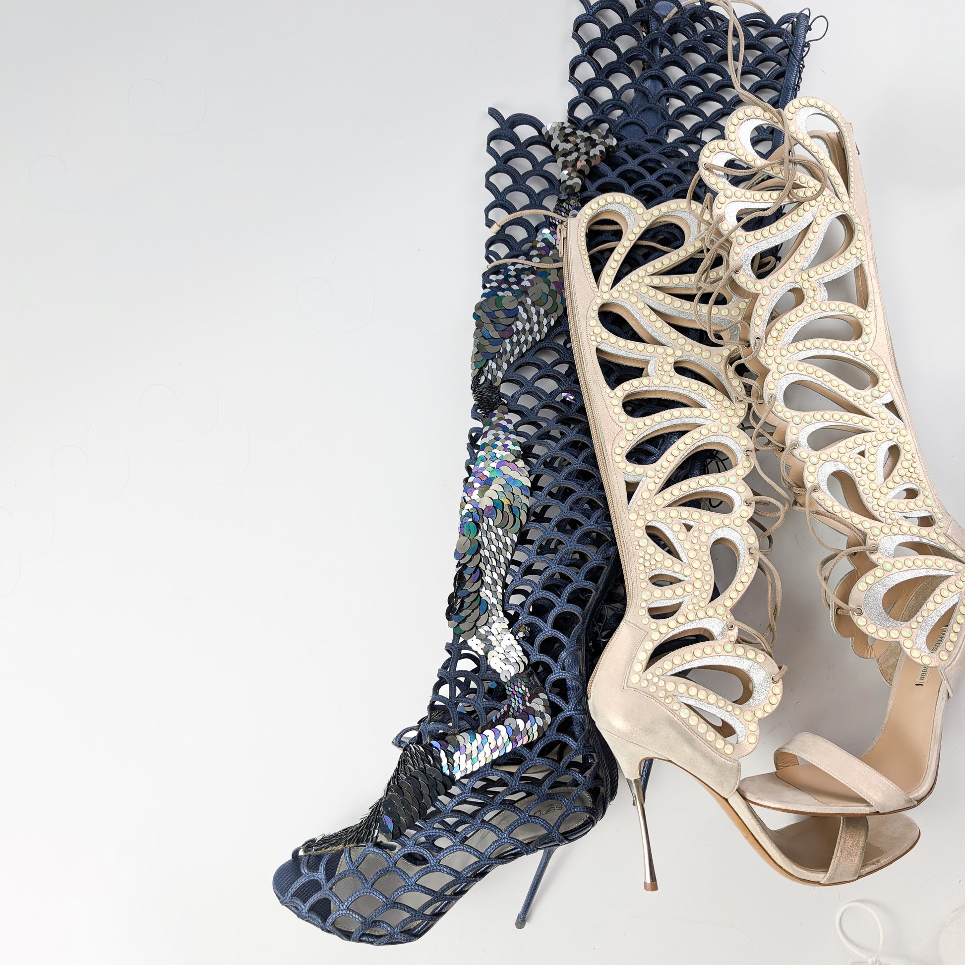 Item: Sergio Rossi Cage high sandals. Midnight blue. Rhinestone fish on the front.
