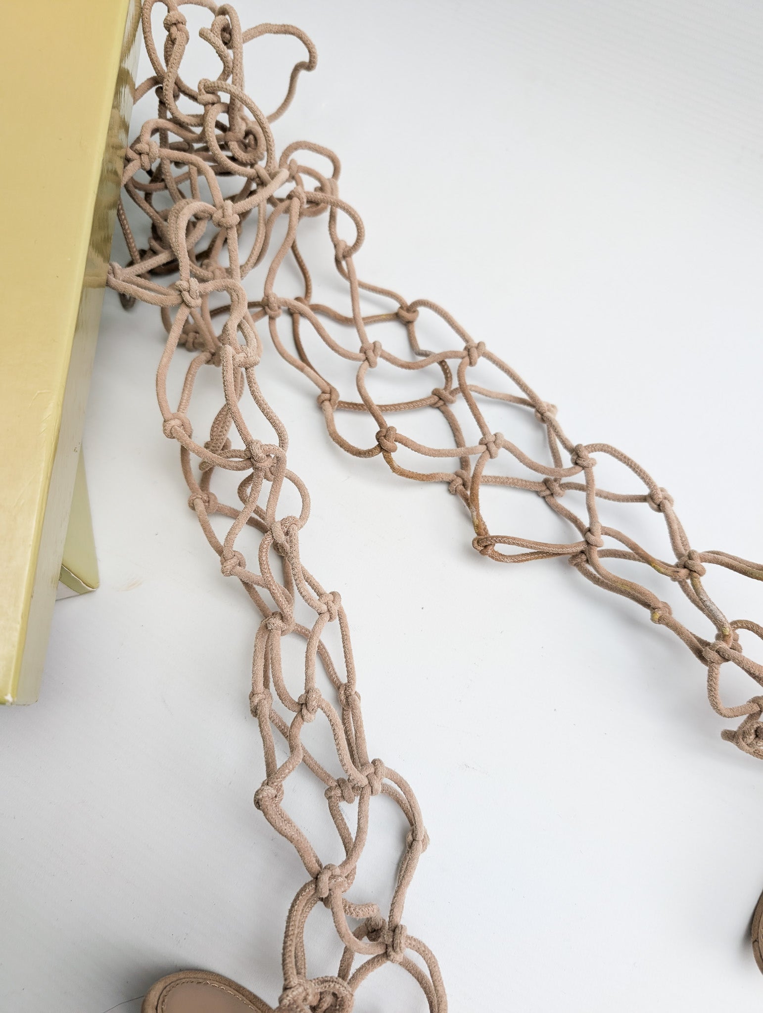Item: Nude sandals adorned with elastic mesh by Sergio Rossi.