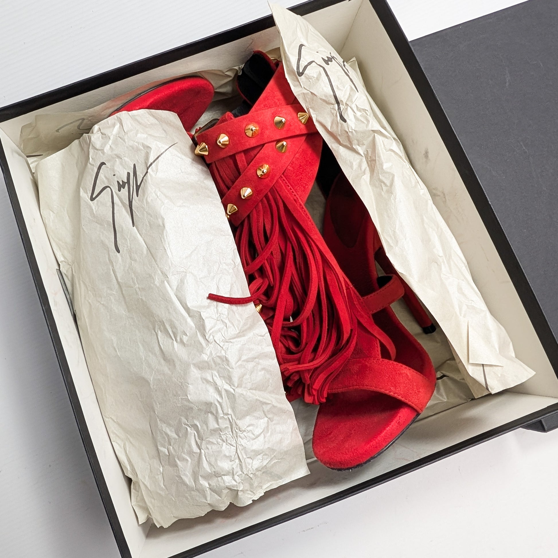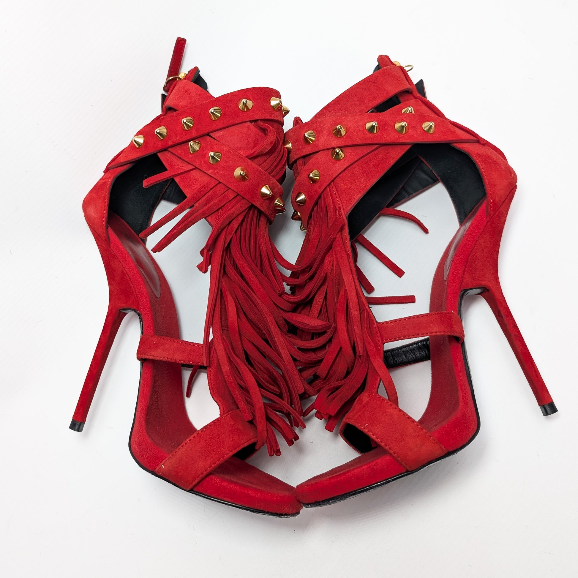 Item: Red suede sandals with fringe trim by Giuseppe Zanotti