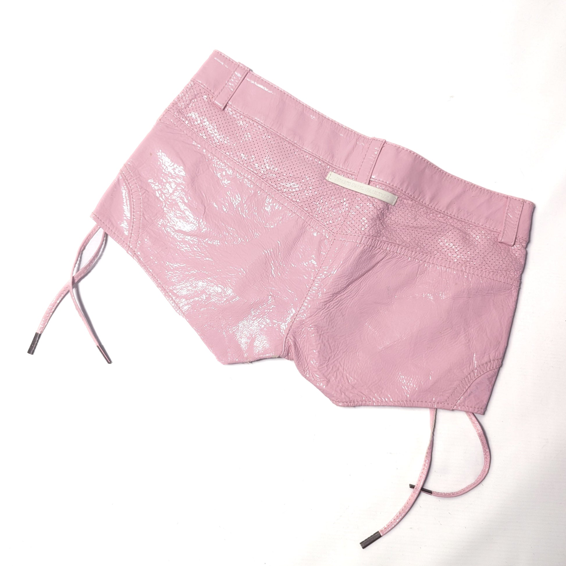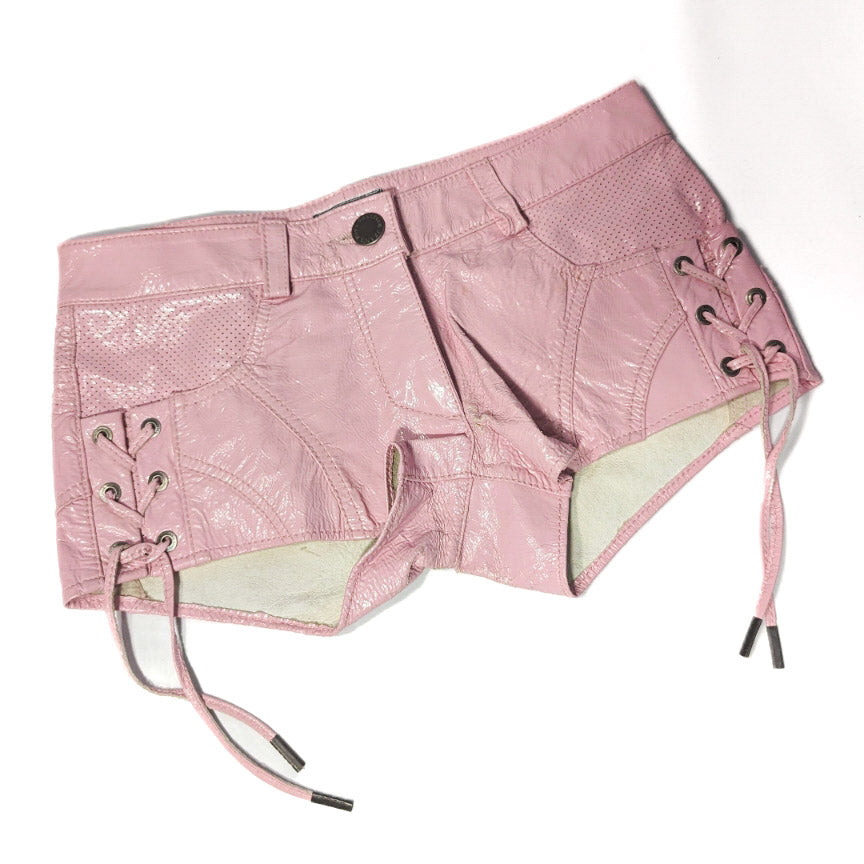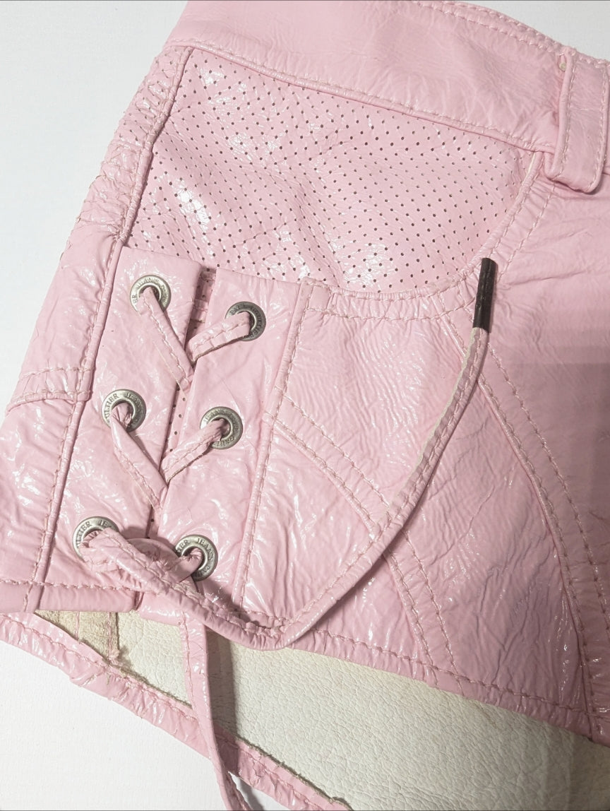 Item: Pink low-waisted leather shorts decorated with lace on each side and logo on the back.