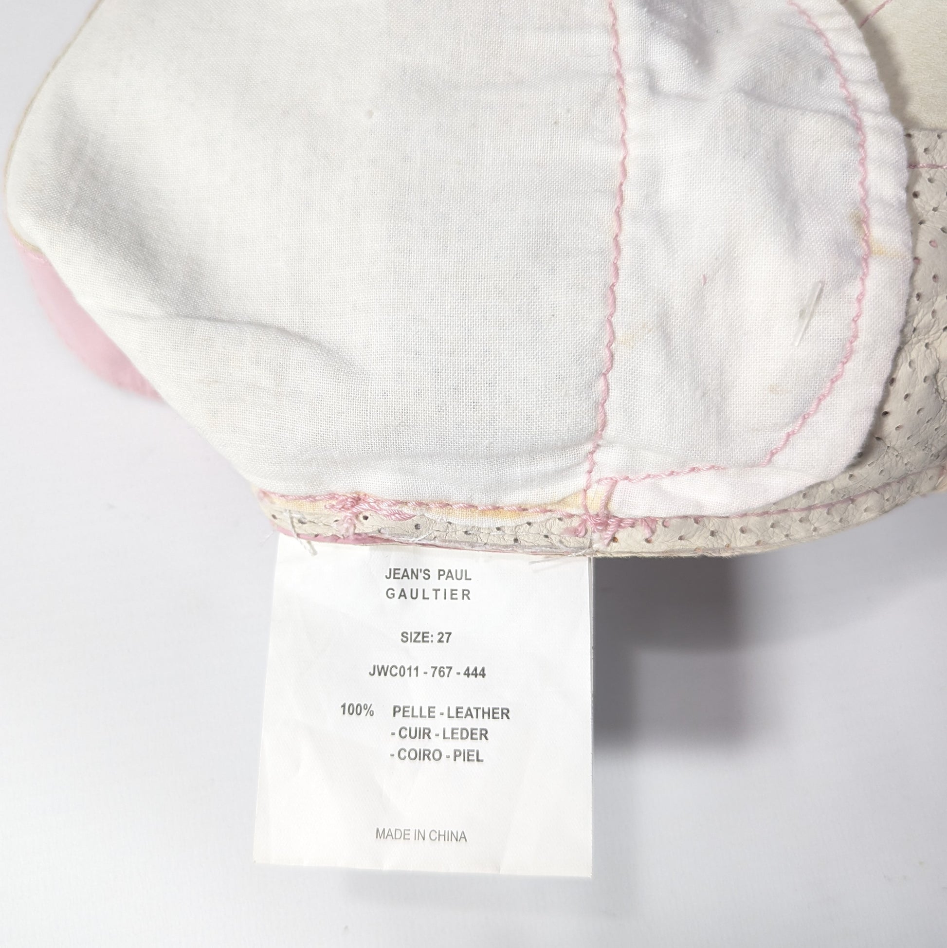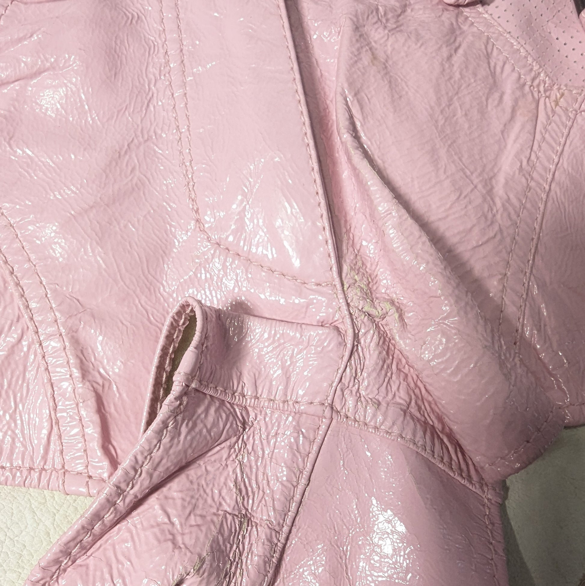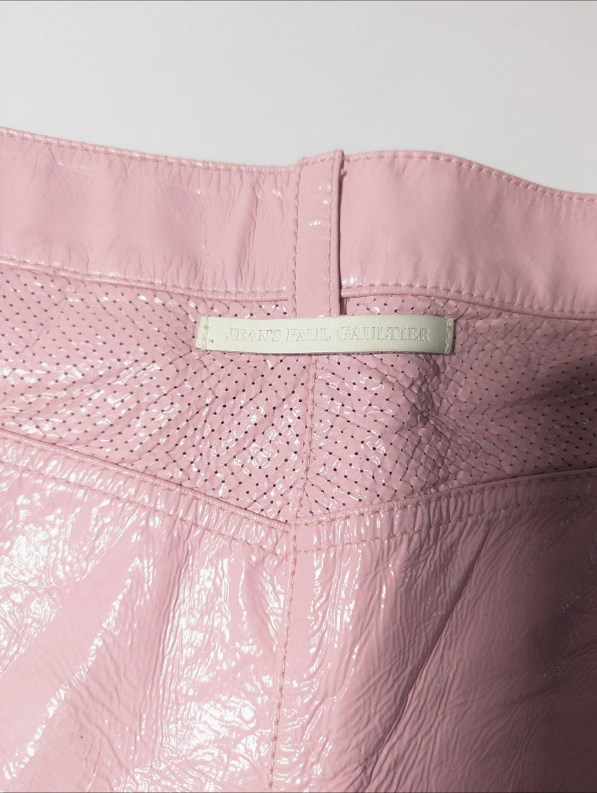 Item: Pink low-waisted leather shorts decorated with lace on each side and logo on the back.