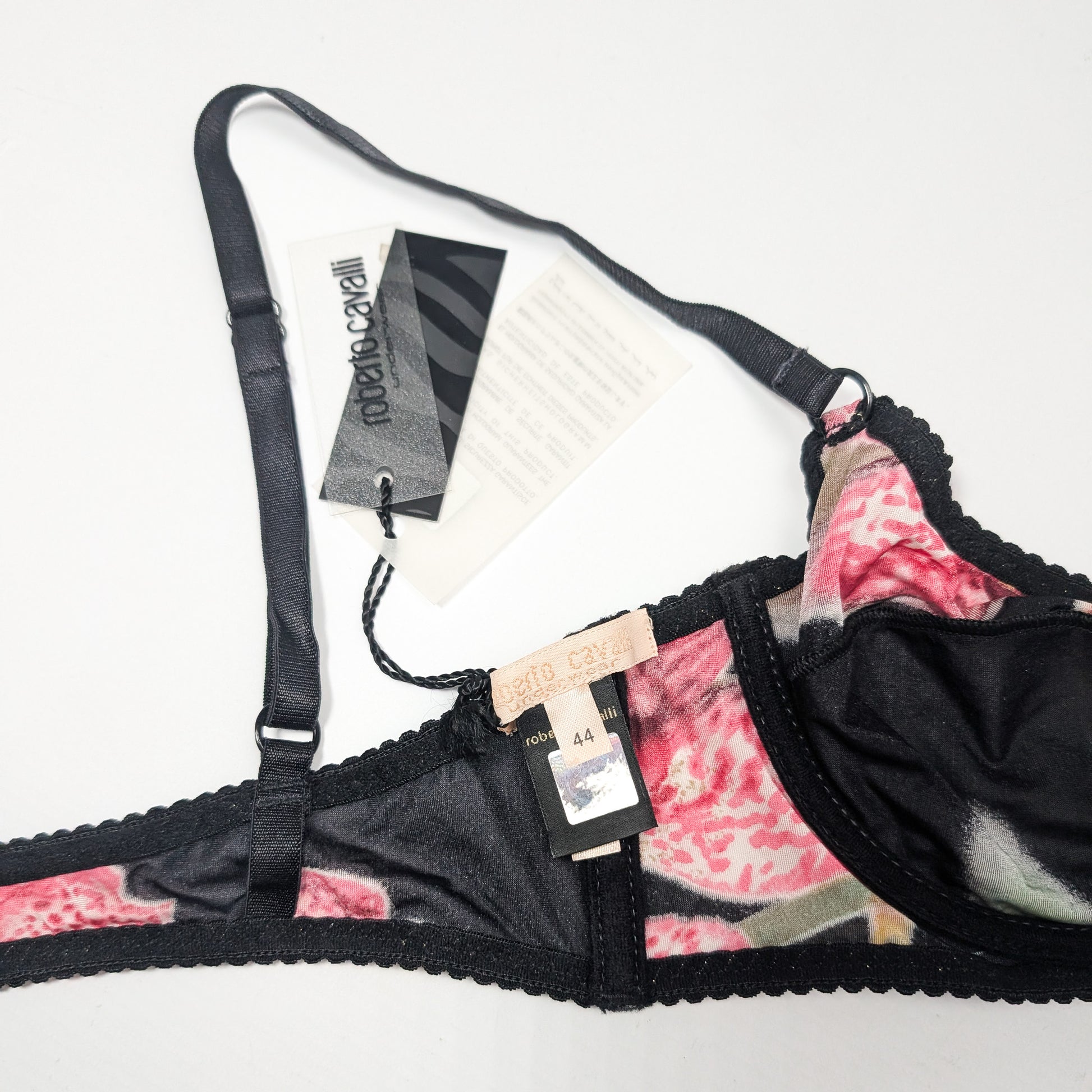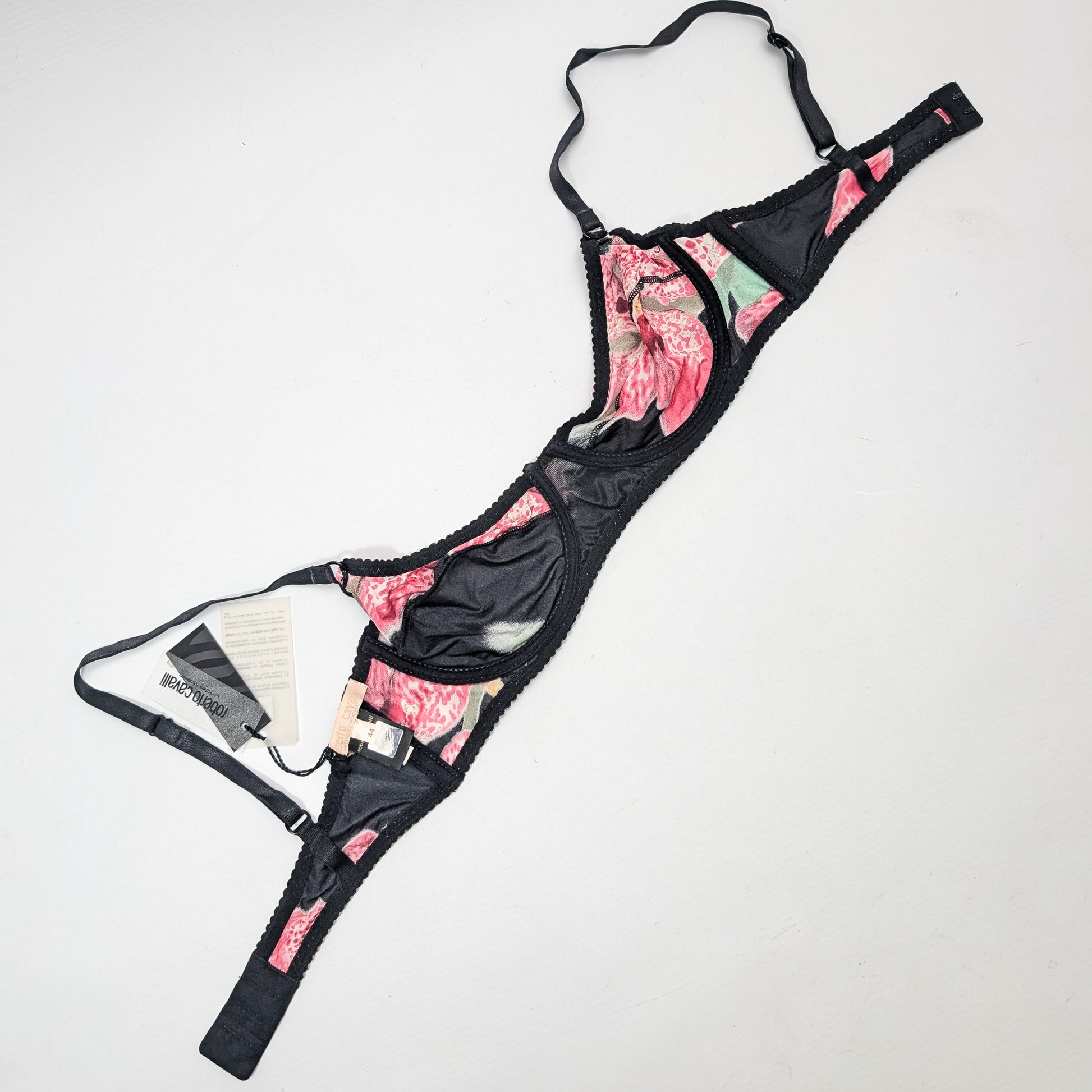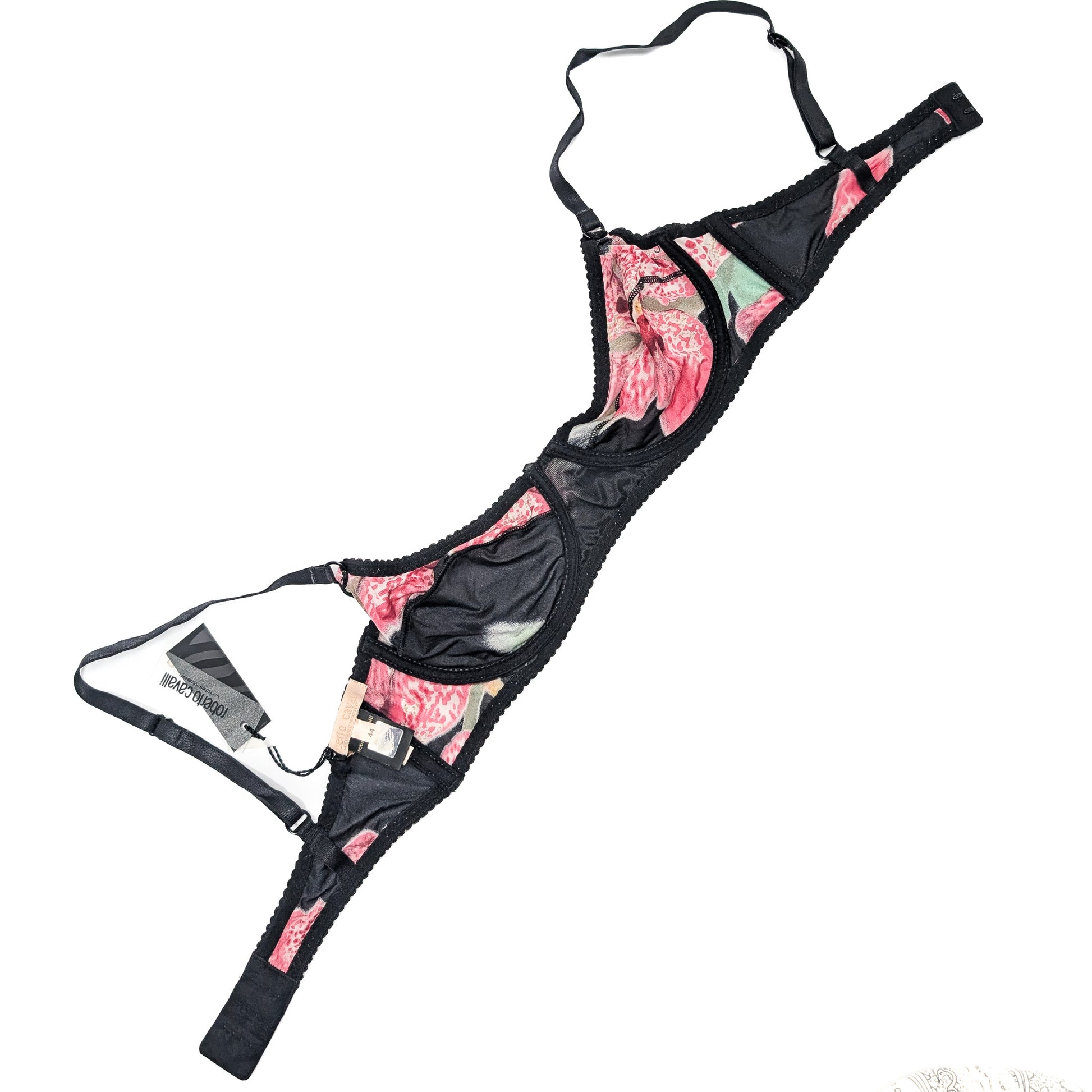 Item: Roberto Cavalli silk bra with black and pink print.
