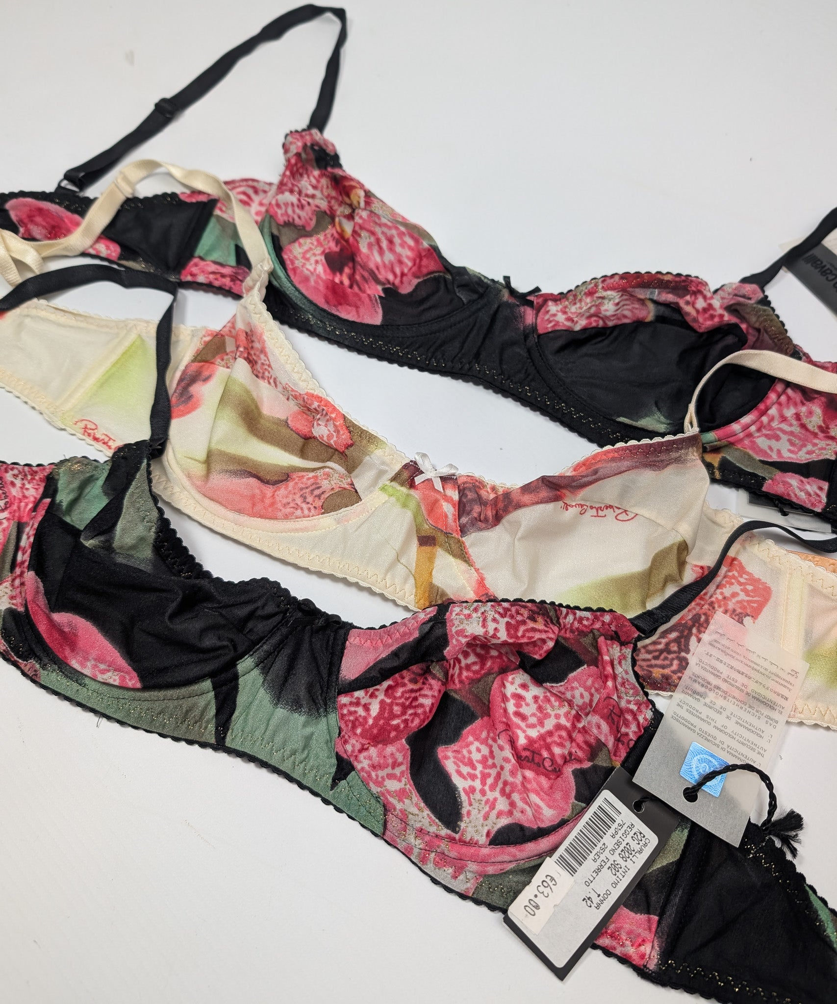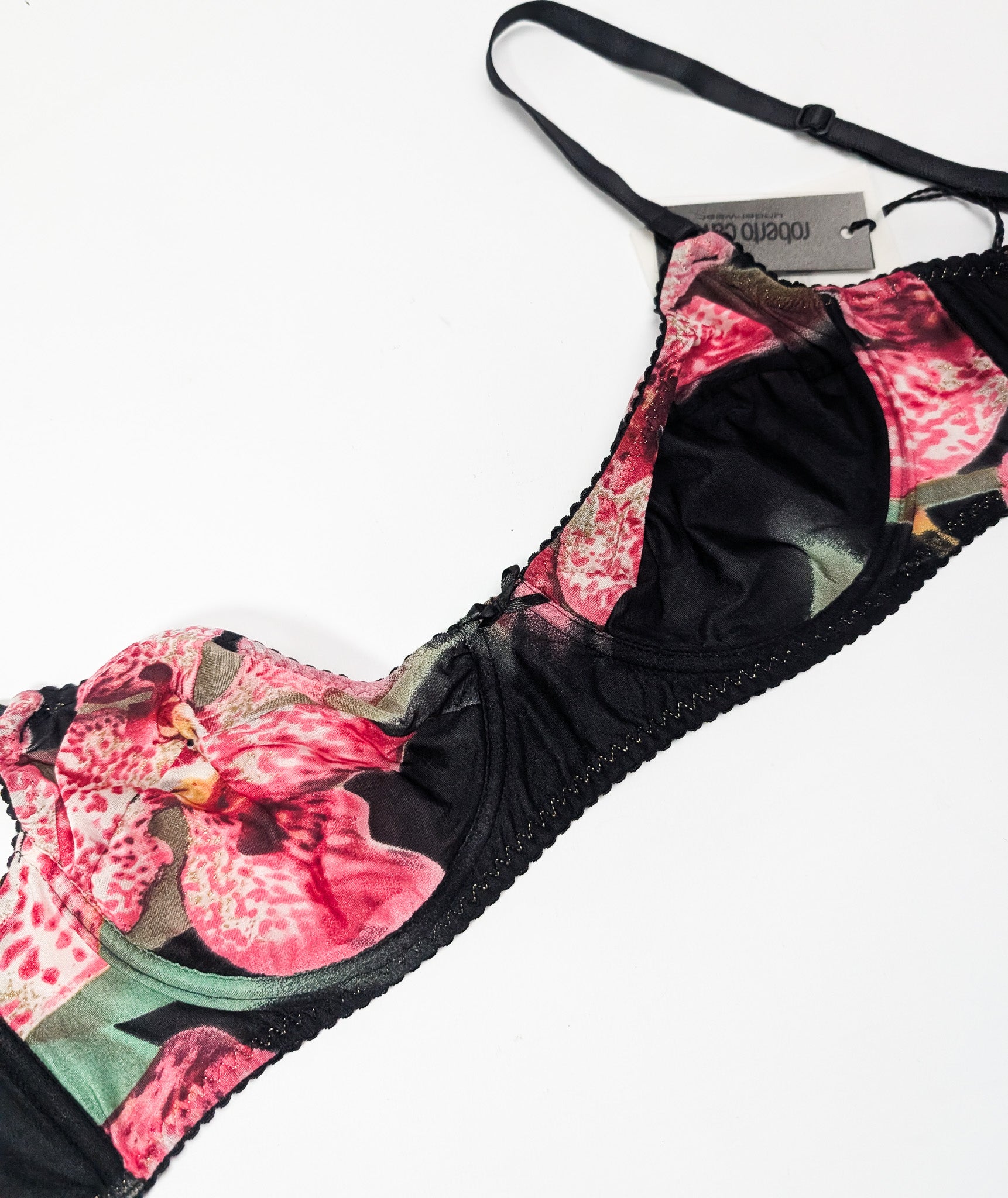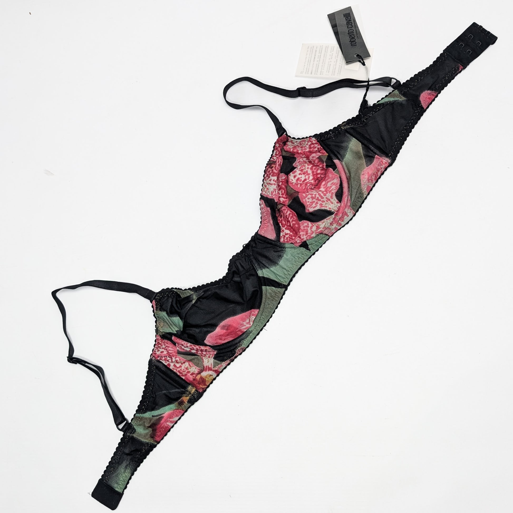 Item: Roberto Cavalli silk bra with black and pink print.