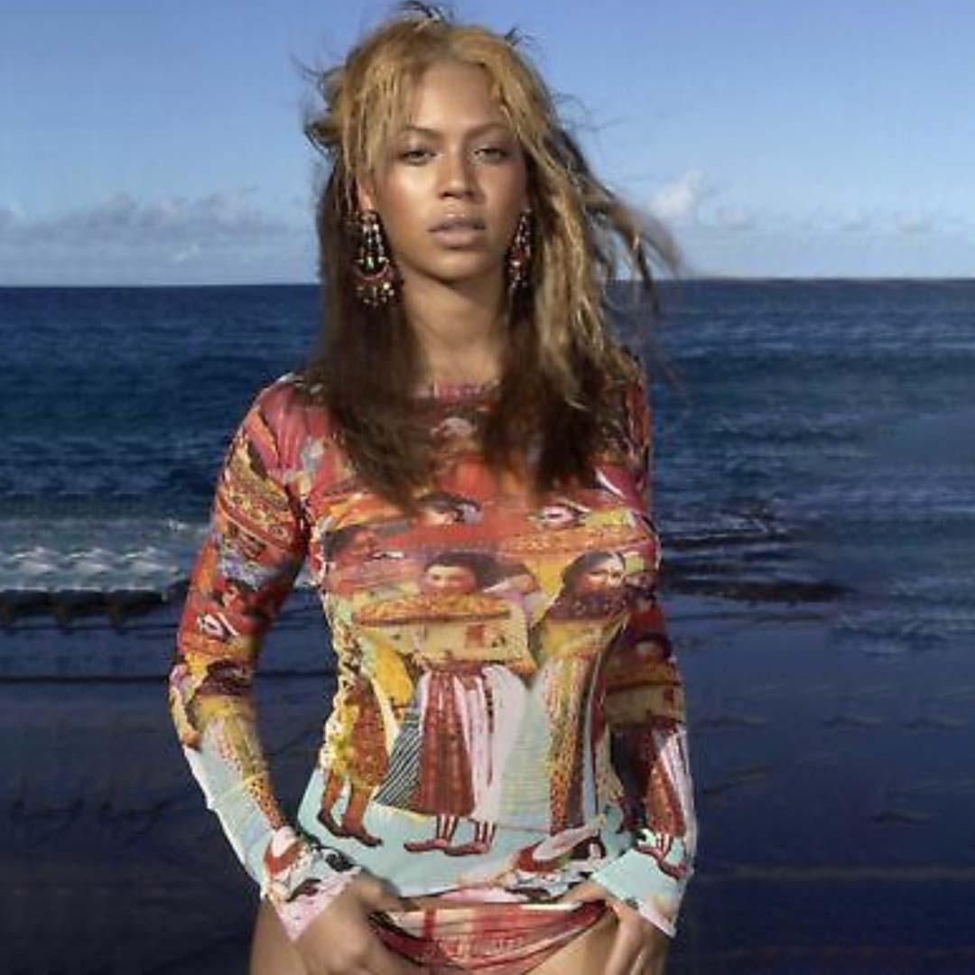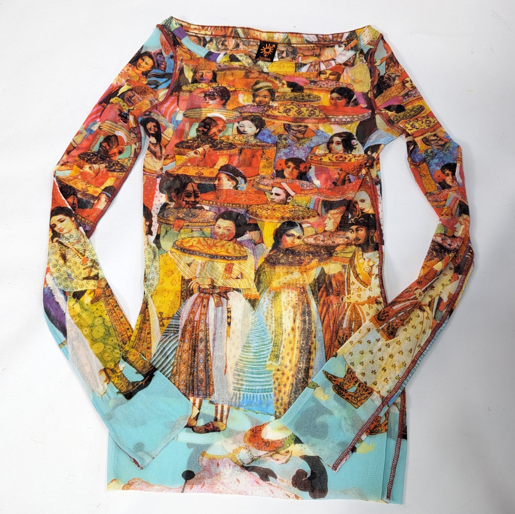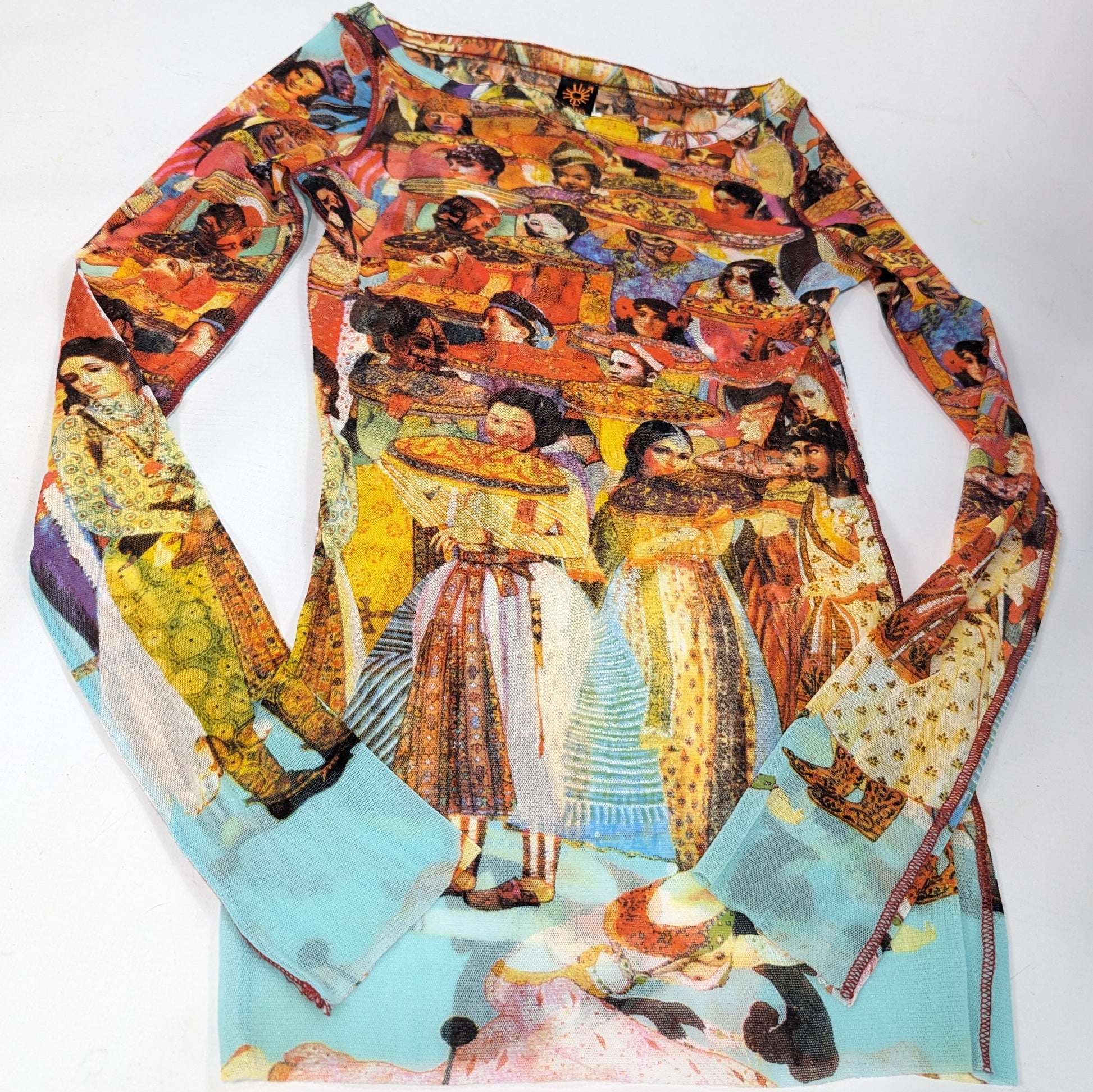 Item: Long-sleeved mesh top with Indian print.