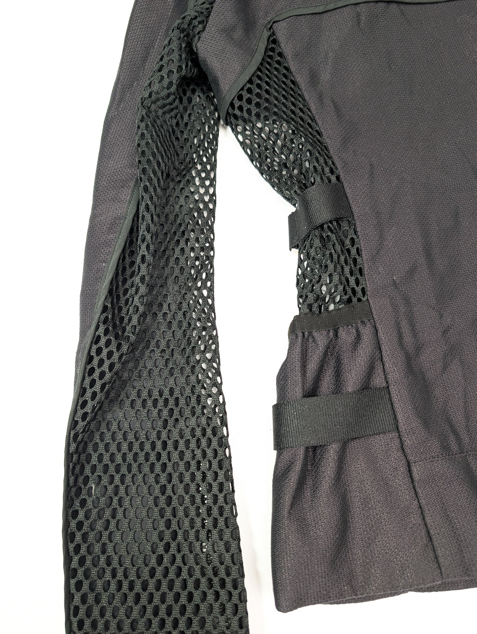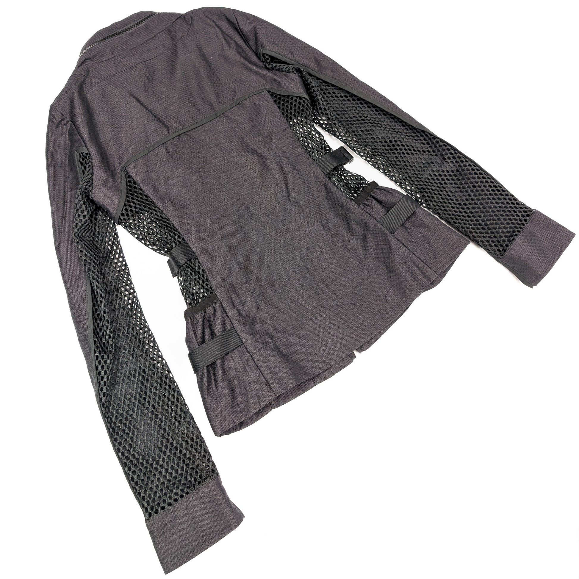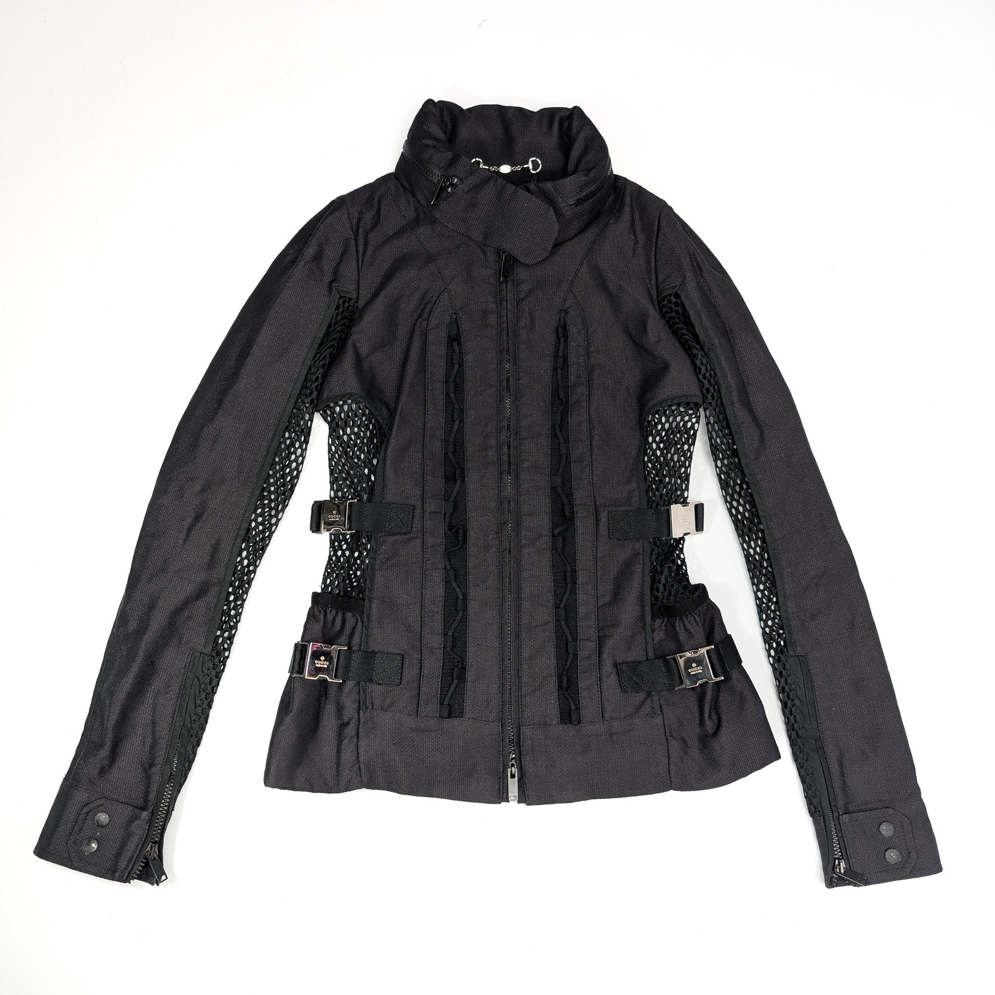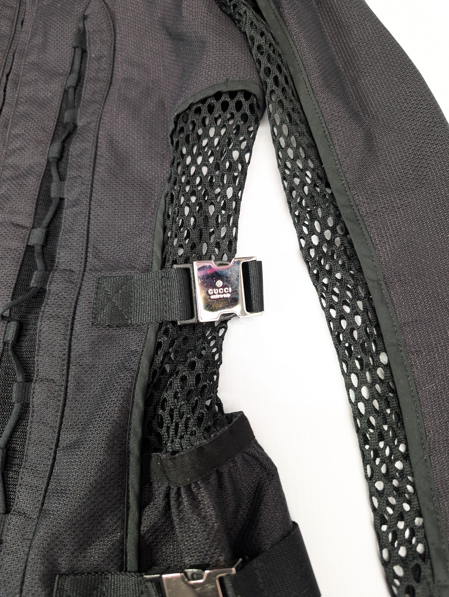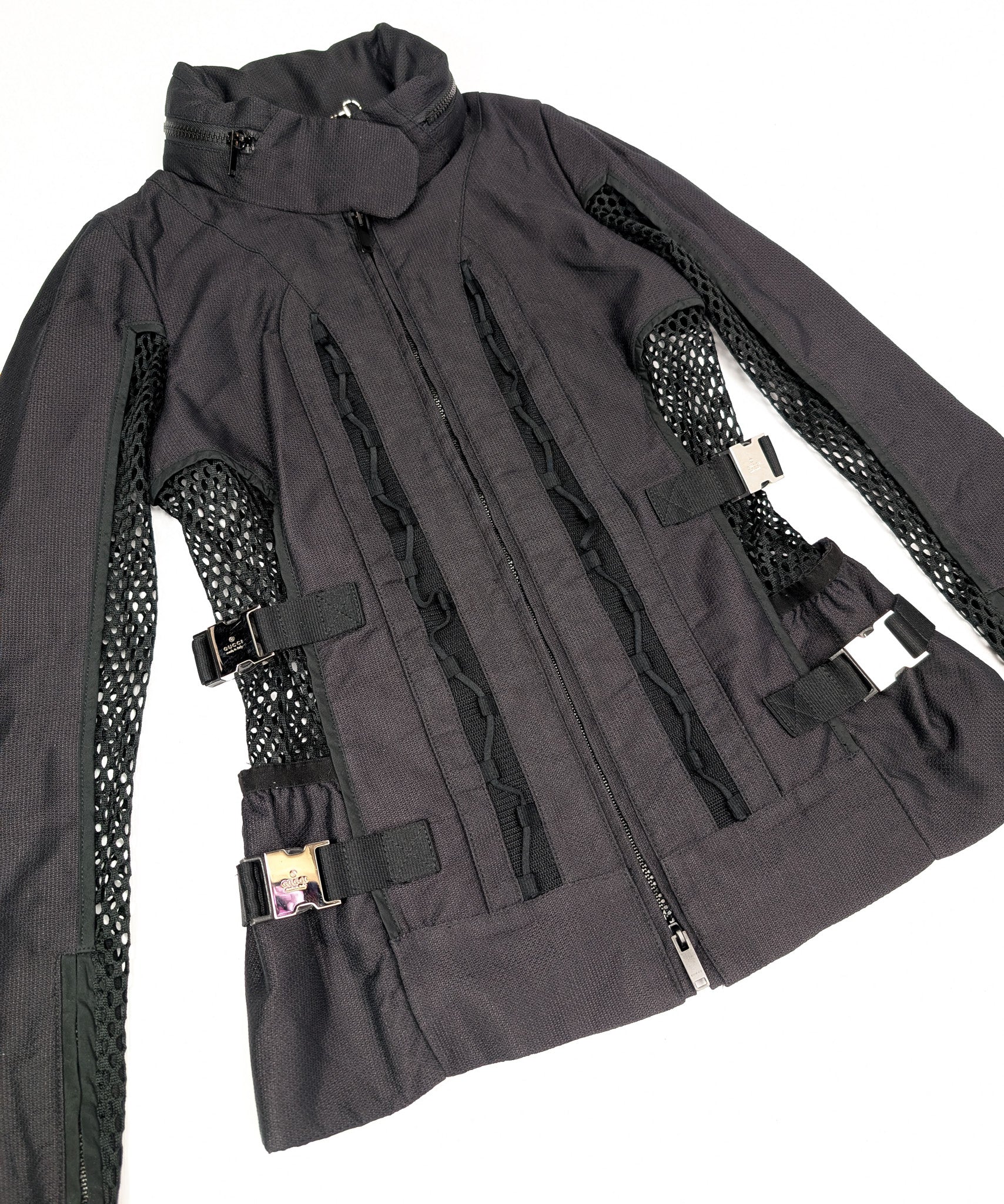 Item: Veste techwear mesh style moto biker, ornée de sangles argentées signées "Gucci". Capuche repliable grâce à la poche zippée dans le col.