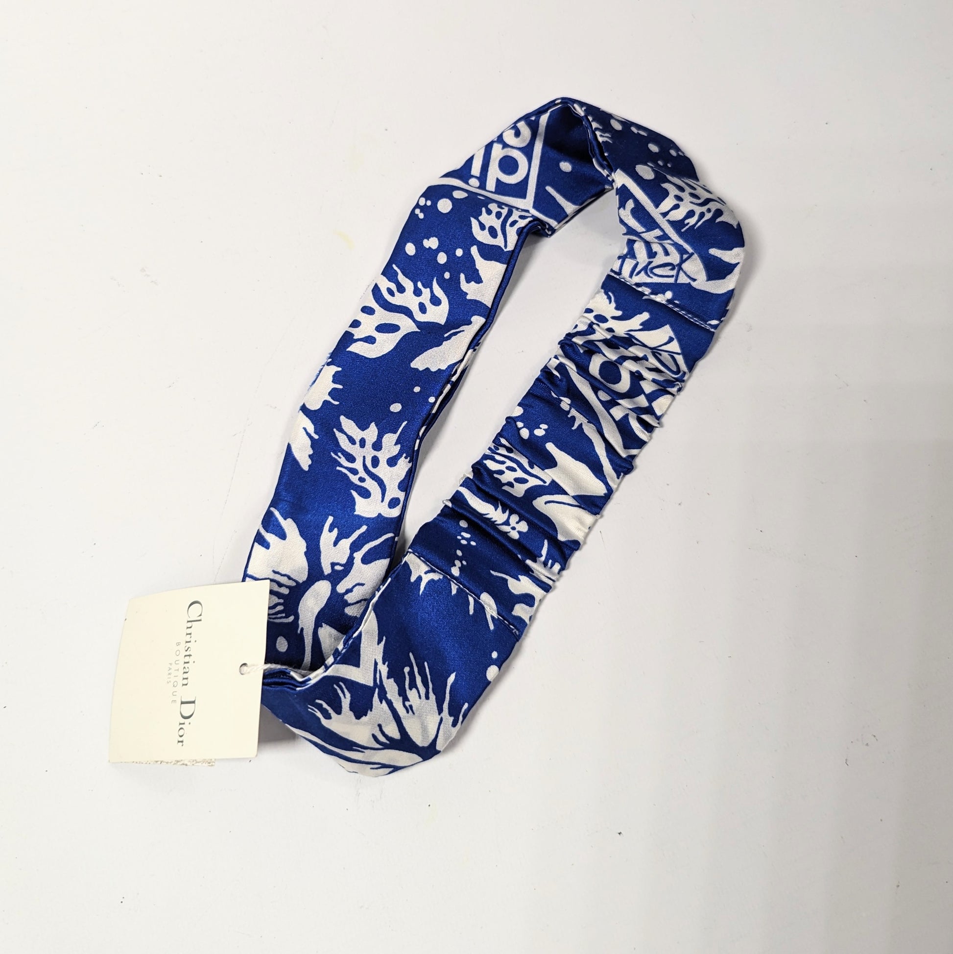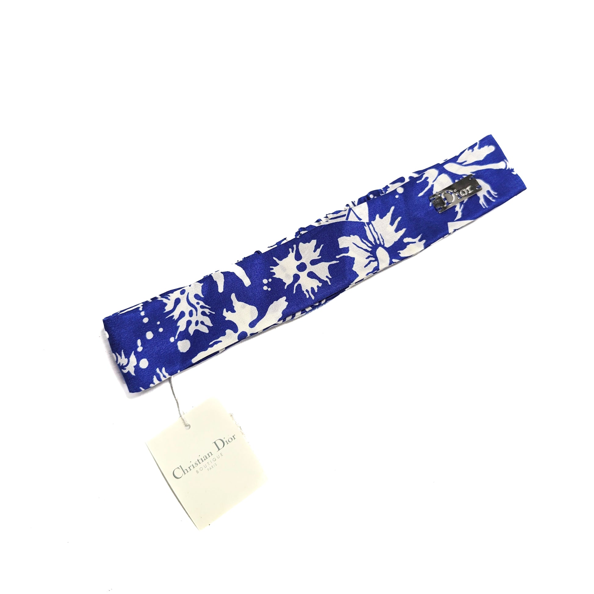 Item: Bandeau en soie à imprimé surf Dior avec plaque signée "Dior" argentée.