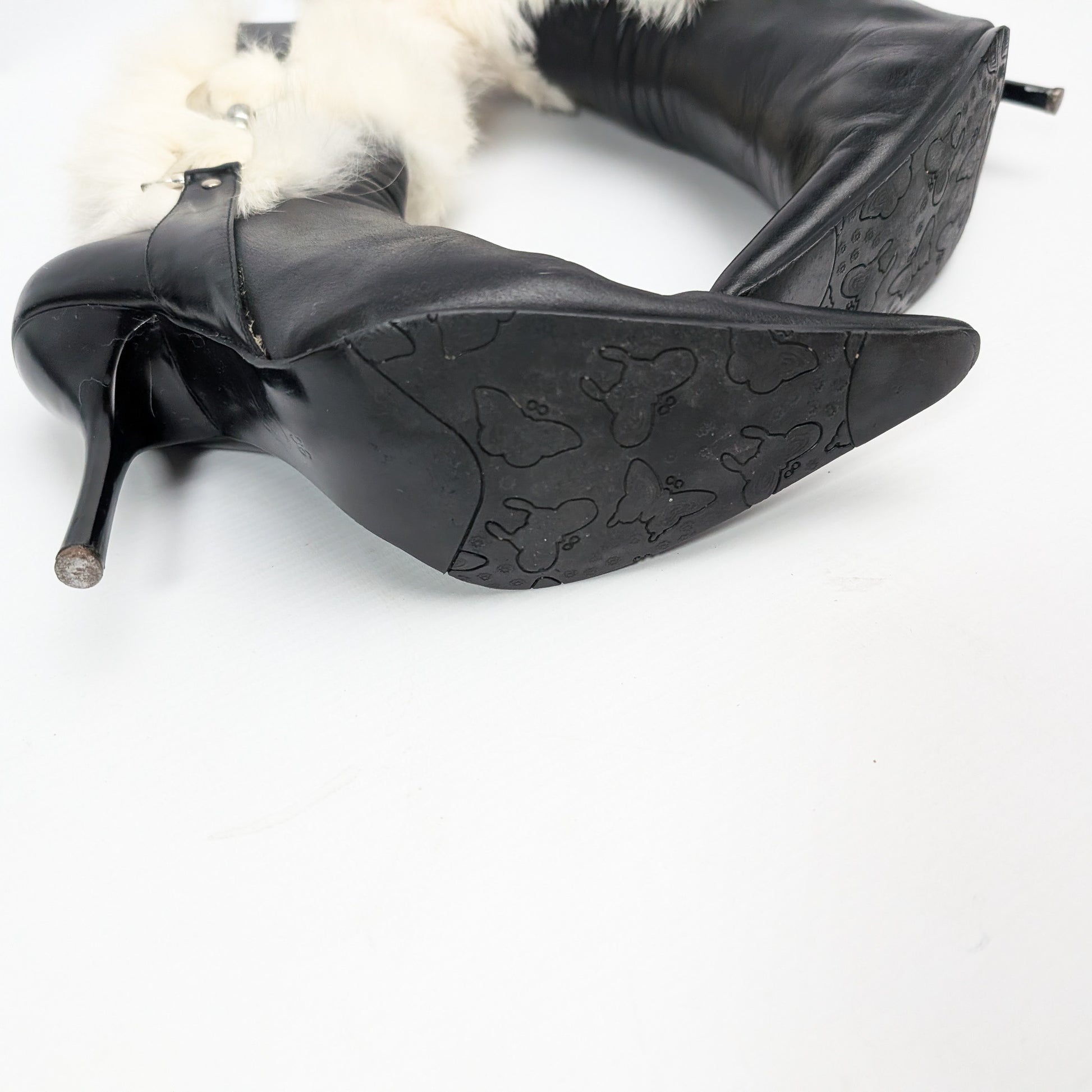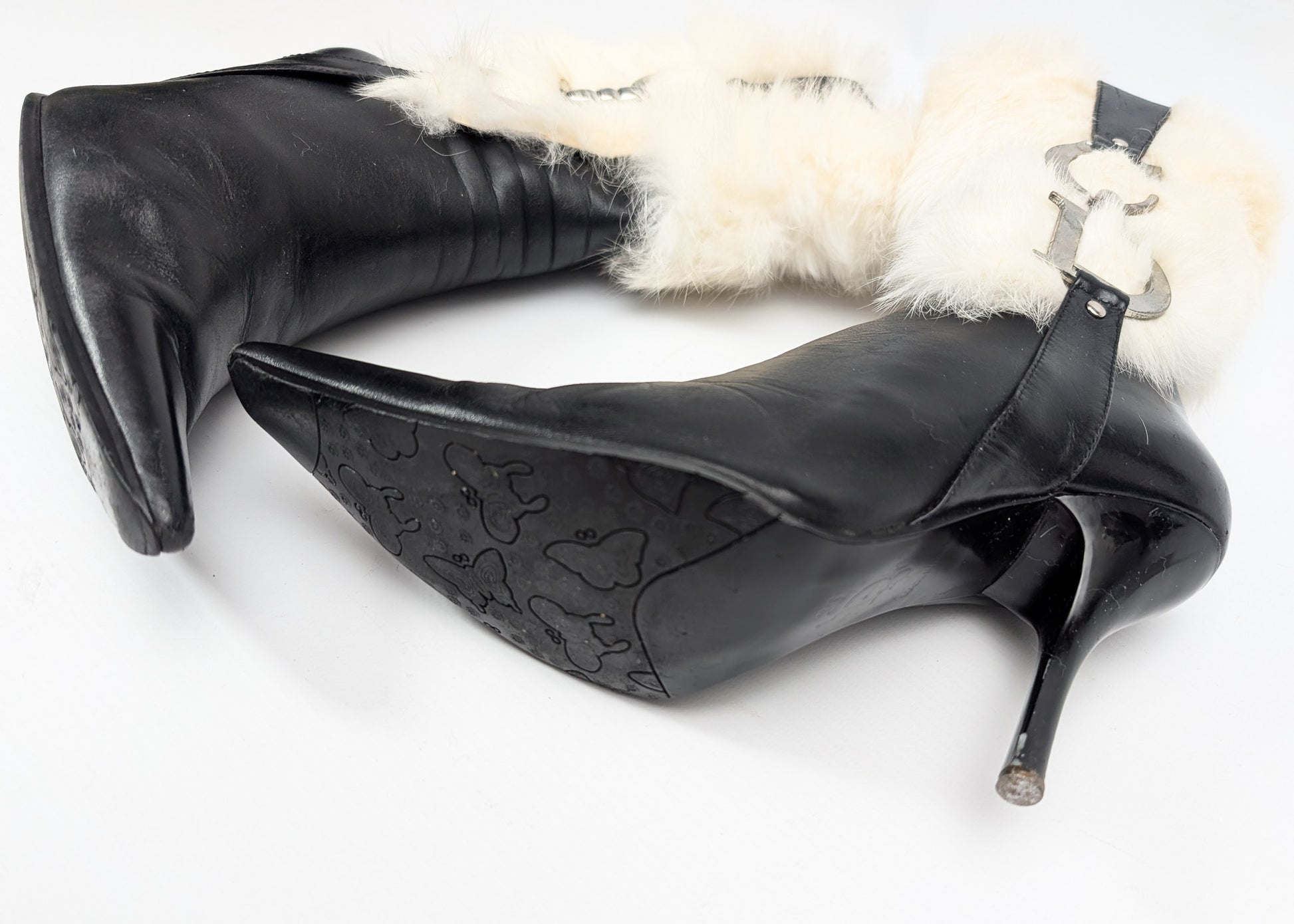 Item: Bottes Dior par Galliano en cuir noir ornées de fourrure veritable blanche et d'empiècements en metal avec les initales "CD".