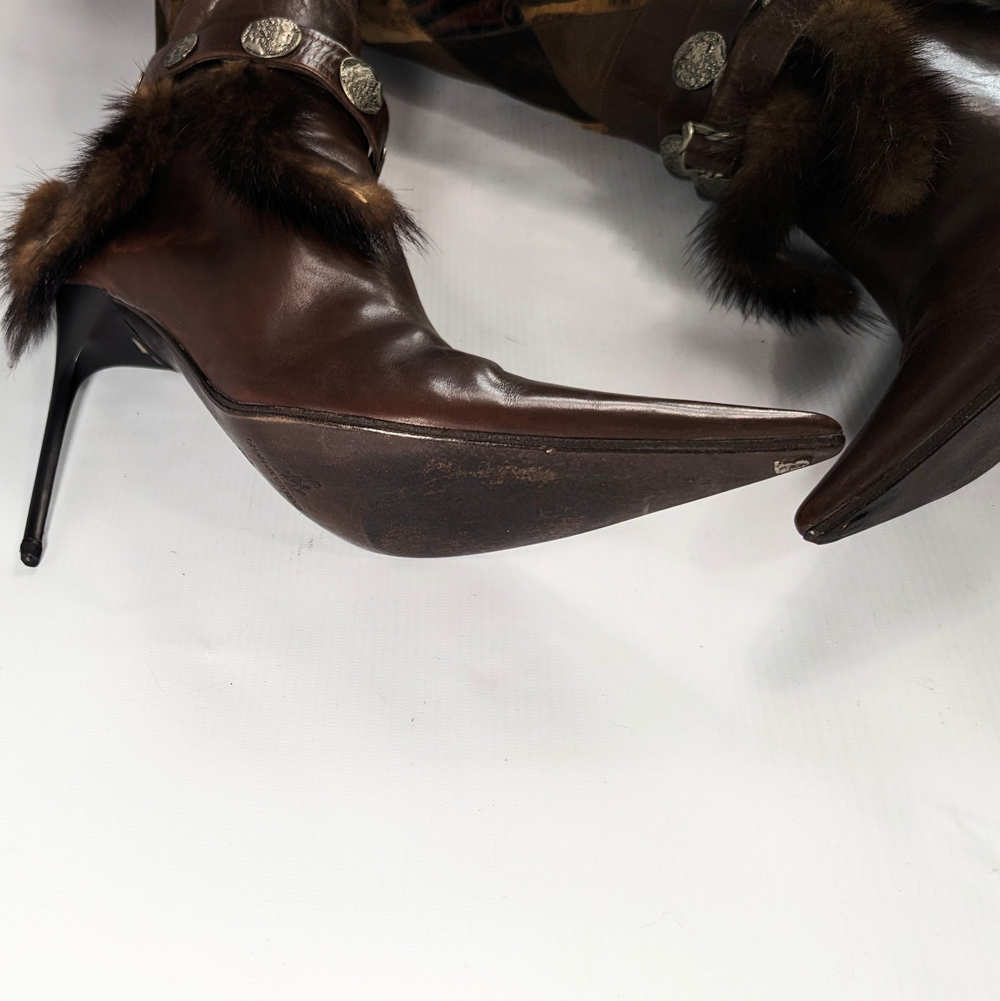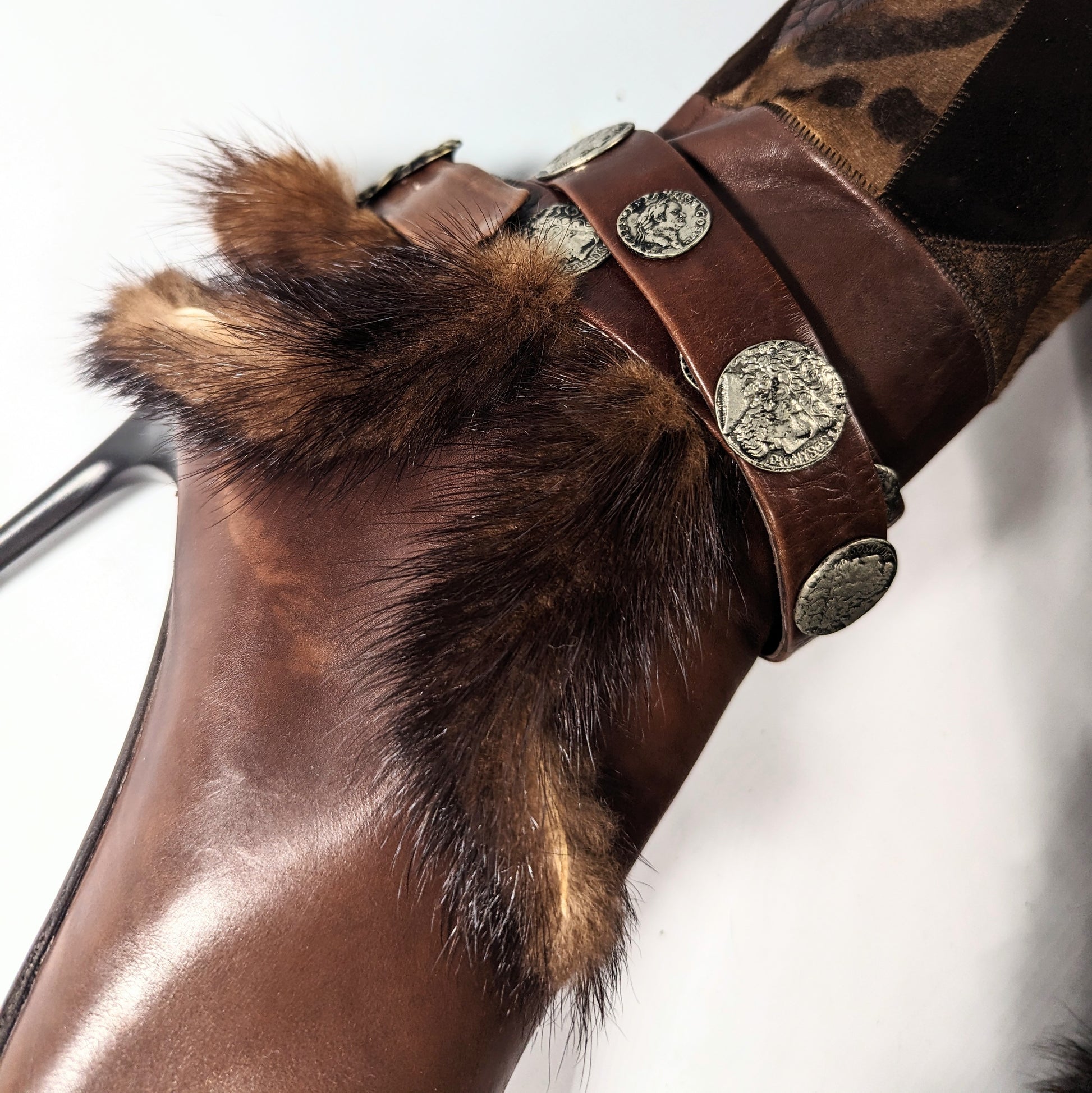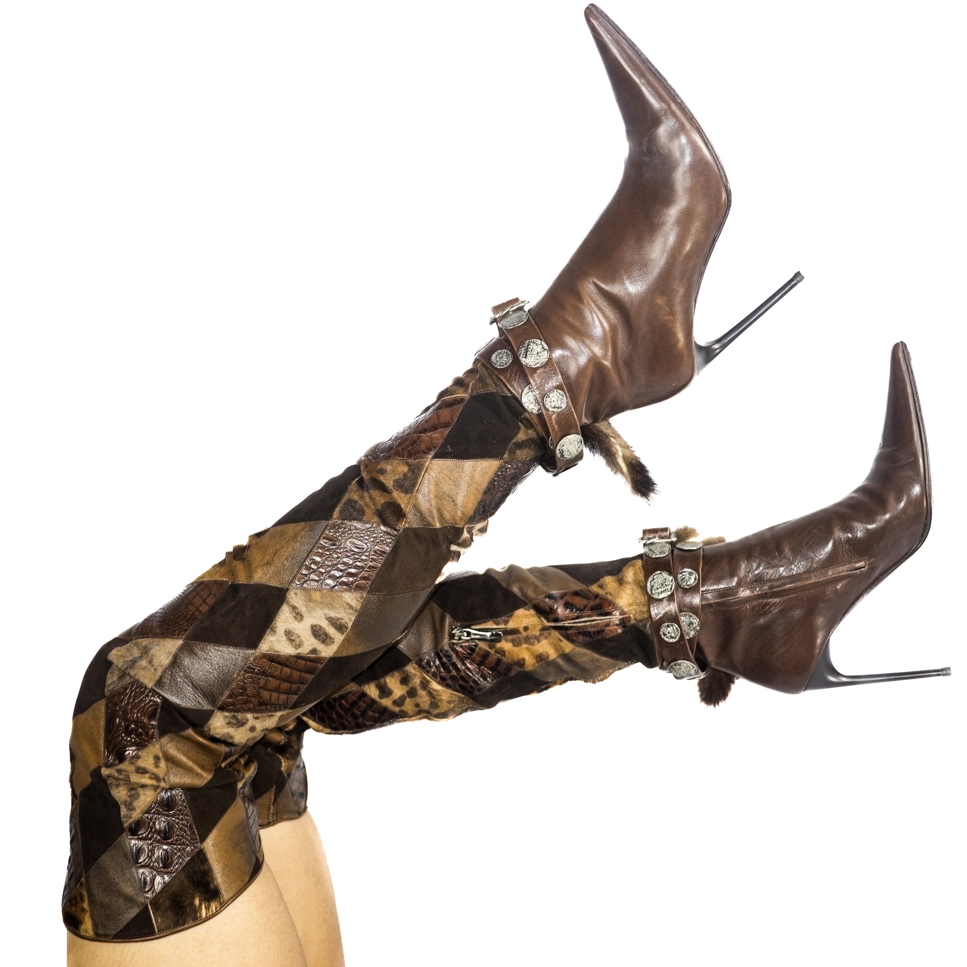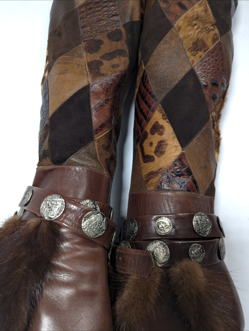 Item: Bottes cuissardes en patchwork de differents materiaux tels que l'aligator et les poils de poney. Interieur cuir, zippé. Bracelets amovible ornée de fourrures de visons.