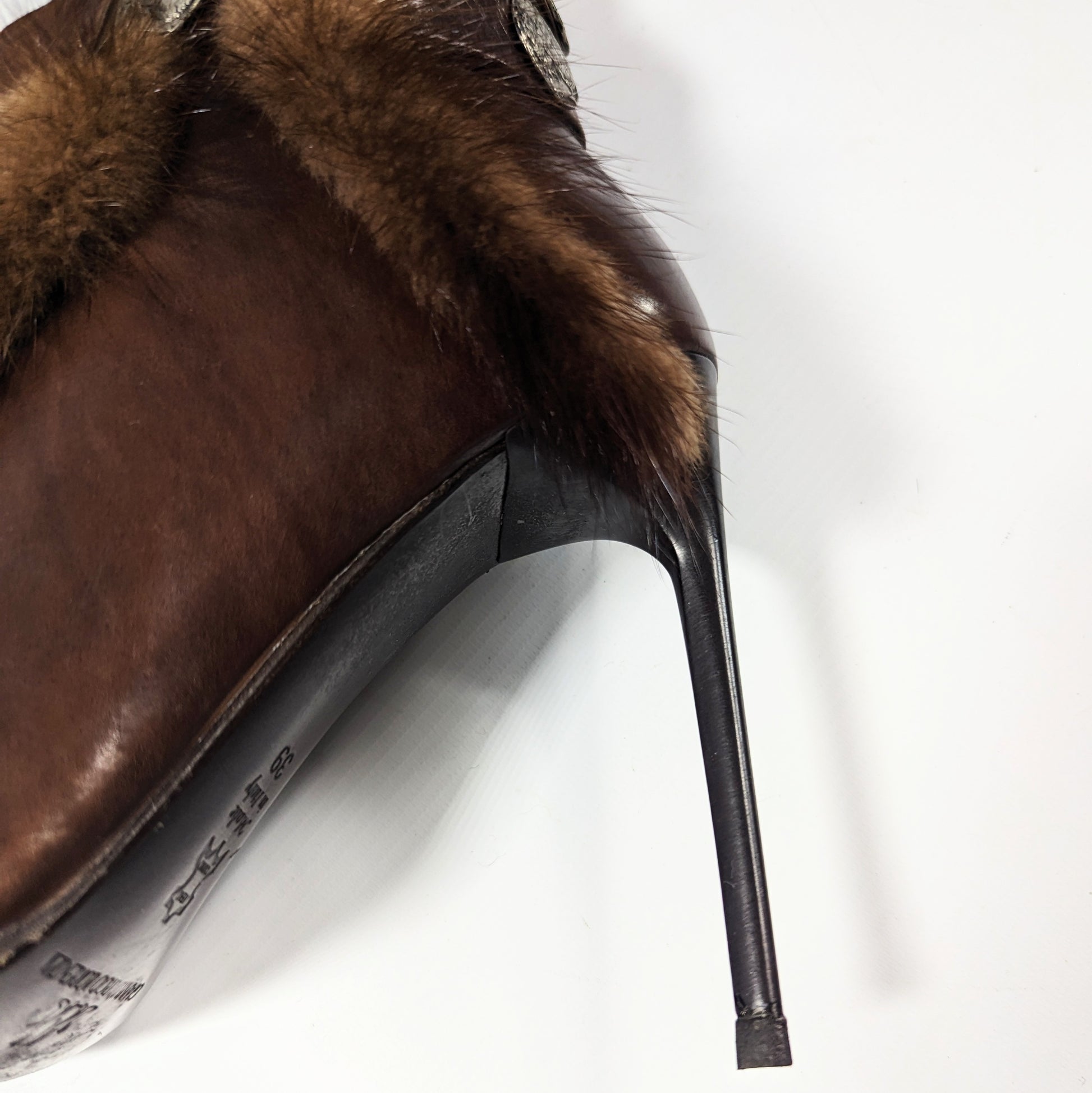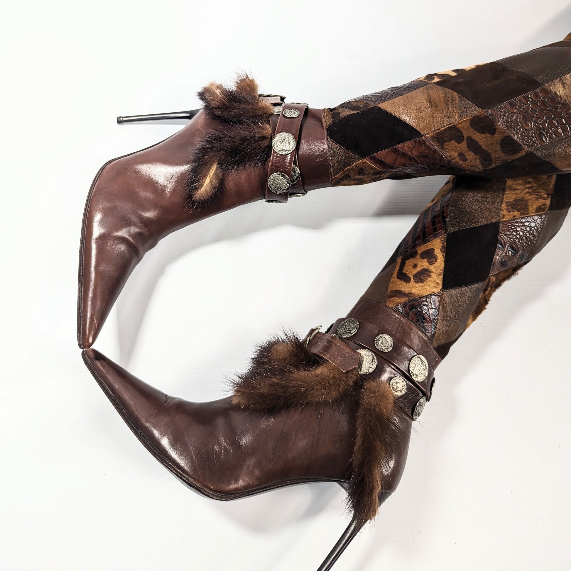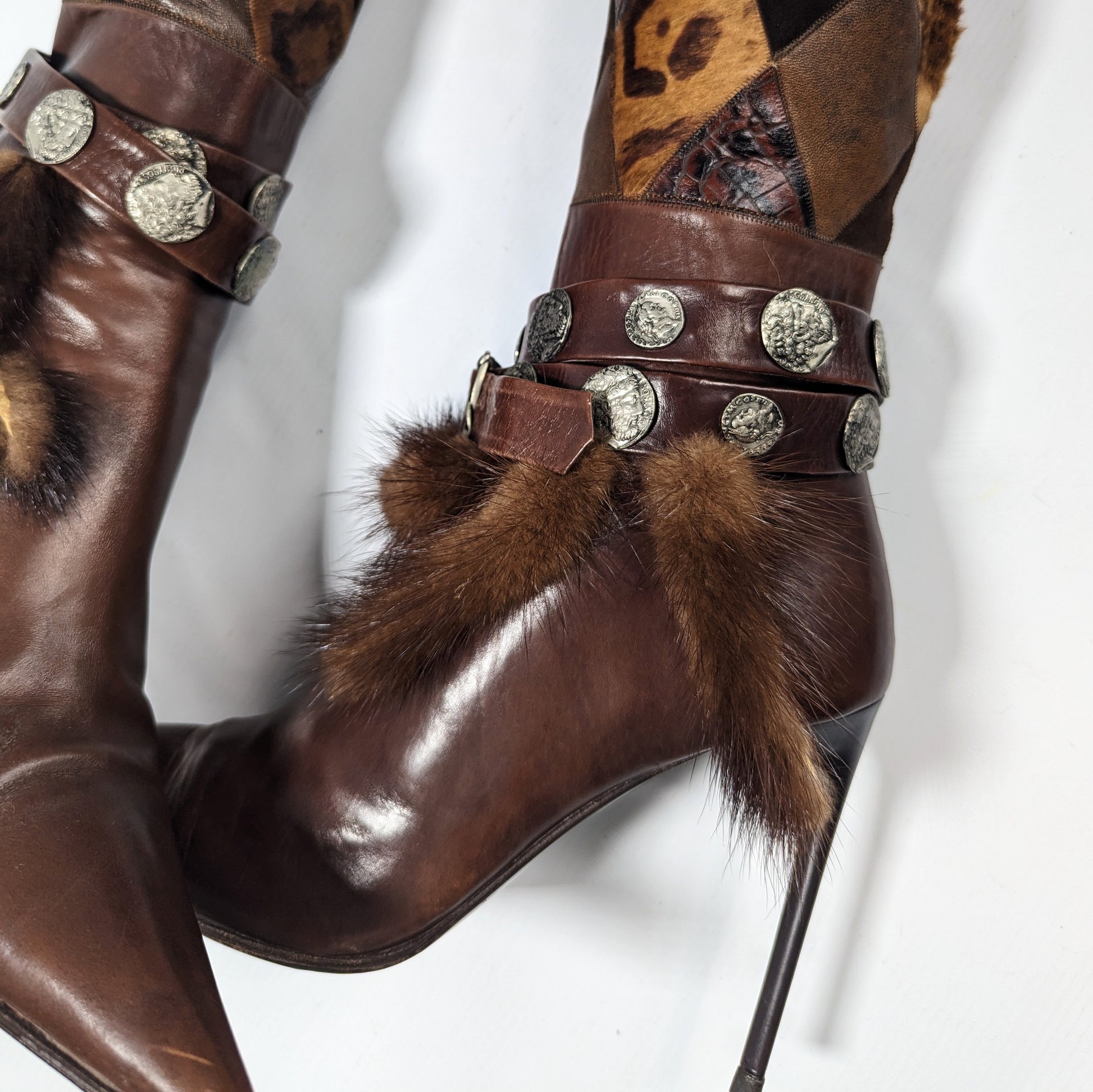 Item: Bottes cuissardes en patchwork de differents materiaux tels que l'aligator et les poils de poney. Interieur cuir, zippé. Bracelets amovible ornée de fourrures de visons.