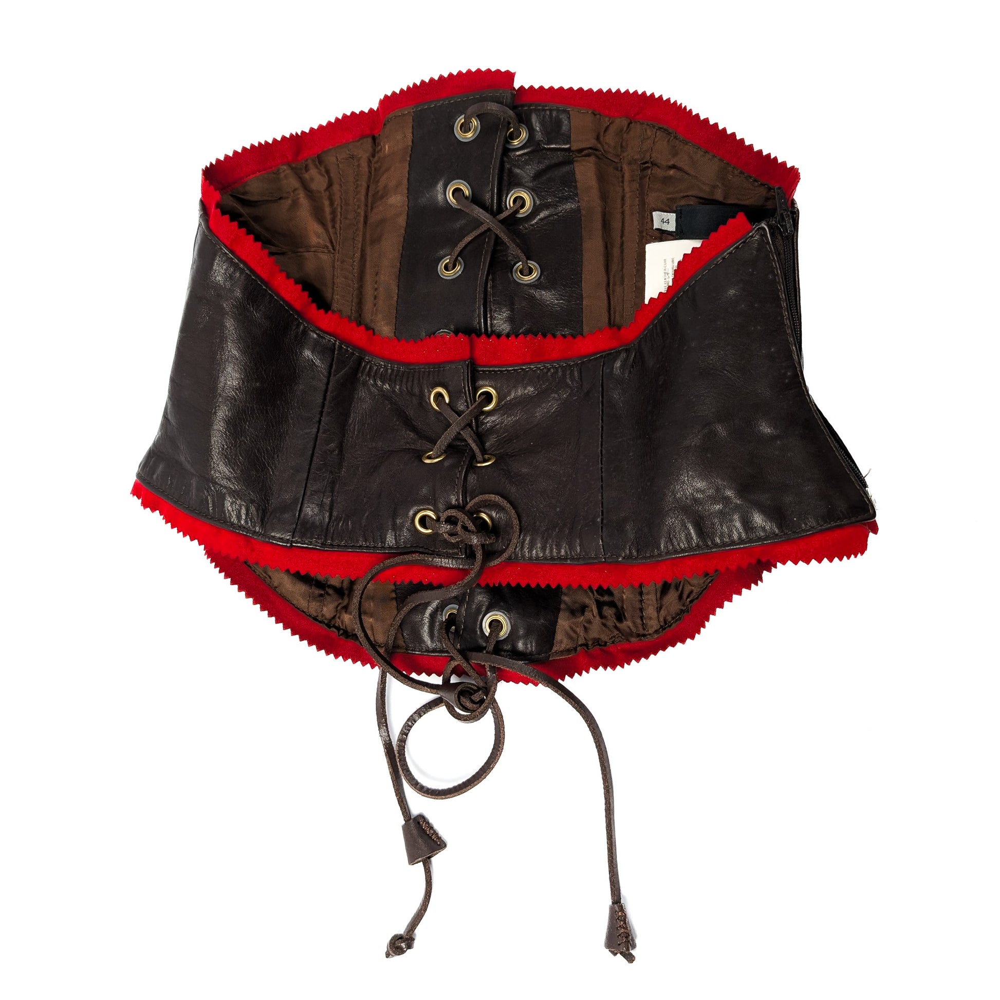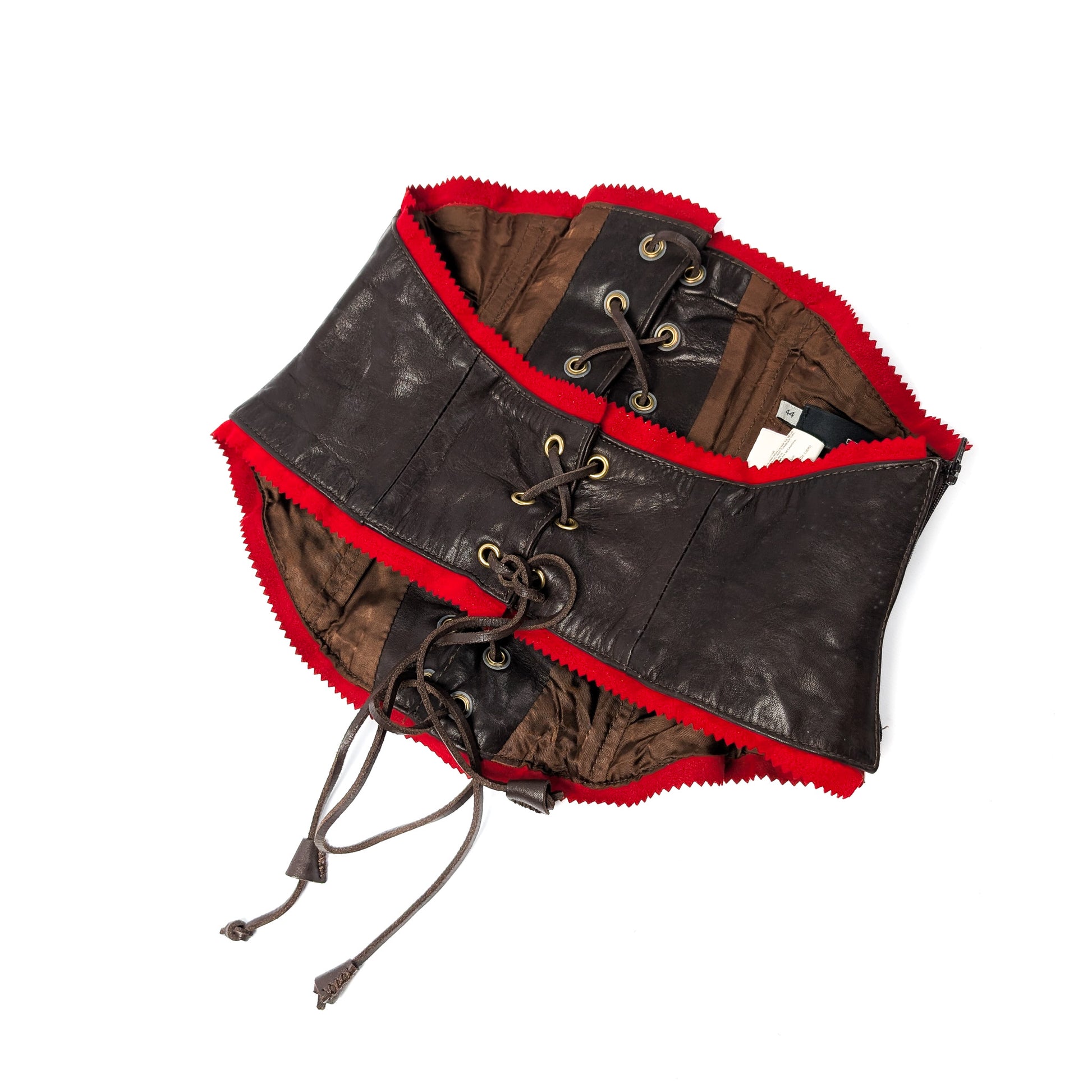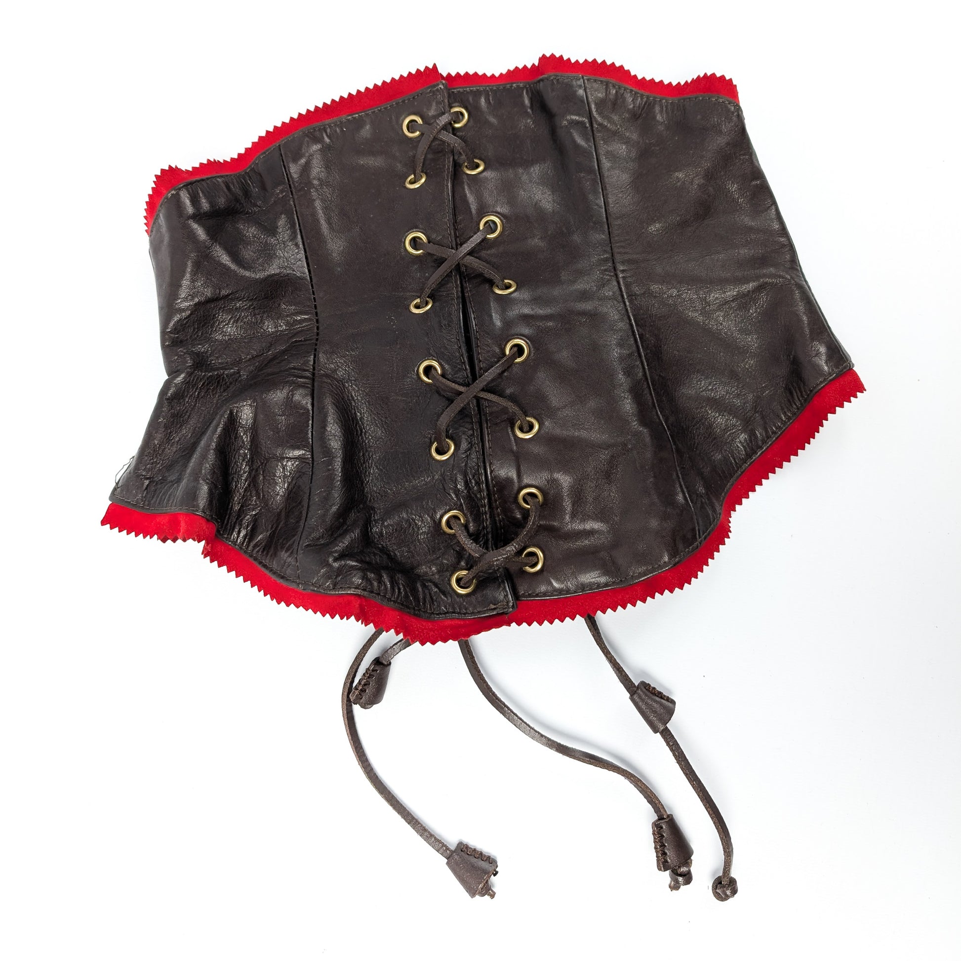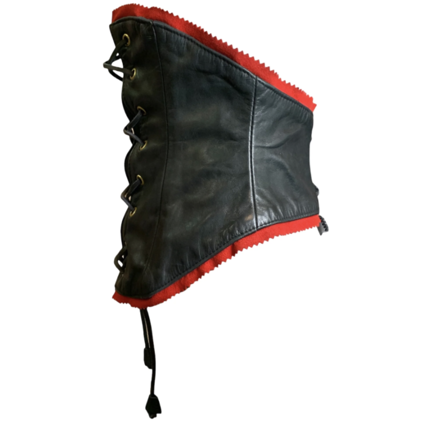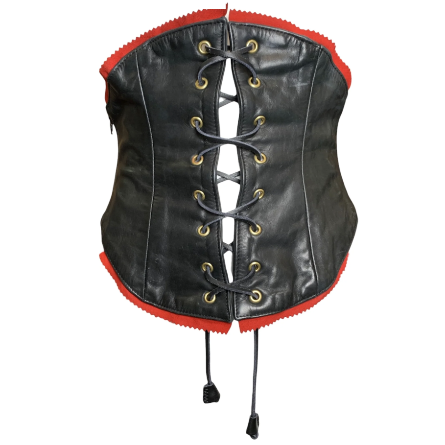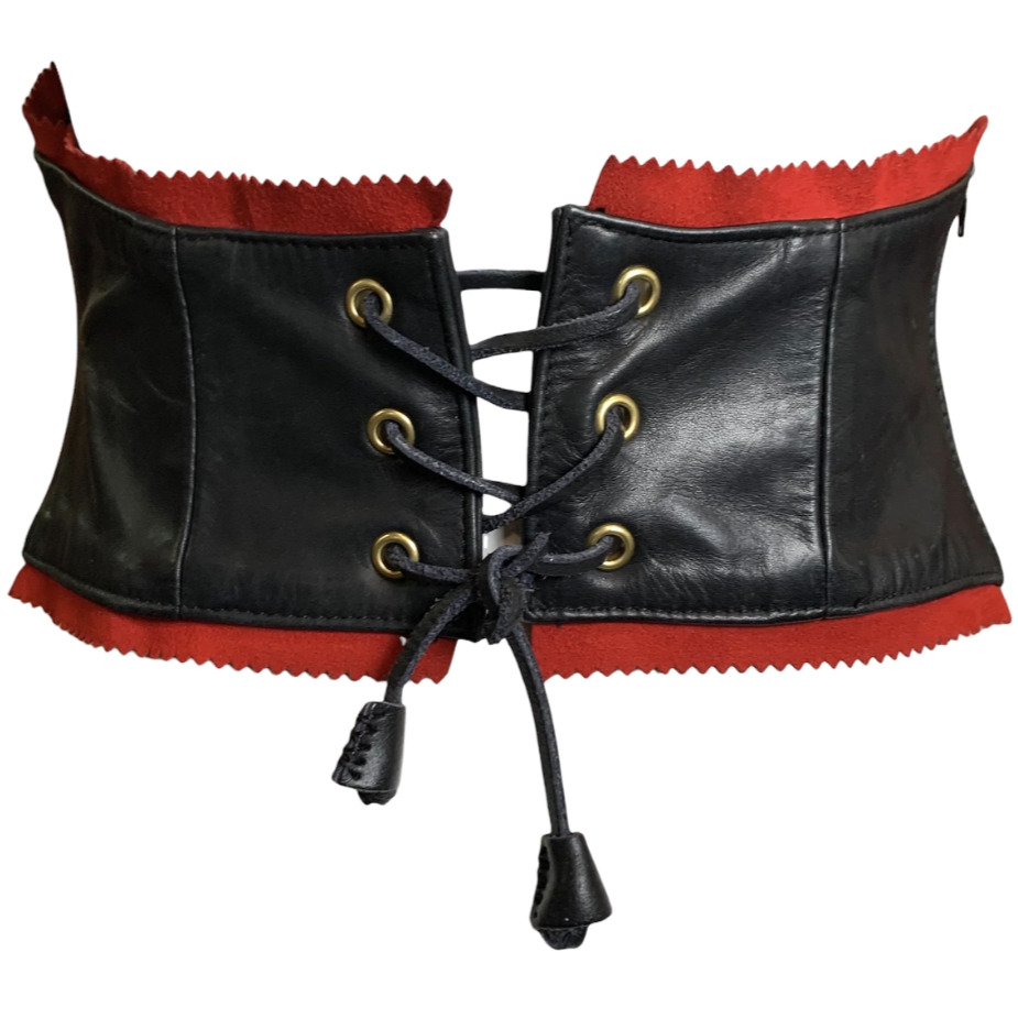 Item: Bustier à lacets en cuir italien noir doux orné de daim dentelé rouge. Œillets ton laiton et laçage épais en cuir noir. Fermeture éclair latérale dissimulée.