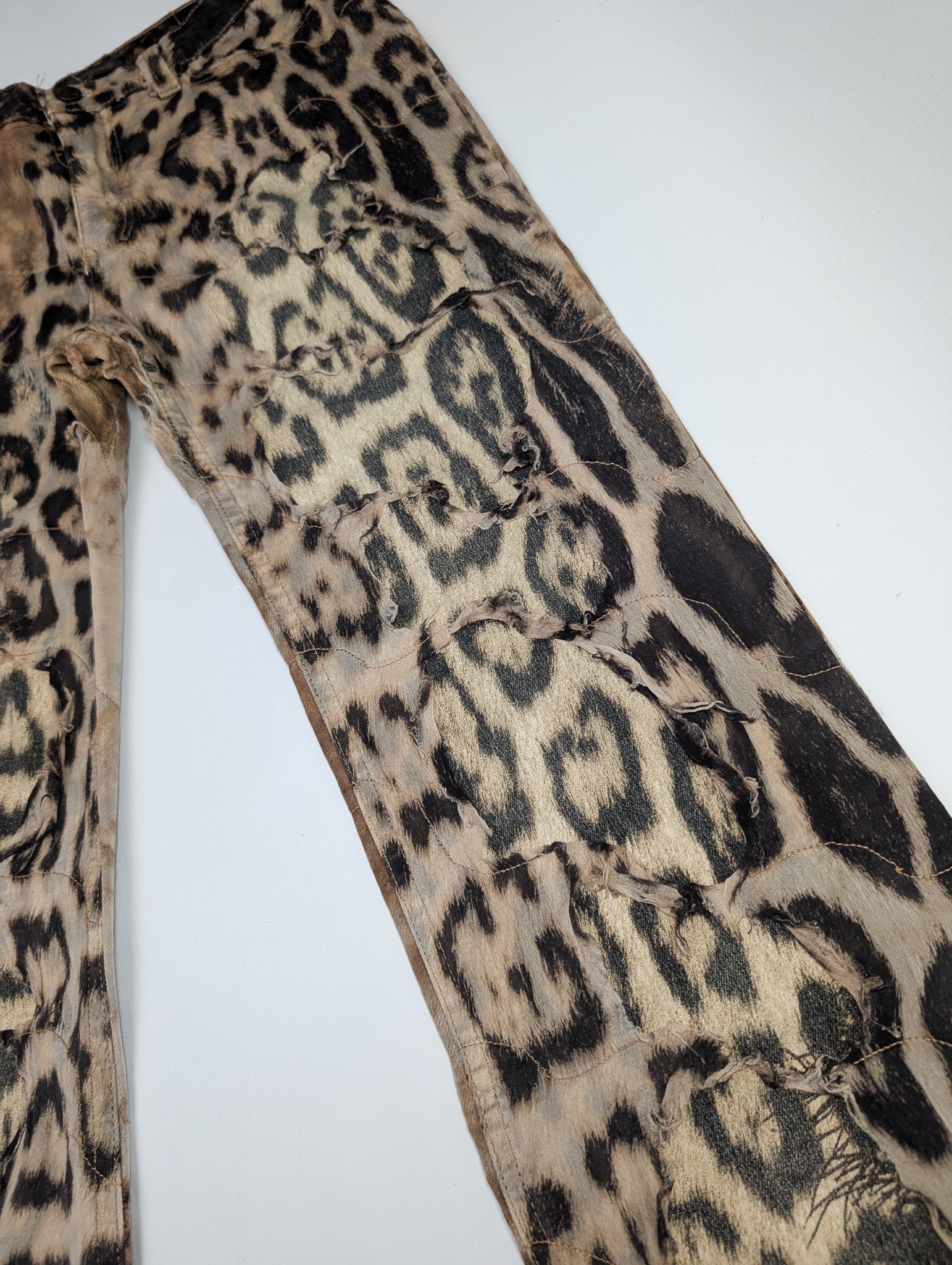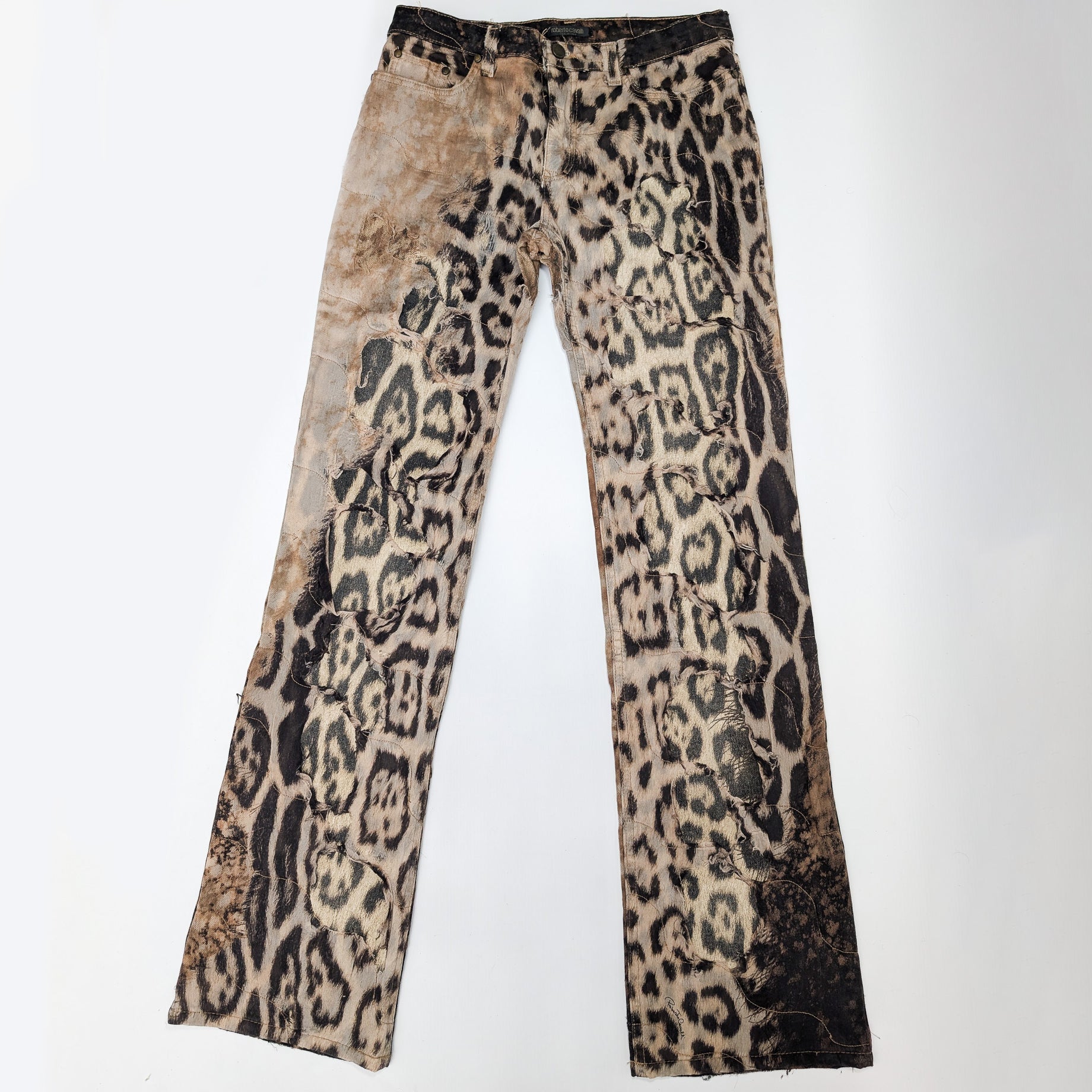 Item: Jeans pantalon motif animal, léopard de face et tie and dye de dos. Effet destroy.