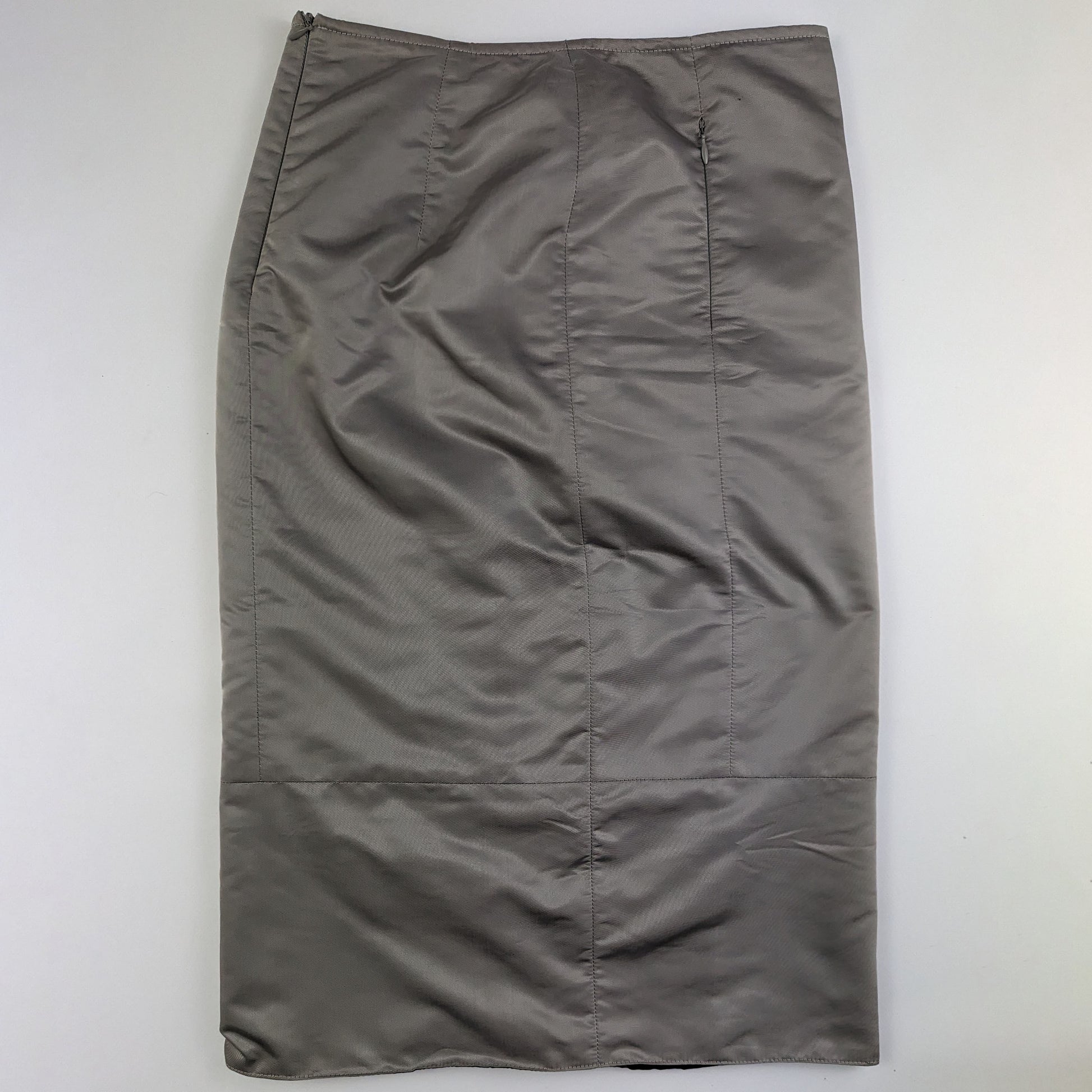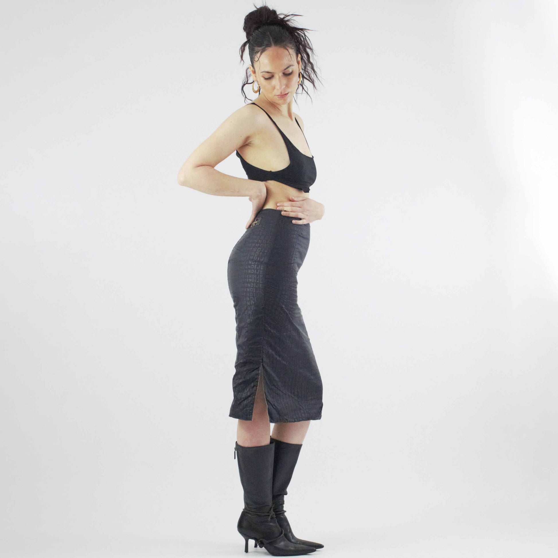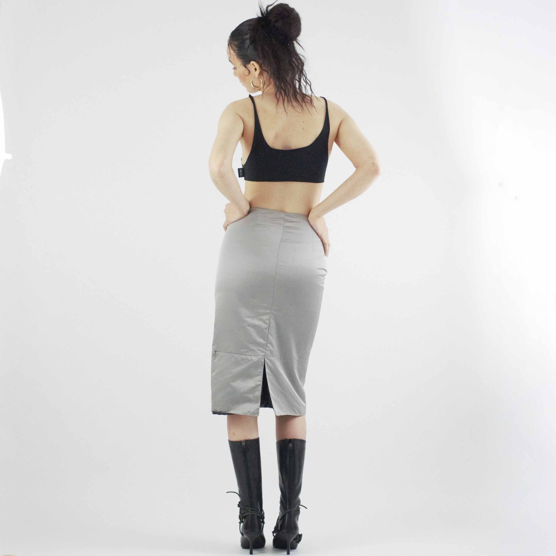 Item: Jupe fourreau longueur genou réversible. Gris satin d'un coté et monogramme logo de l'autre.
