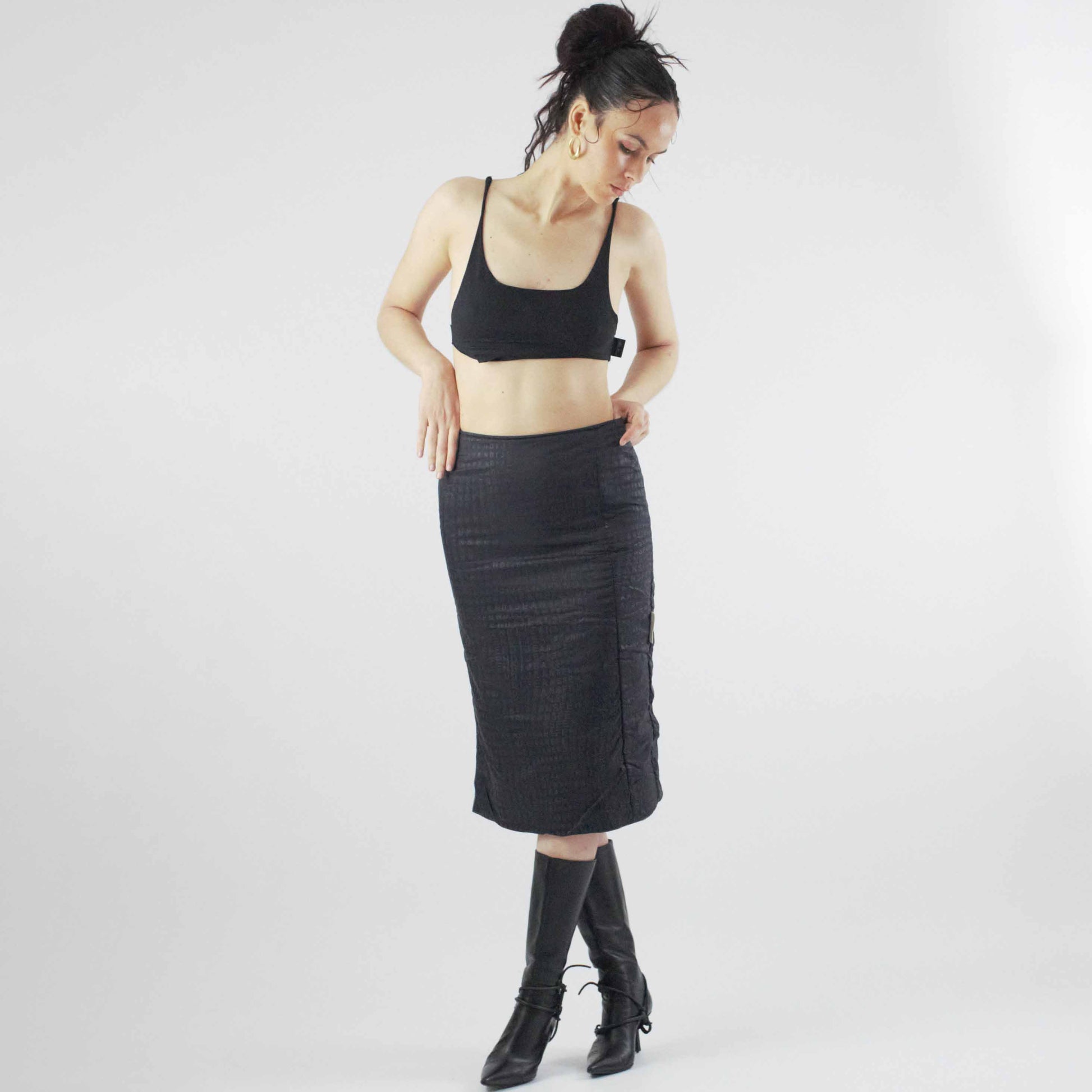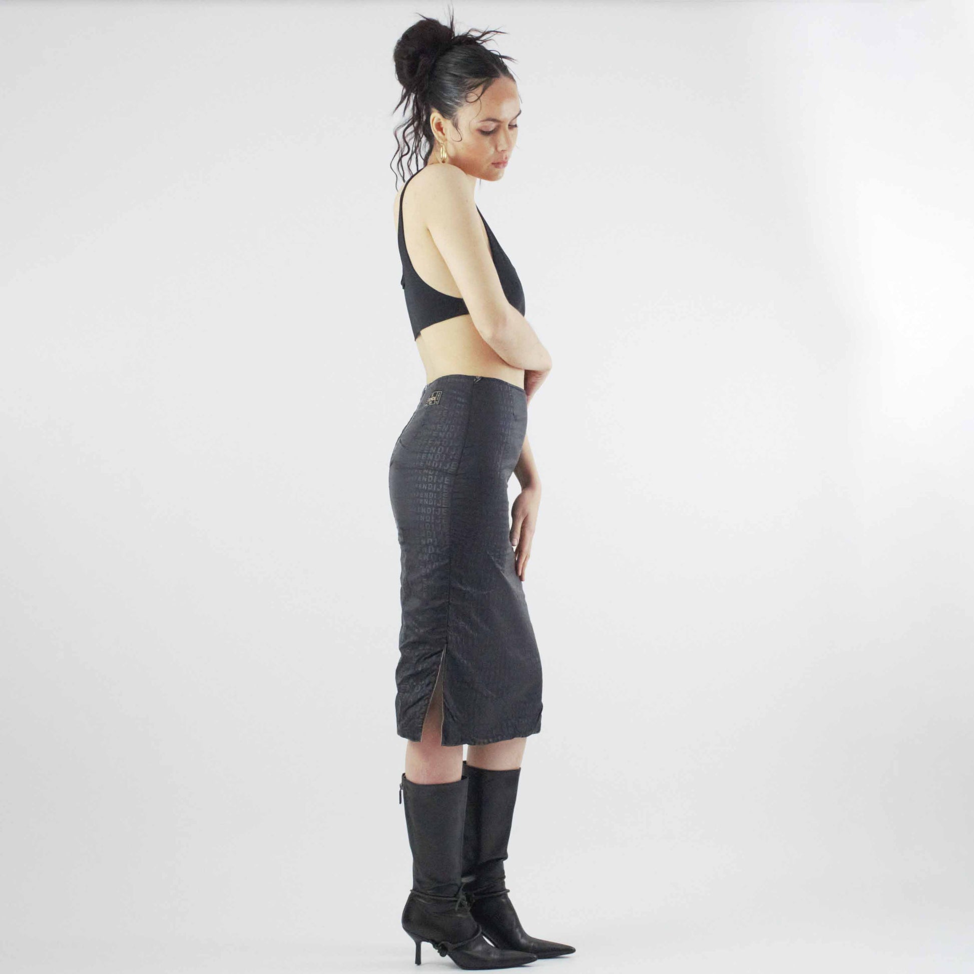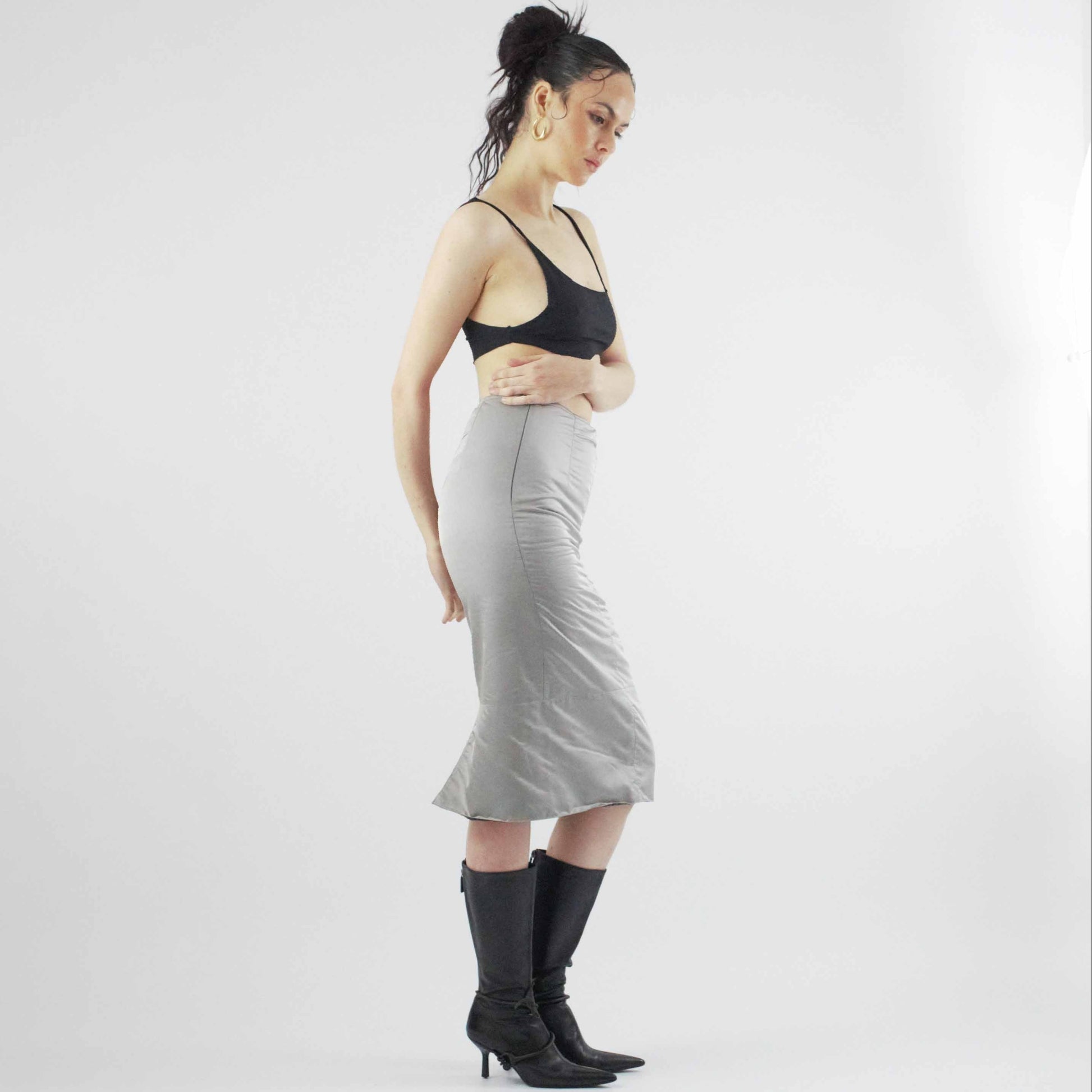 Item: Jupe fourreau longueur genou réversible. Gris satin d'un coté et monogramme logo de l'autre.
