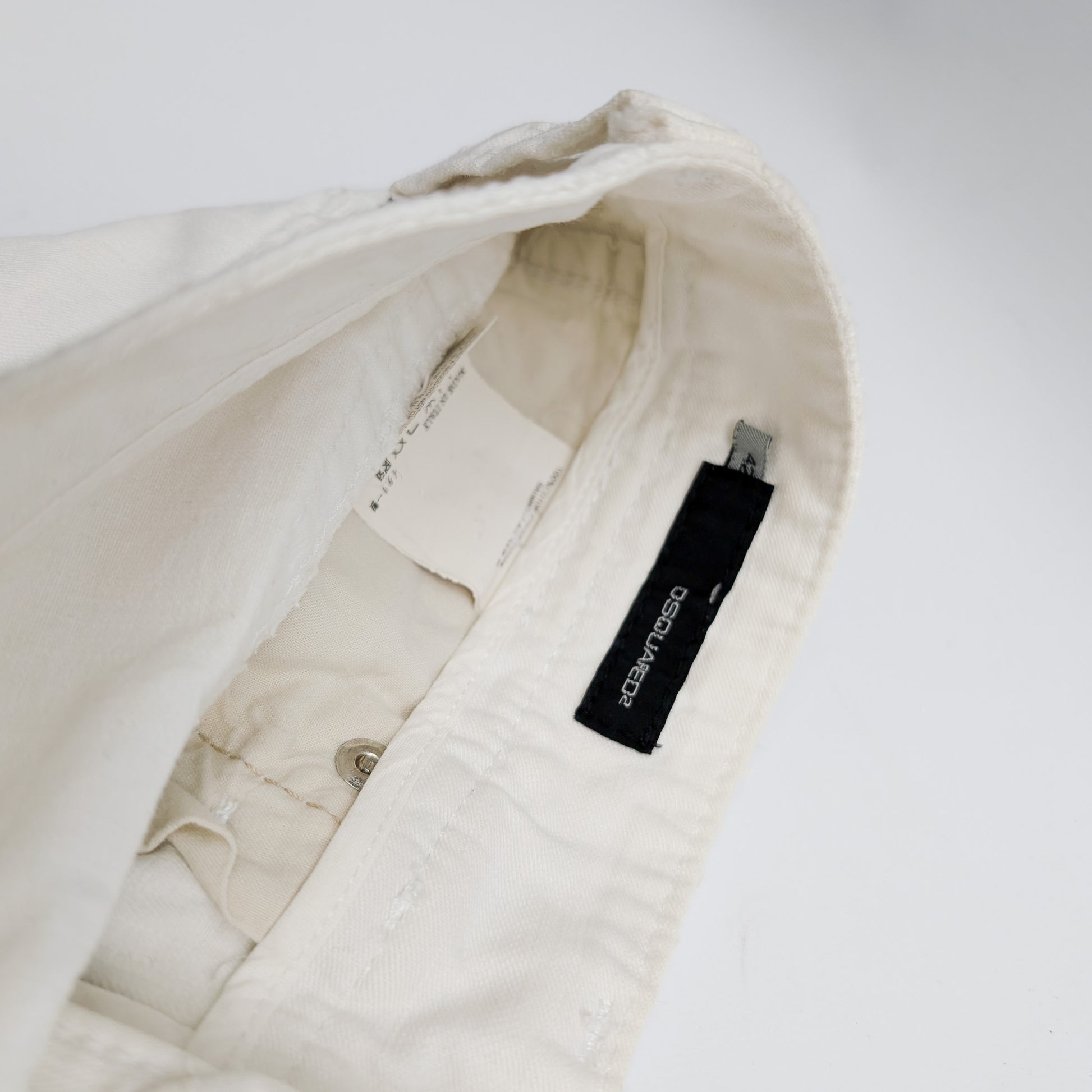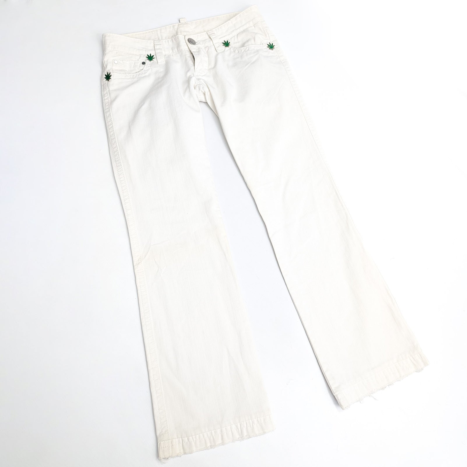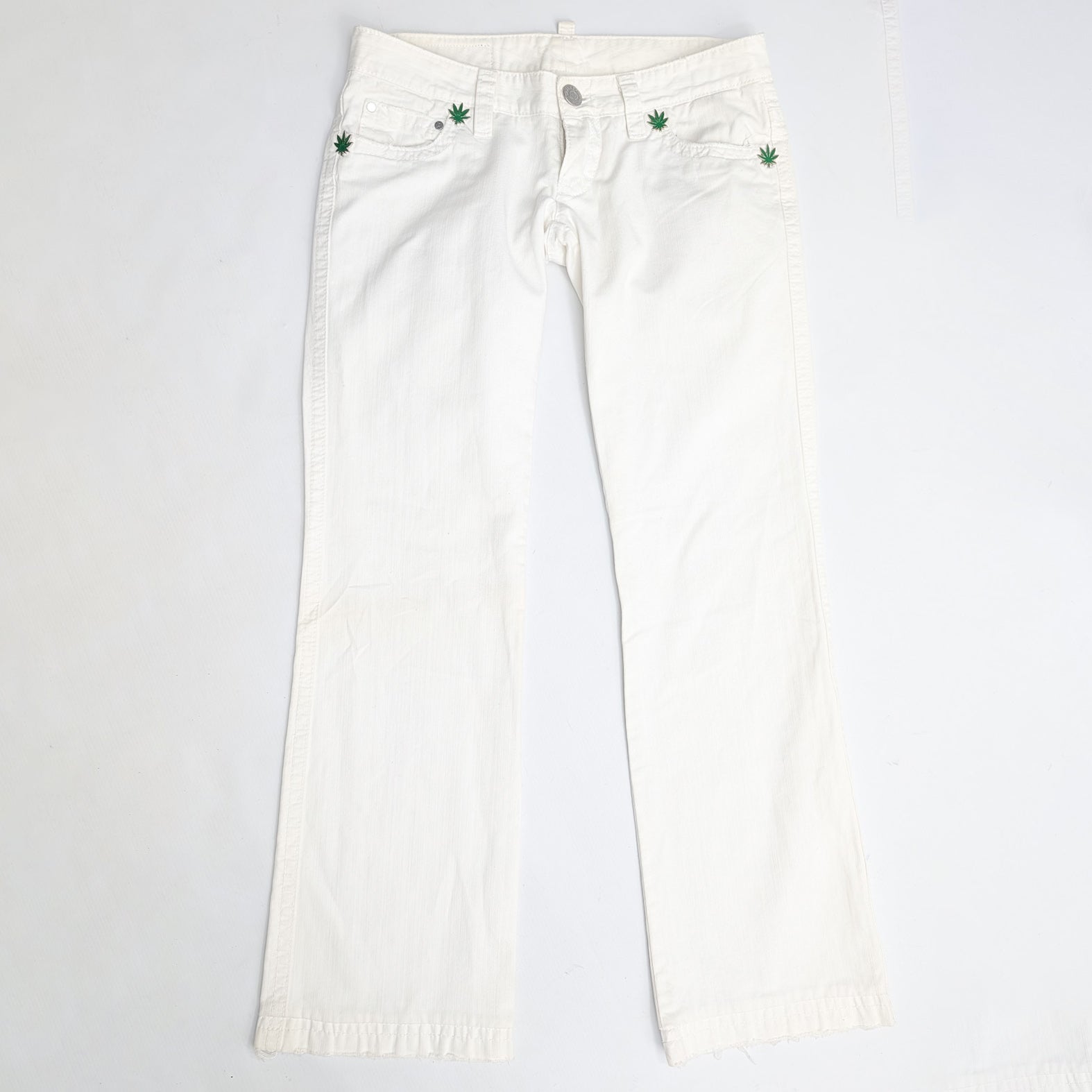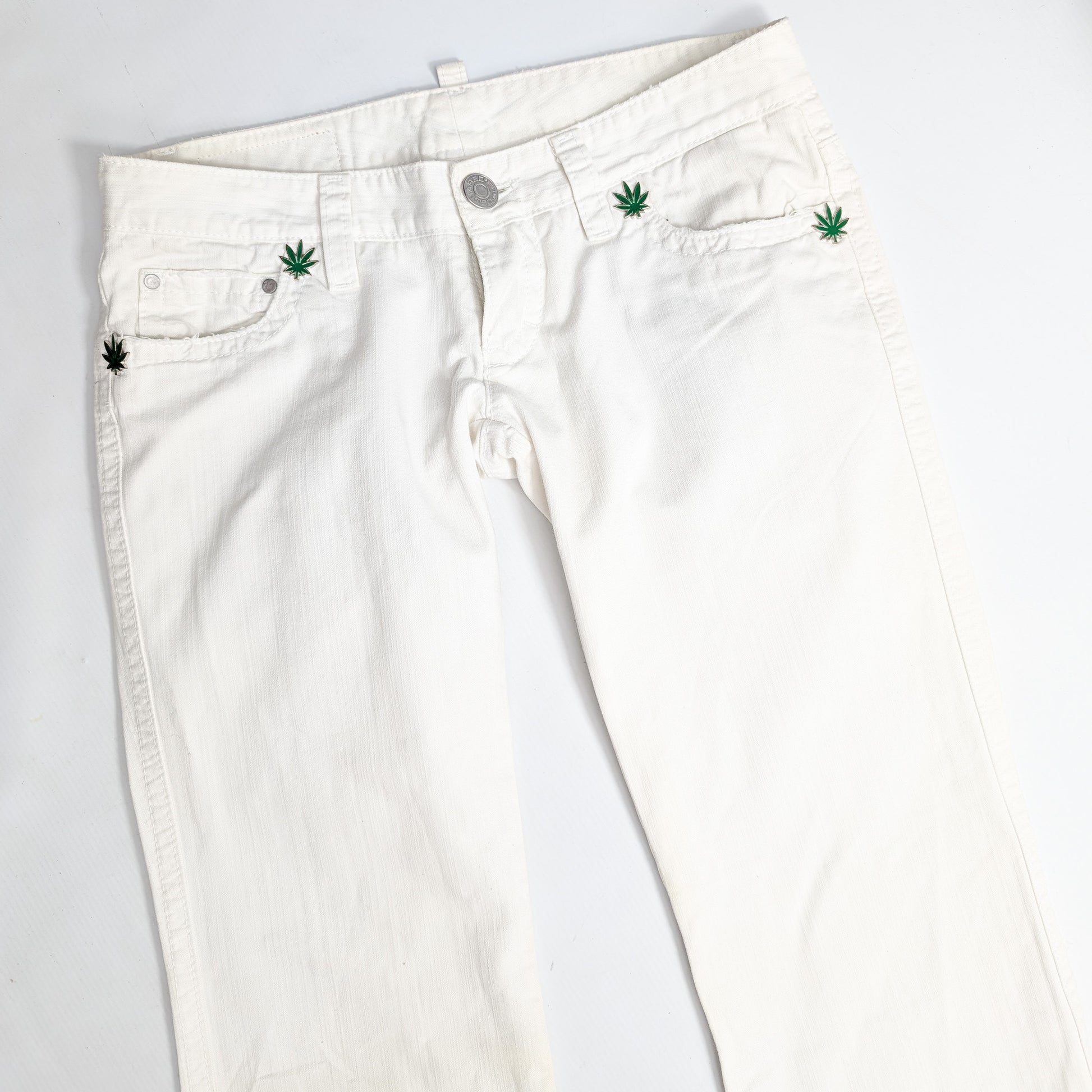 Item: Pantalon jeans taille basse blanche ornée de pin's "Cannabis" "Dsquared2'.
